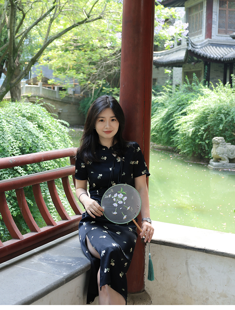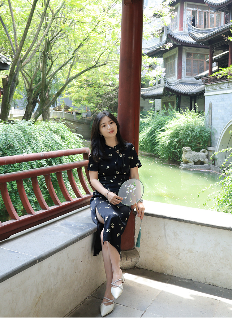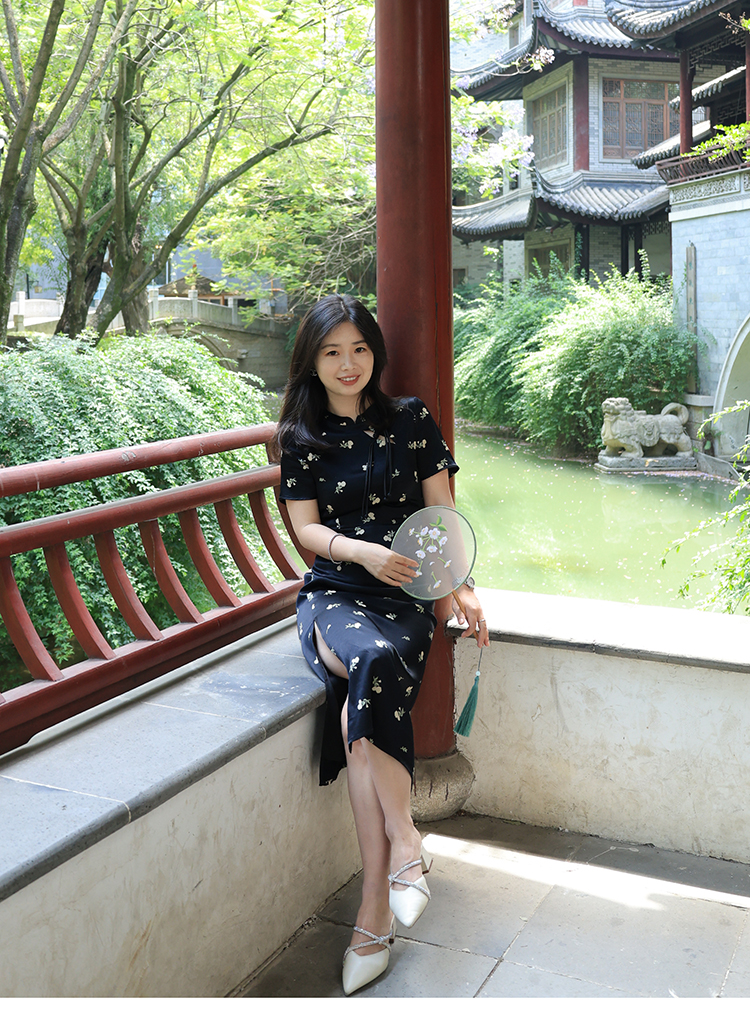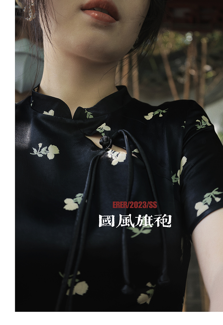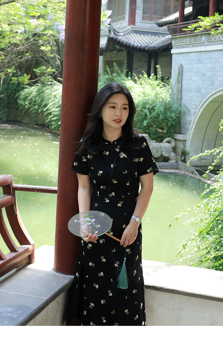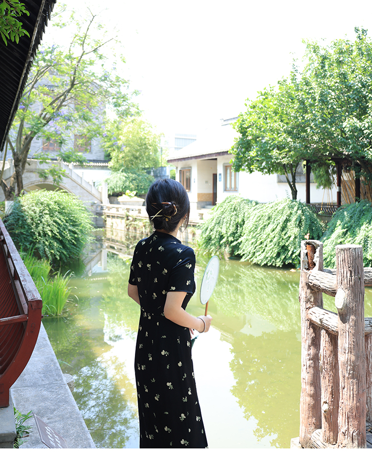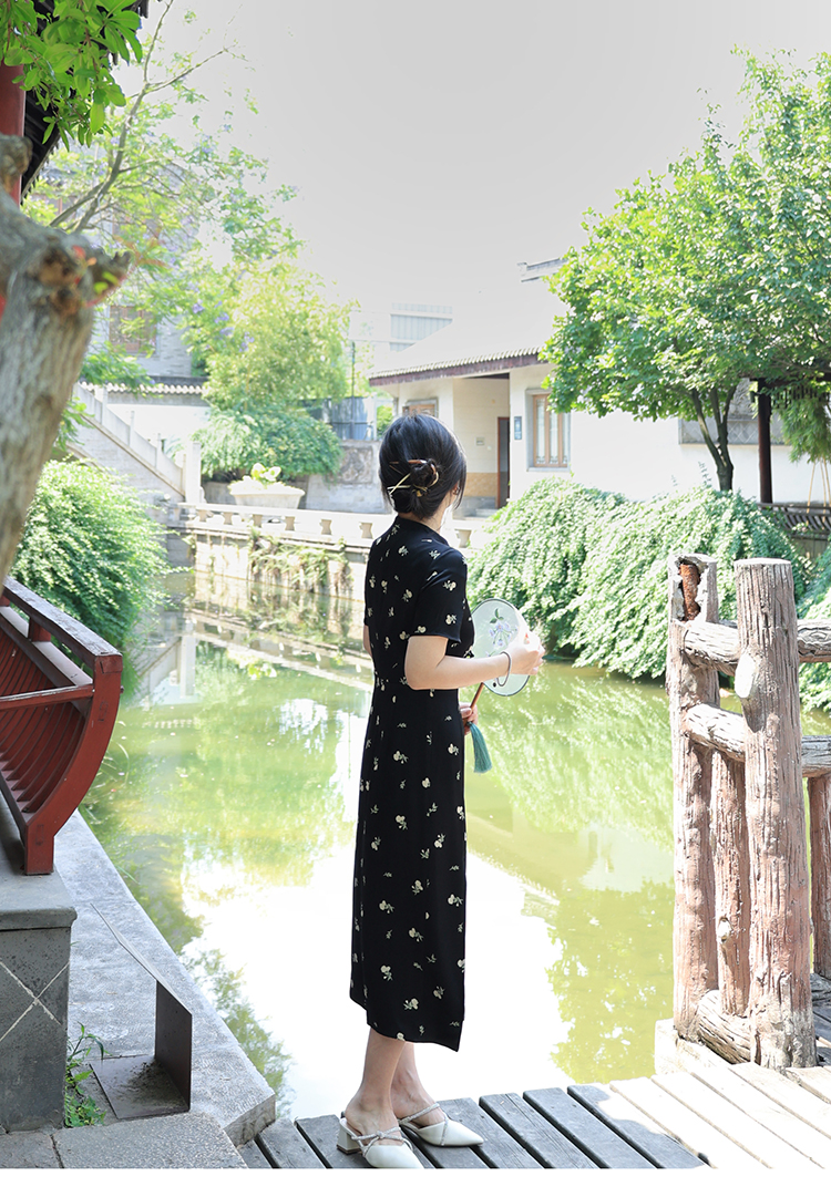 小個子旗袍休閑通勤連衣裙優雅長裙爾爾自制夏季黑色碎花裙子