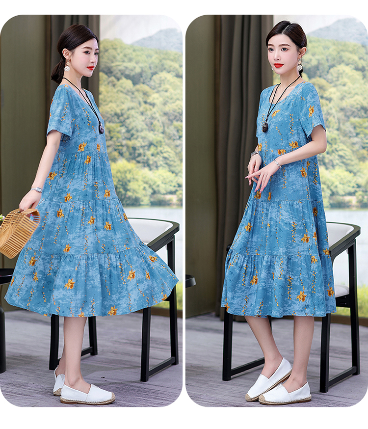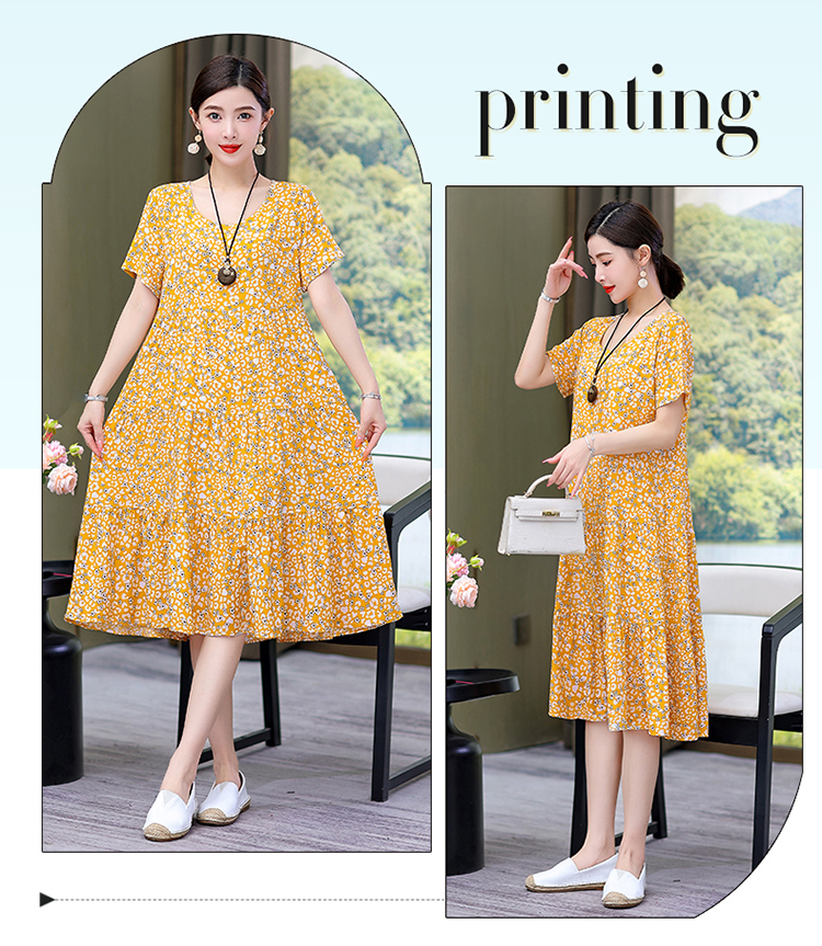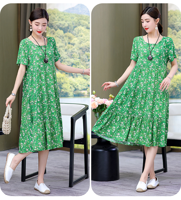 連衣裙女夏季新款印花拼接寬松大碼遮肚子顯瘦胖mm過膝薄款a字裙
