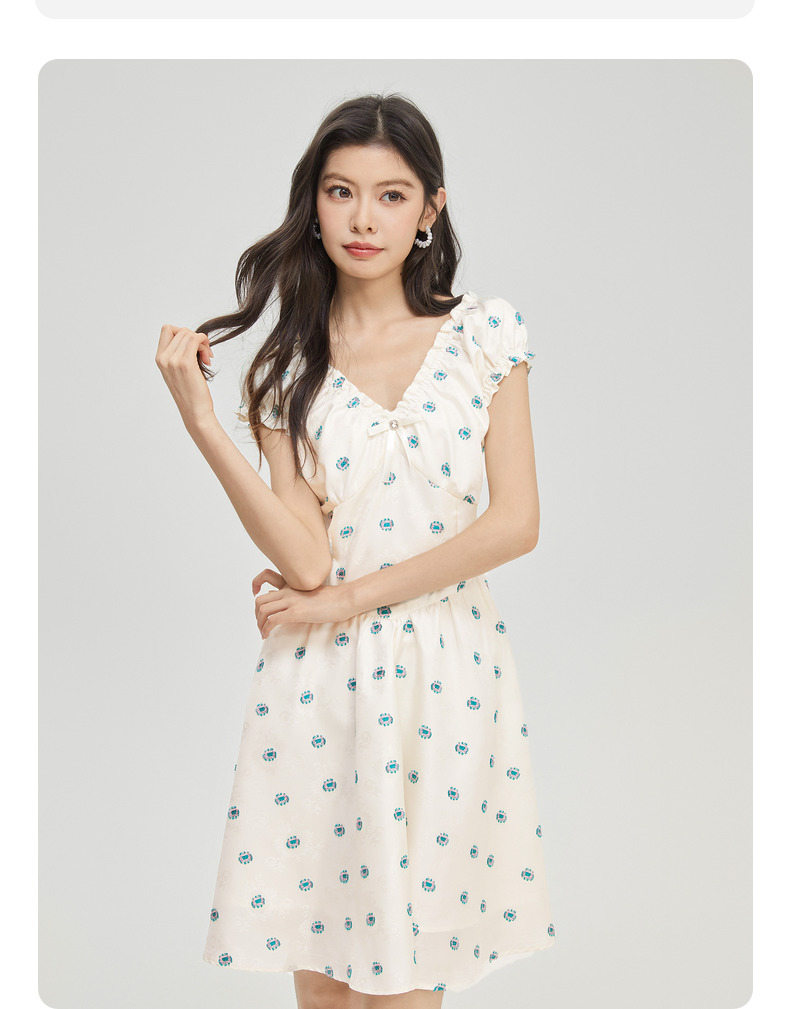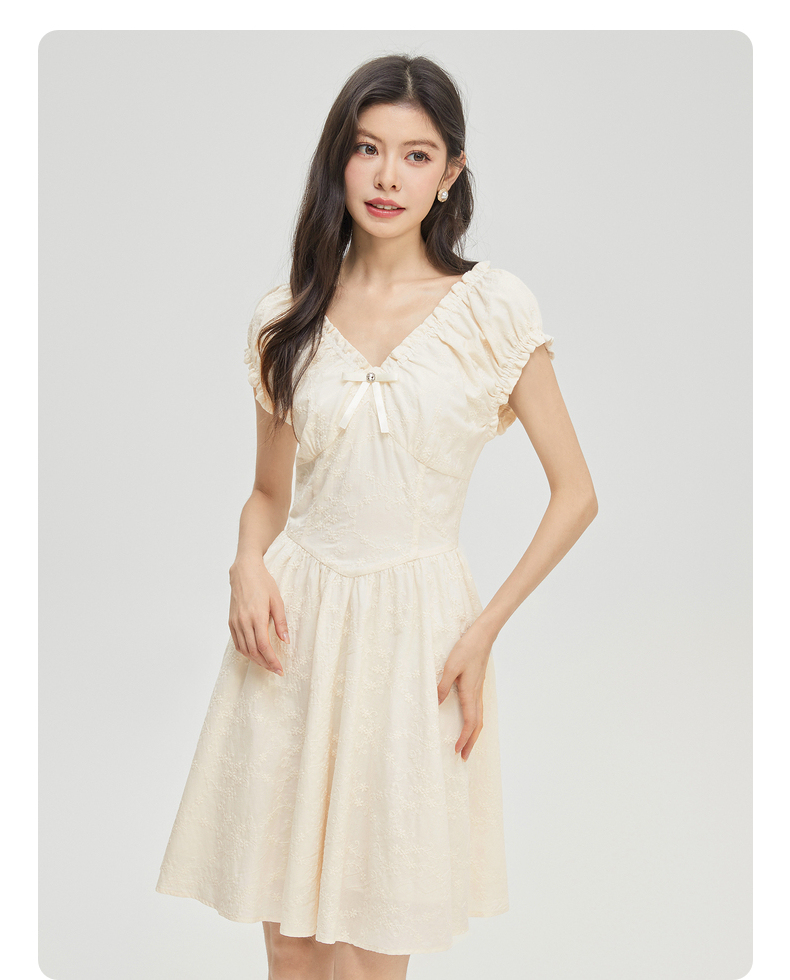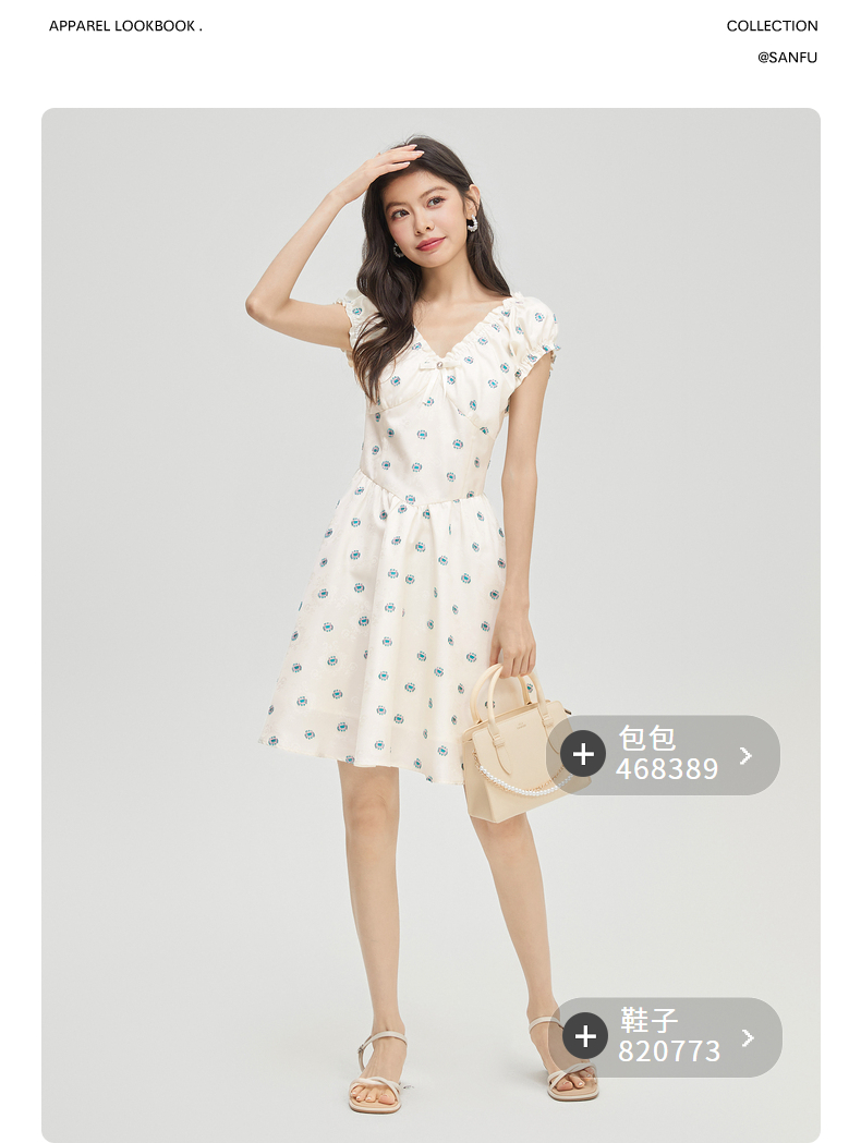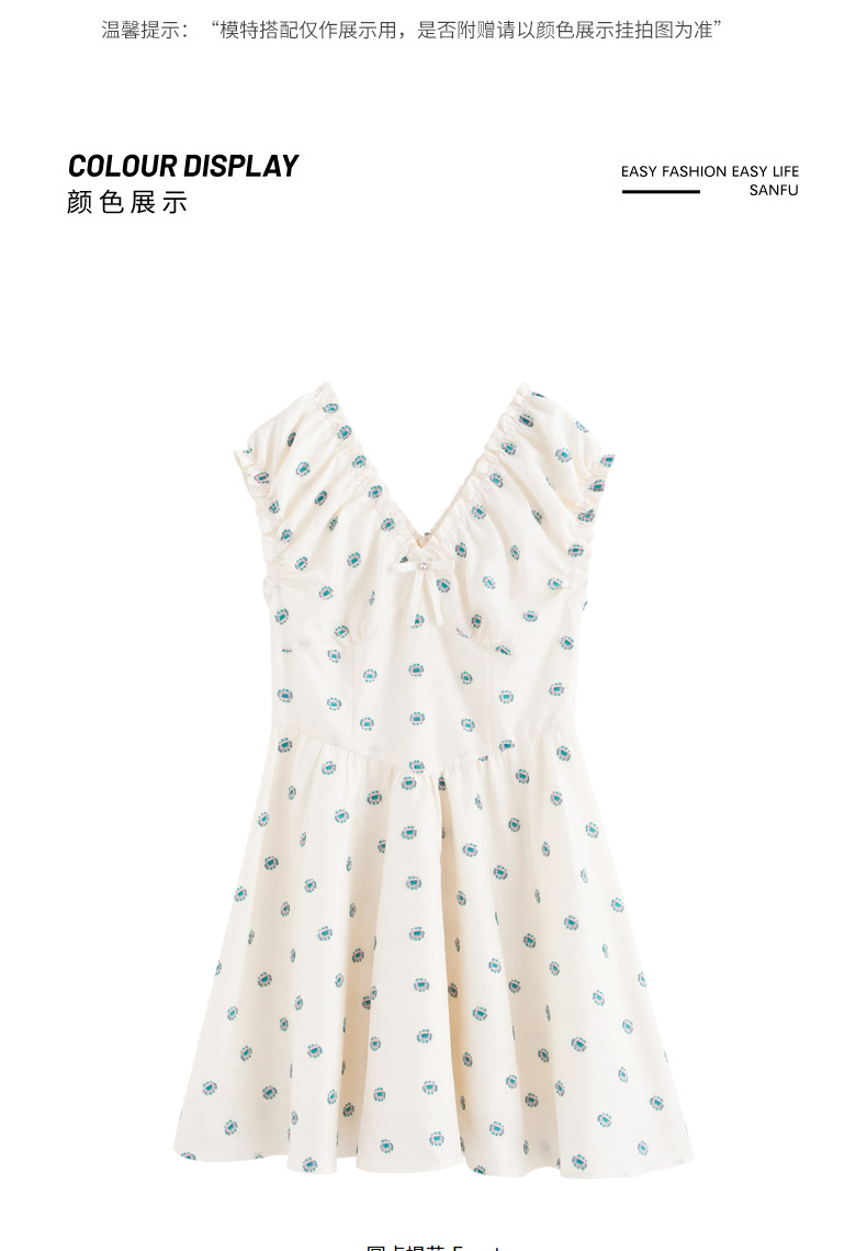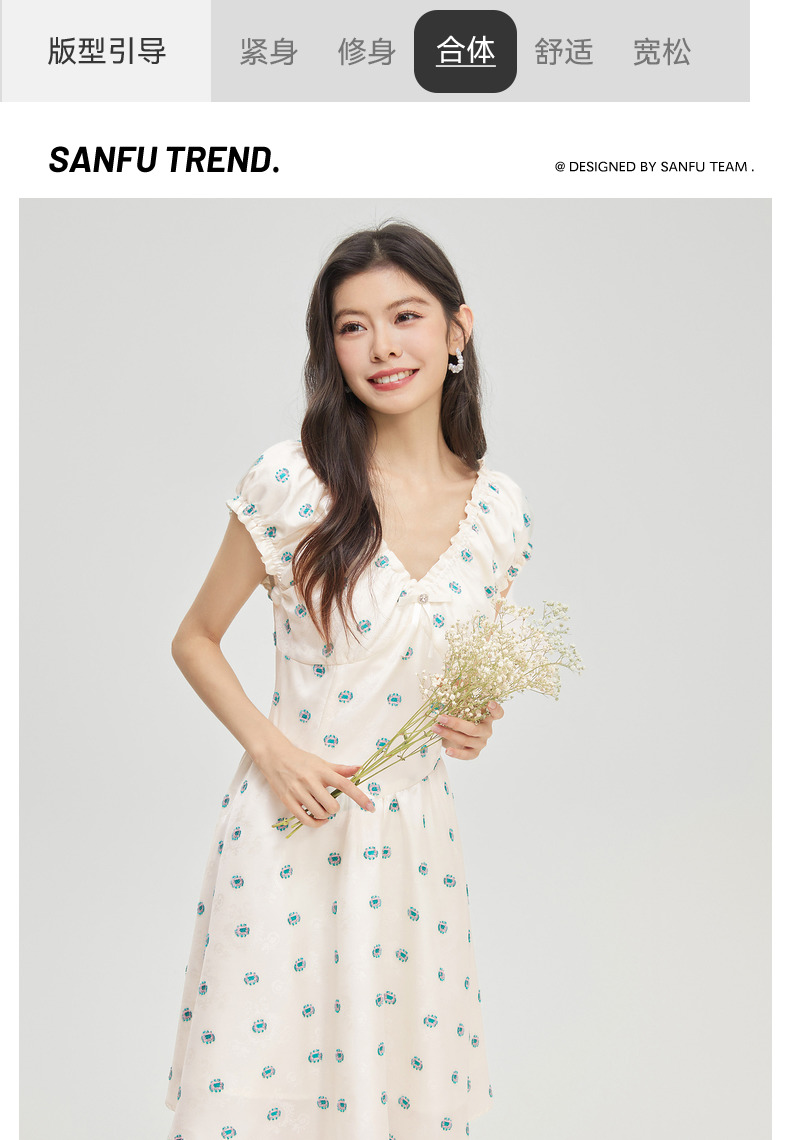 三福連衣裙2023新款夏季V領肌理感收腰時尚法式氣質裙子女471662