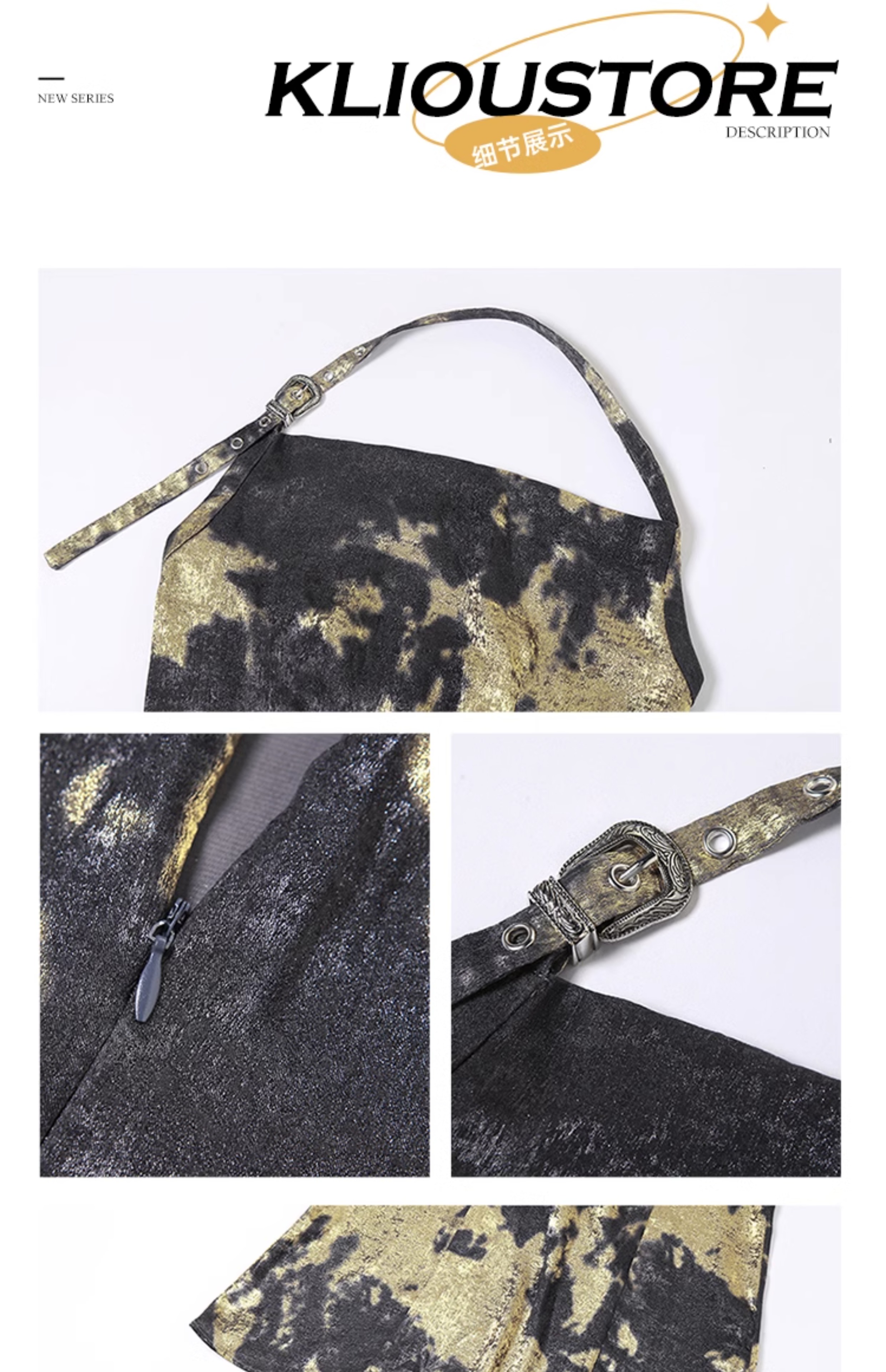 怪誕女孩 時尚復古印花露背掛脖連衣裙氣質收腰修身開叉包臀裙潮