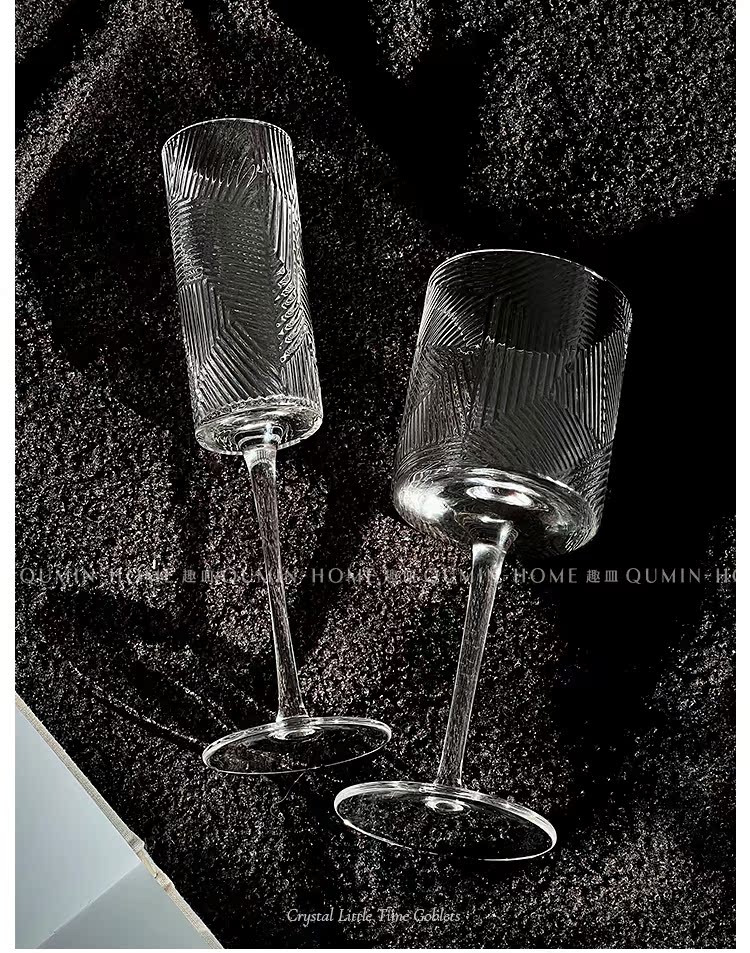 Qumin 直筒高腳杯小眾復古浮雕玻璃杯高級感葡萄酒杯透明紅酒杯子