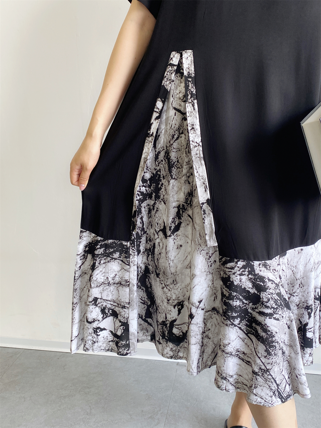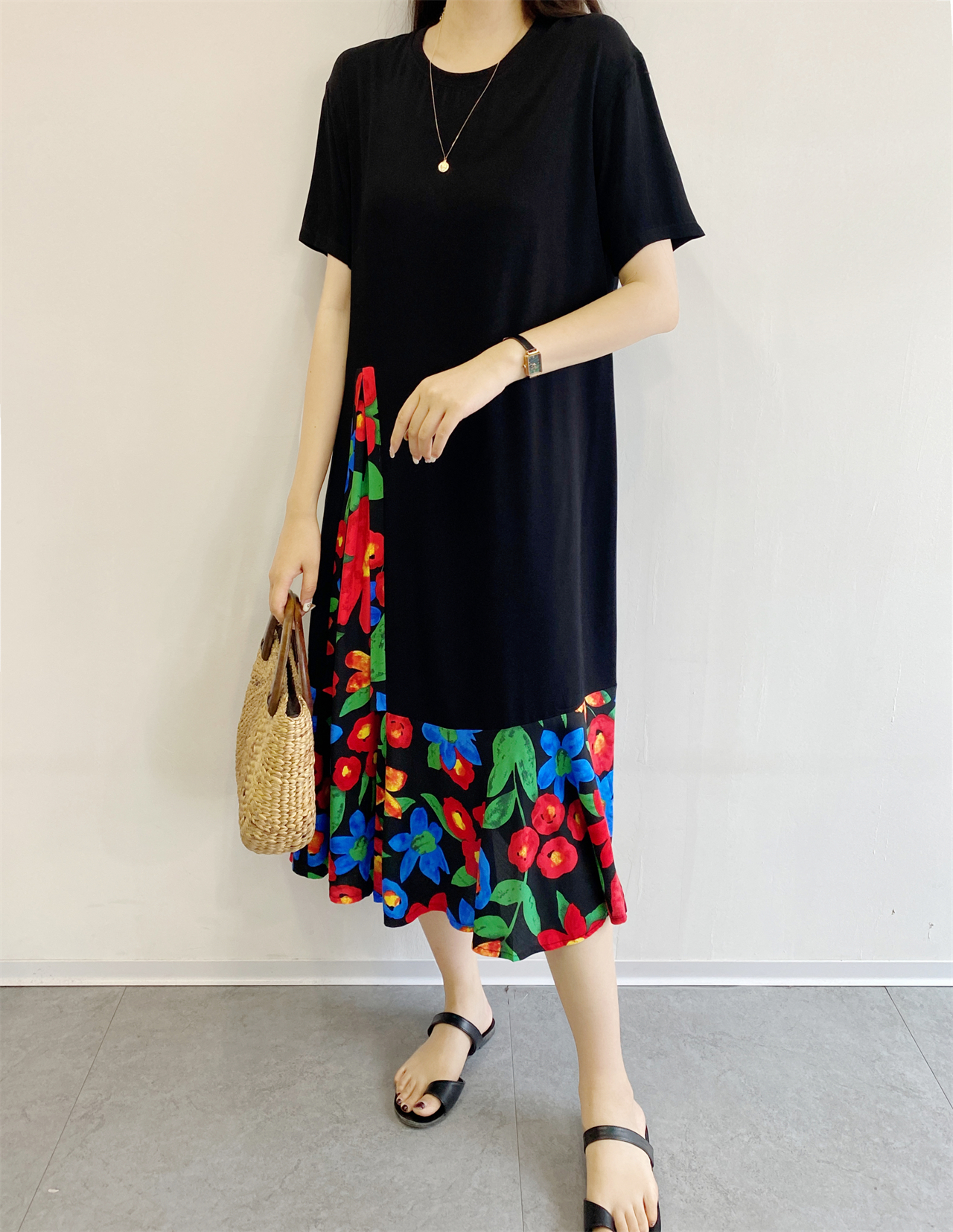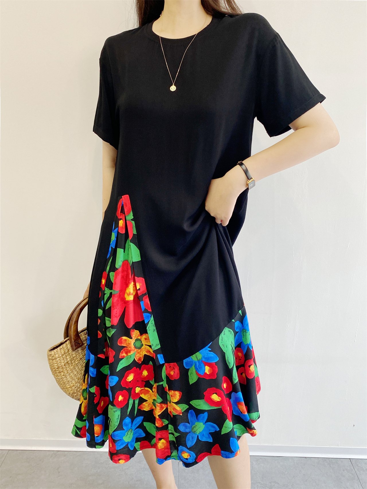 夏季棉綢連衣裙女新款時尚氣質人造棉小眾寬松大碼大裙擺拼接長裙
