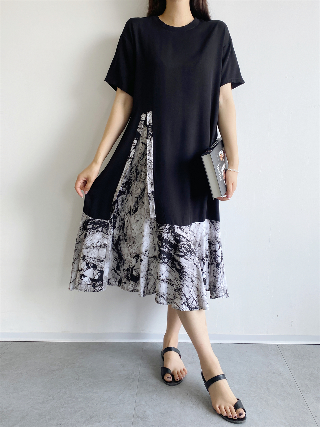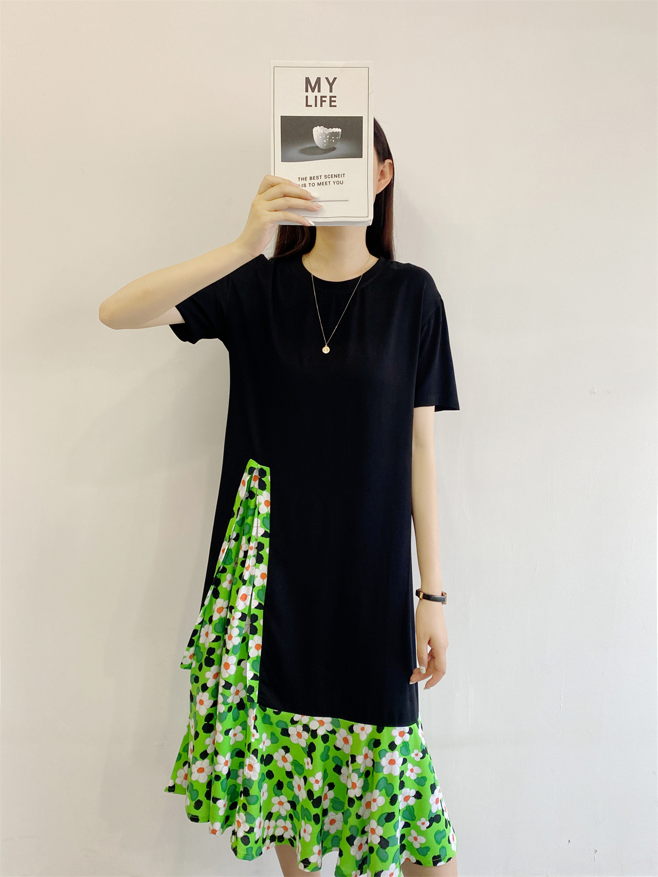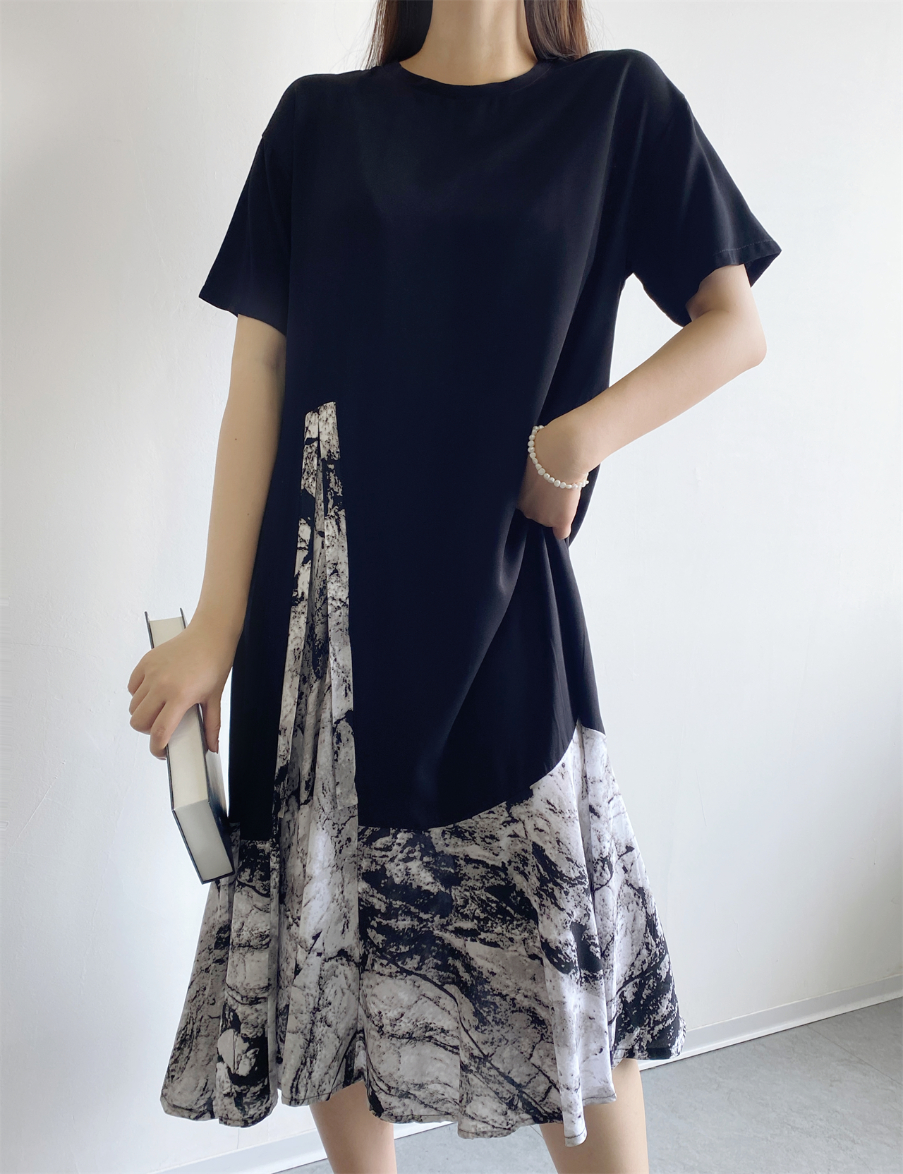 夏季棉綢連衣裙女新款時尚氣質人造棉小眾寬松大碼大裙擺拼接長裙