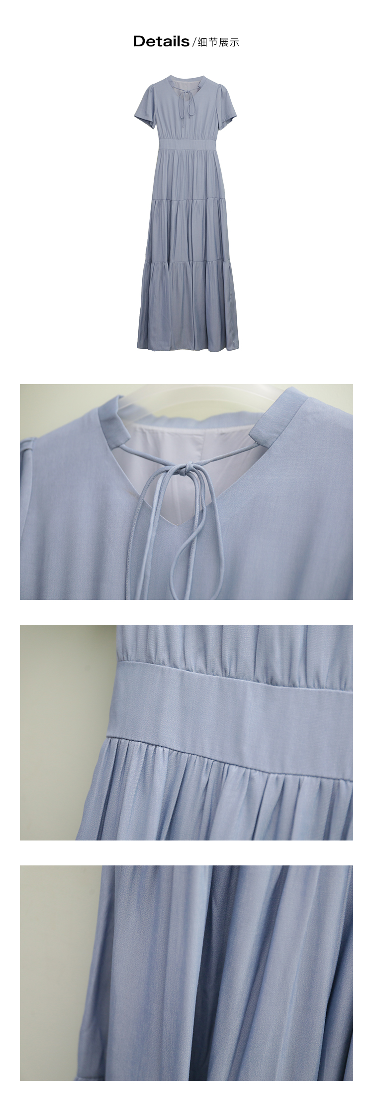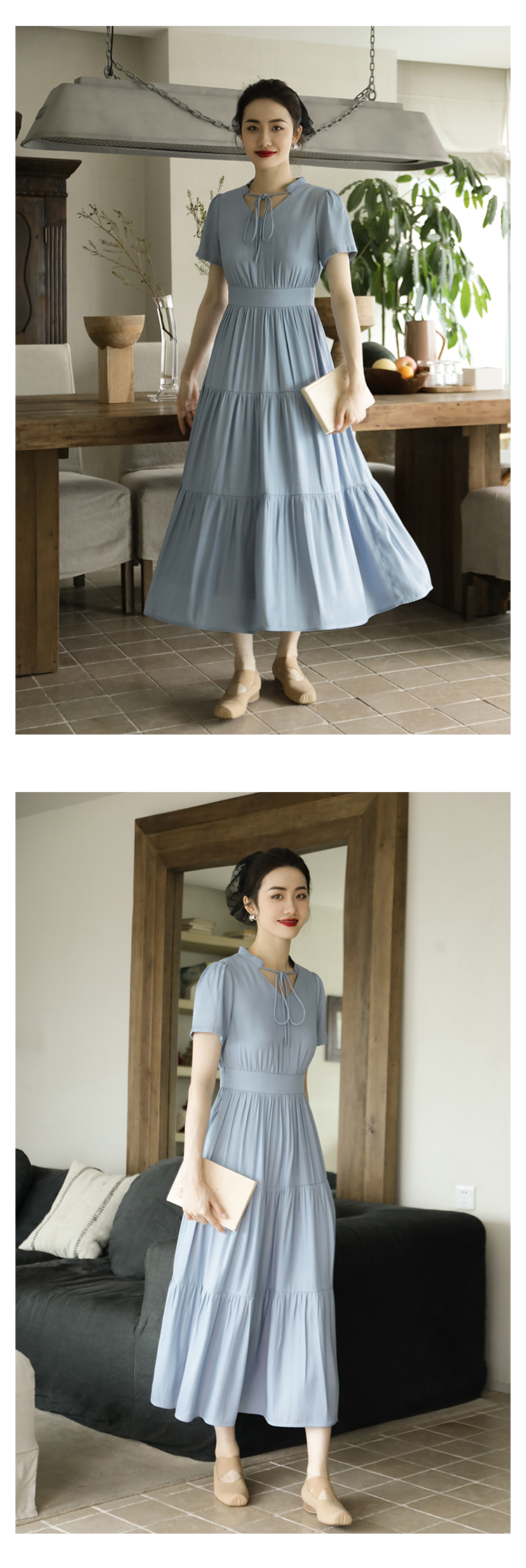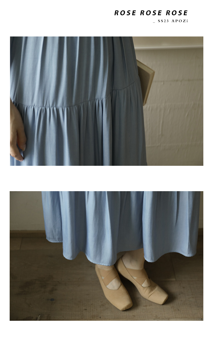 APOZi 2023夏季新款仲夏系列連衣裙水霧藍雙層領純色套頭拼接高腰