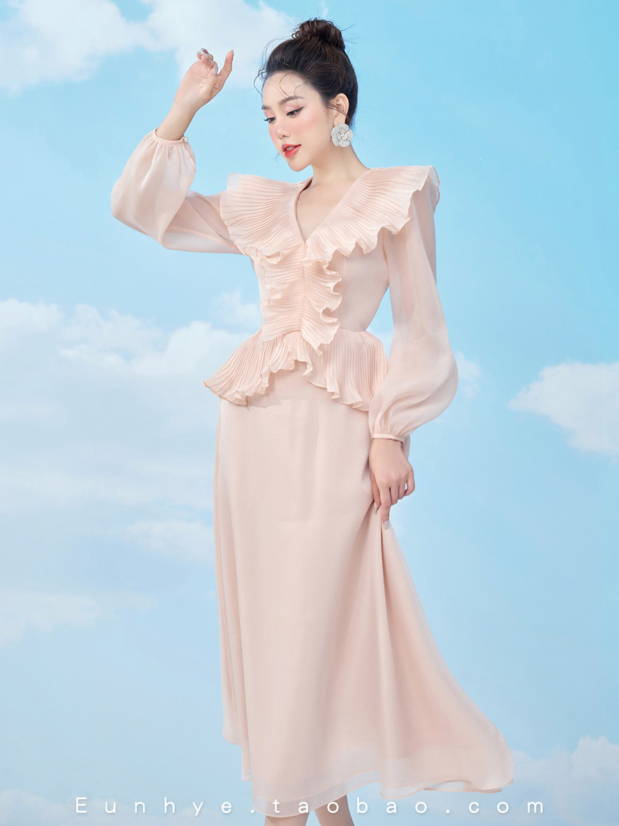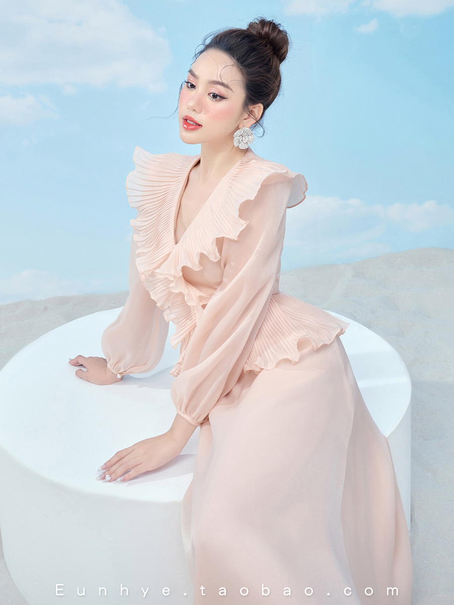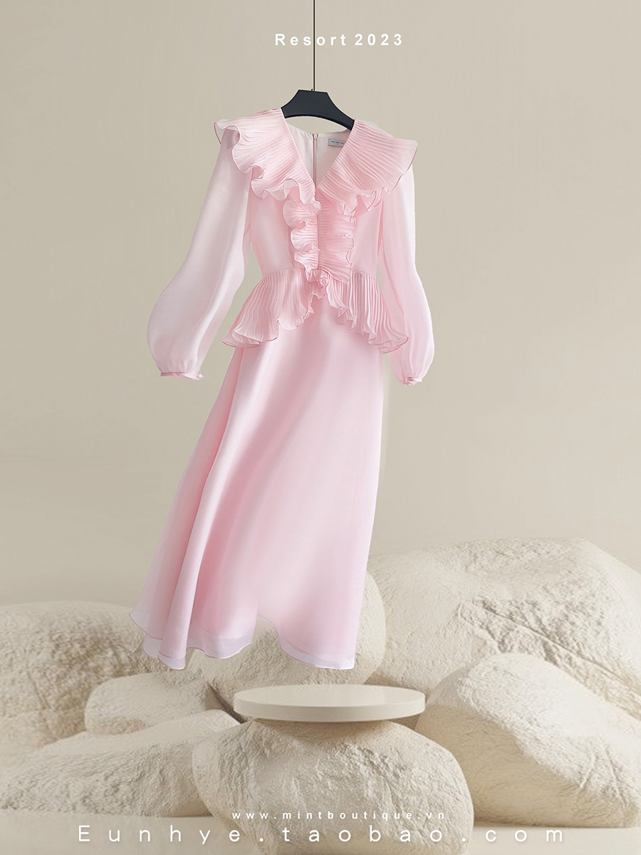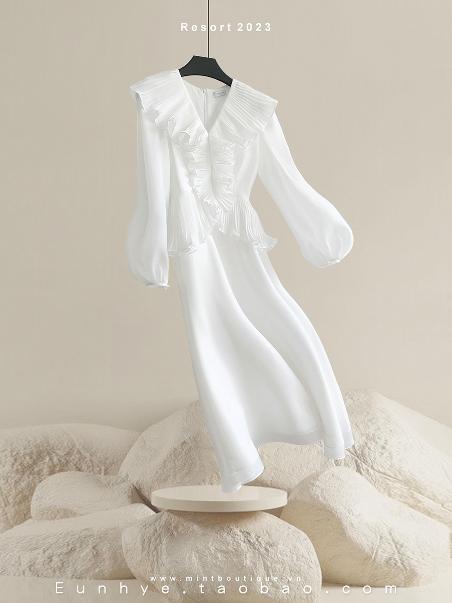 越南小眾設計師MINT 2023年夏季新款輕盈薄紗甜美木耳邊連衣裙