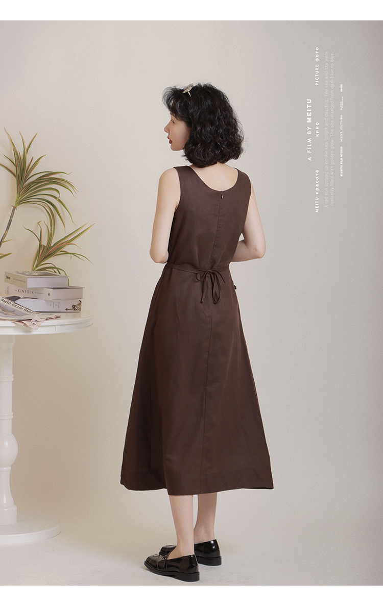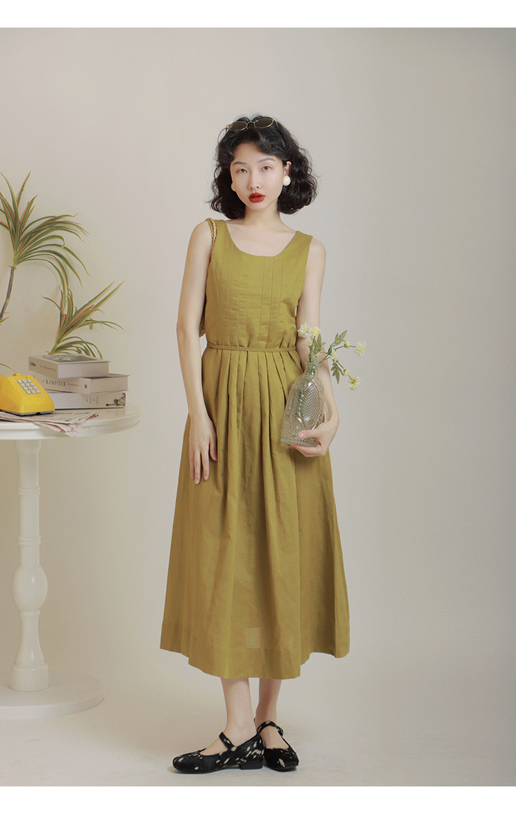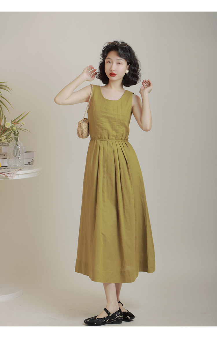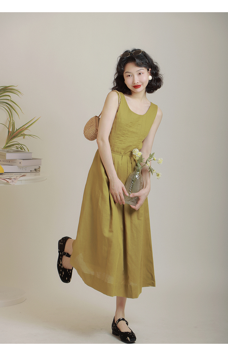 IVY YANG 定制款復古綁帶背心連衣裙圓領無袖長裙簡約優雅夏裝女