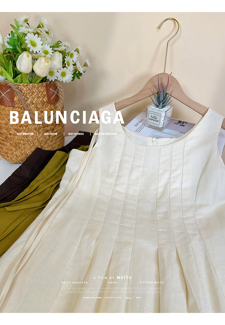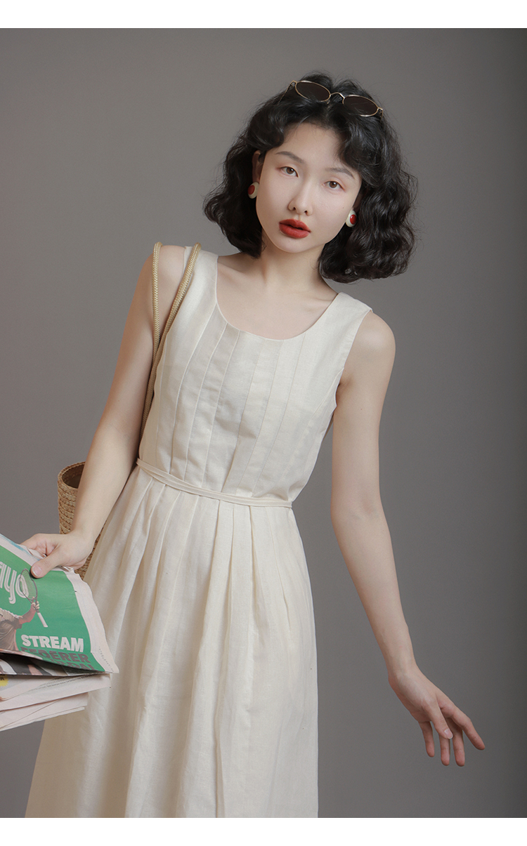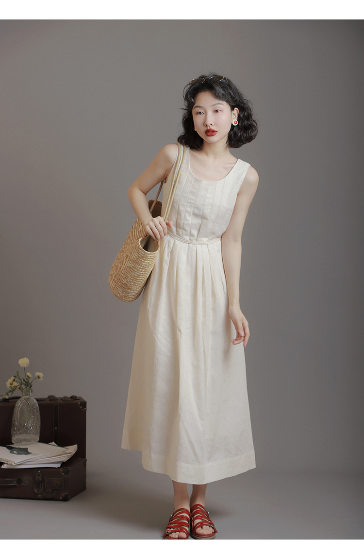 白色亞麻棉麻連衣裙無袖馬甲連衣裙長裙無袖背心法式復古連衣裙