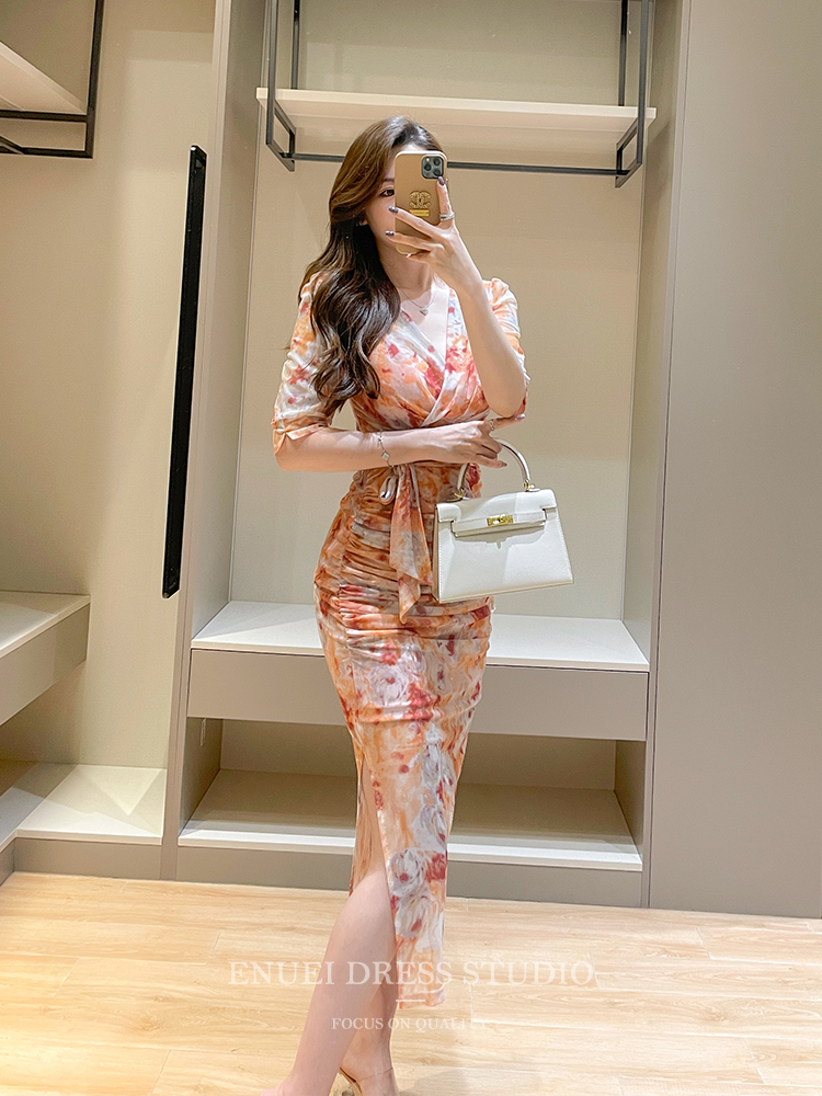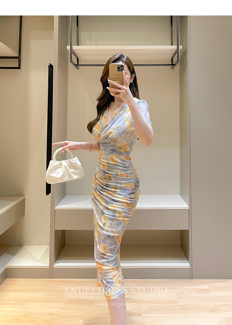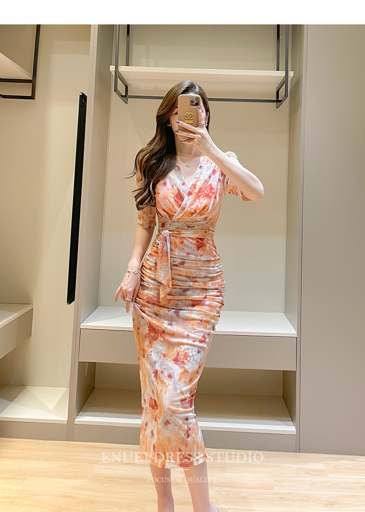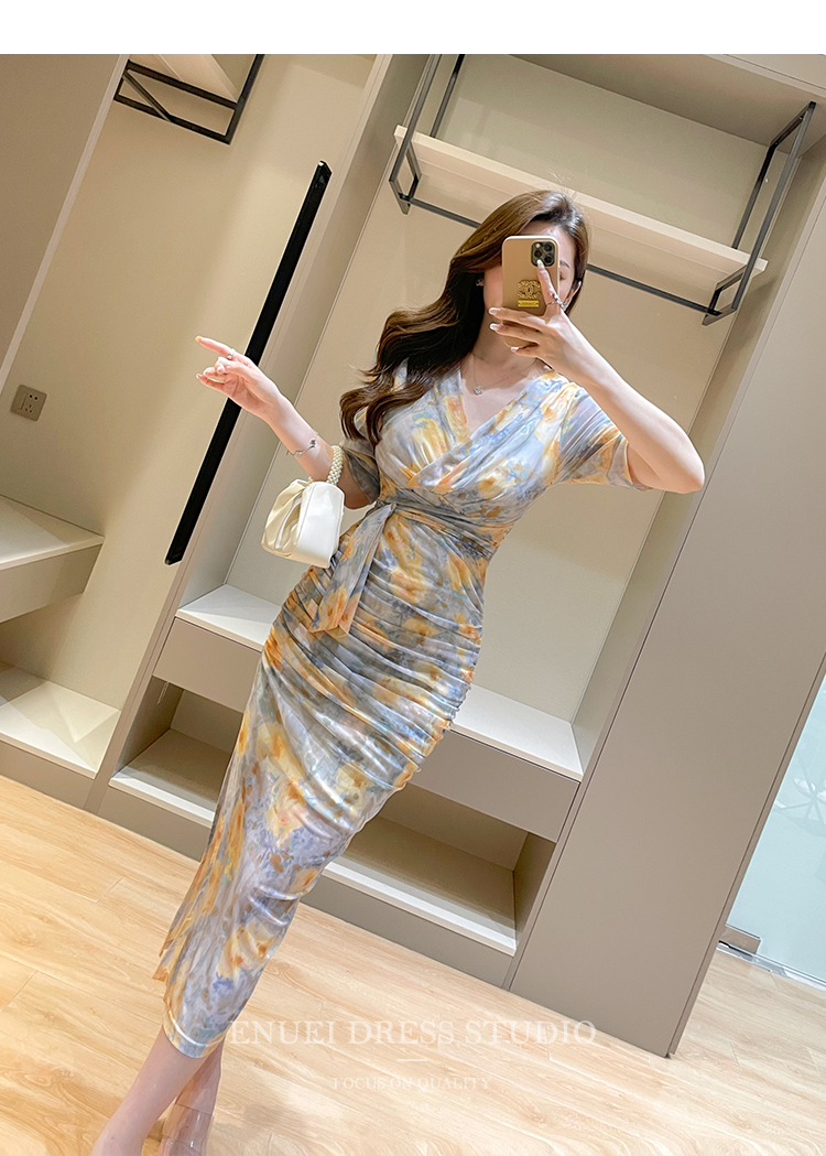 彈力網紗印花連衣裙夏新款氣質洋氣女人味碎花V領褶皺開叉包臀裙