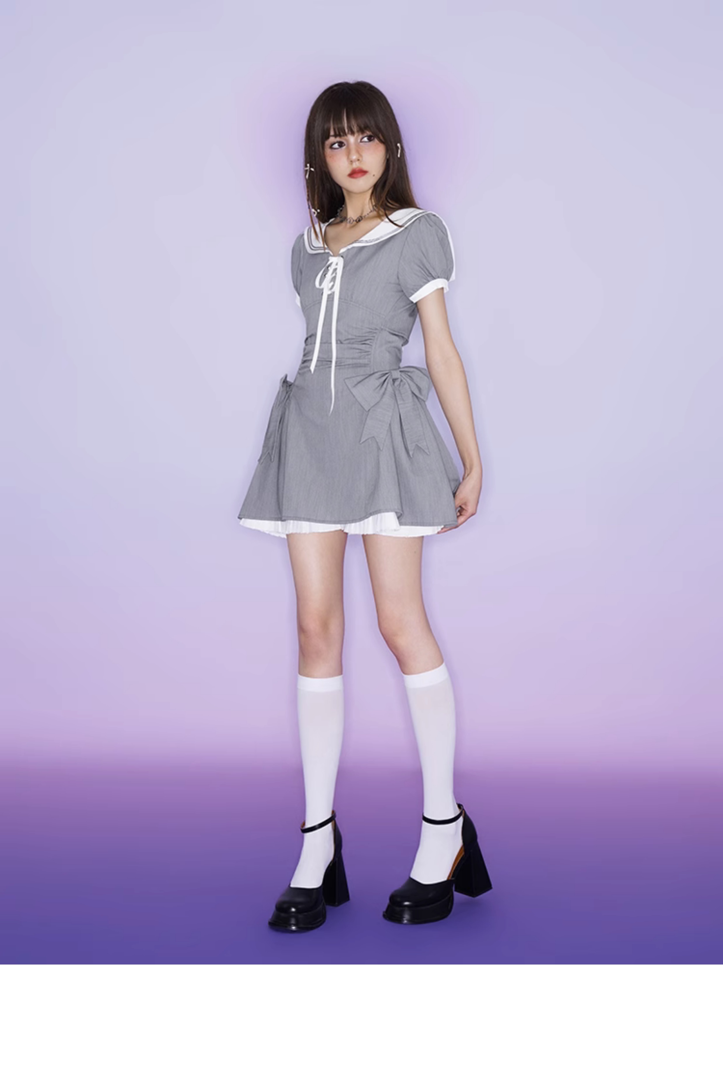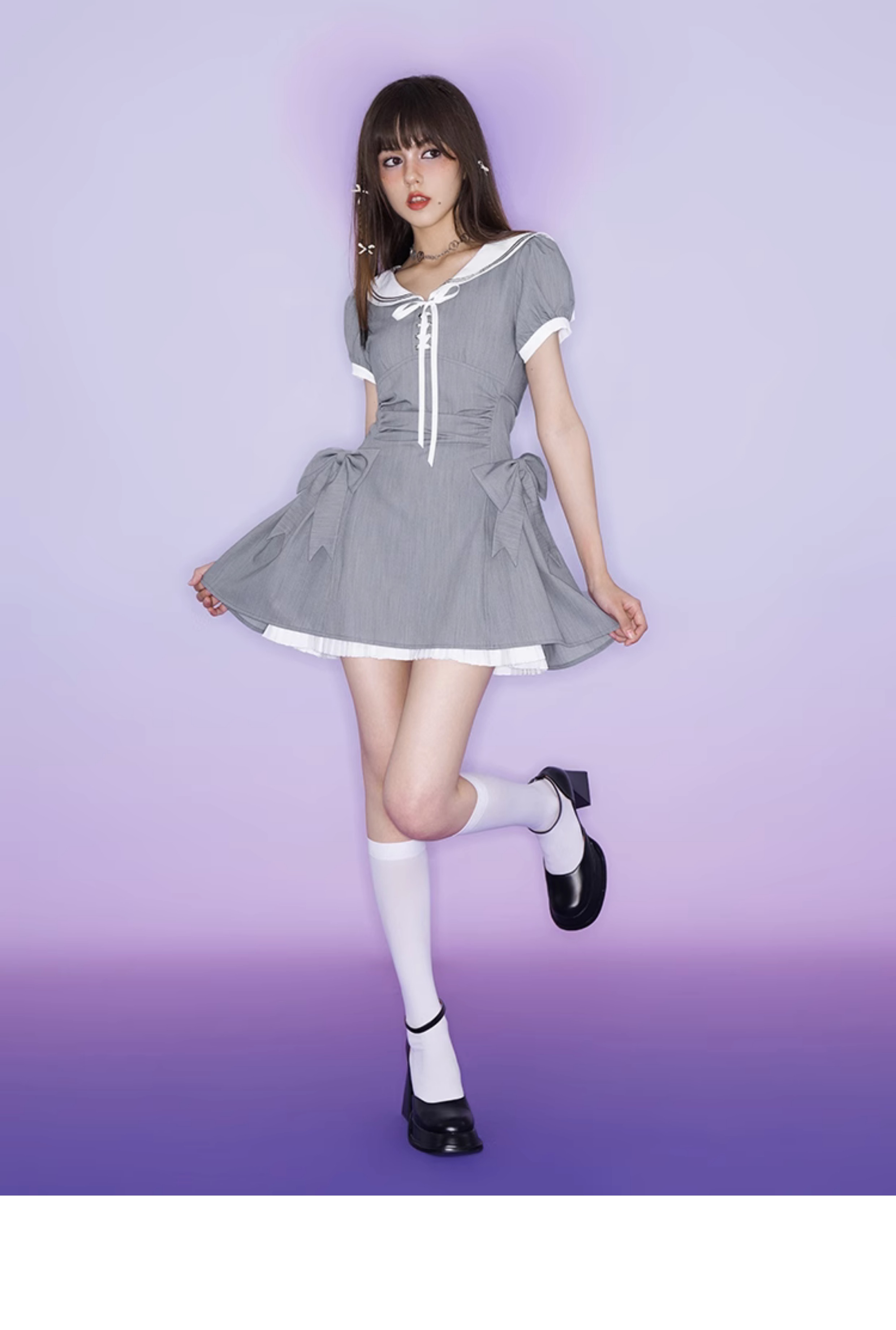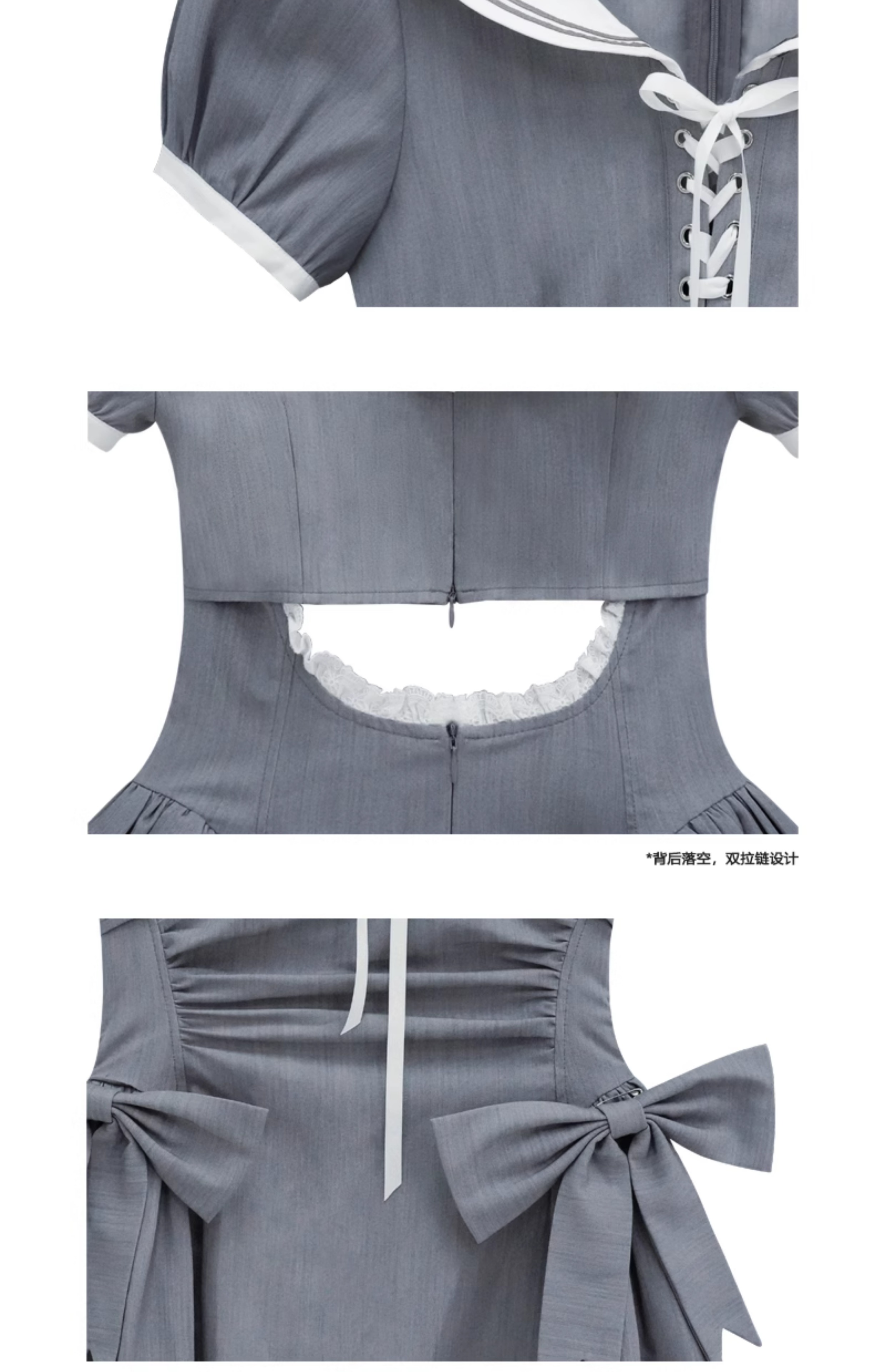 SagiDolls少女斗志遮肚顯瘦!灰色水手領甜酷蝴蝶結收腰露背連衣裙