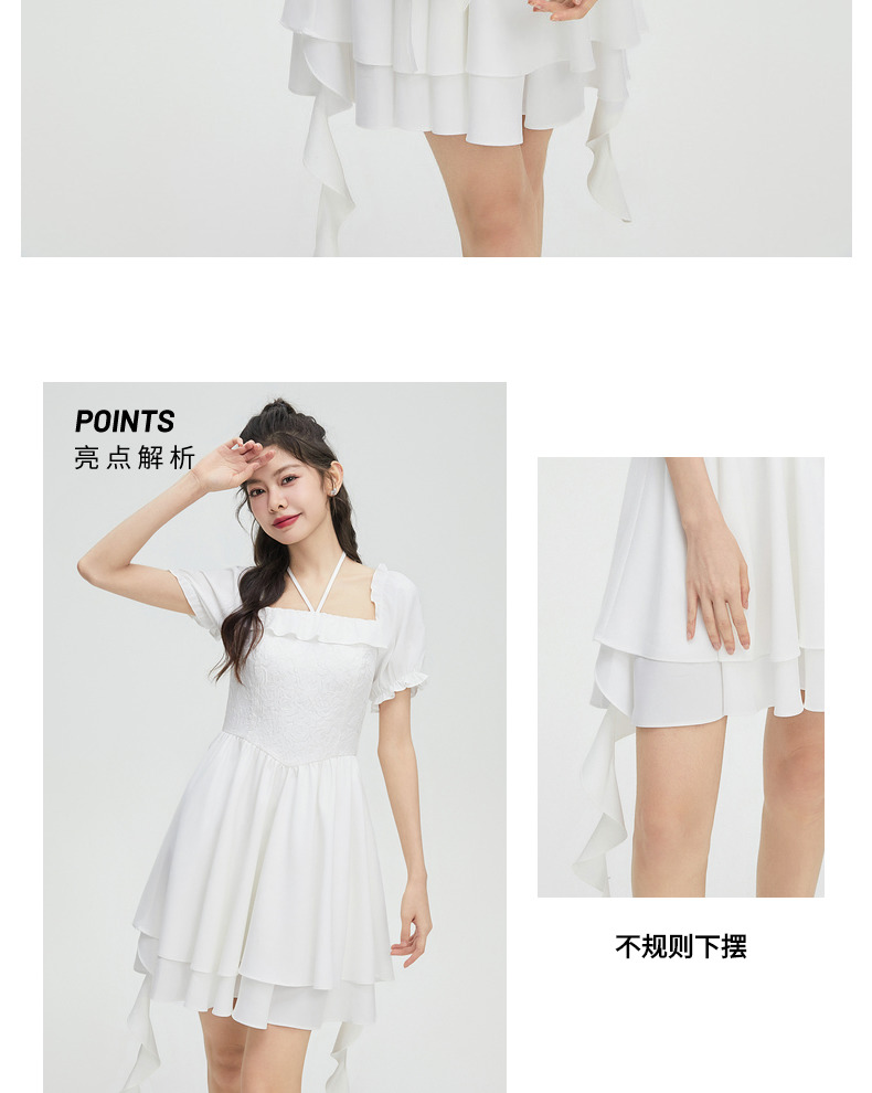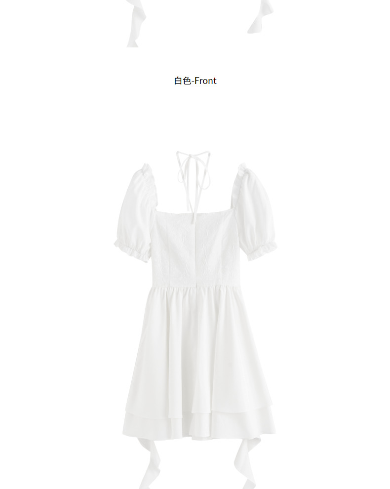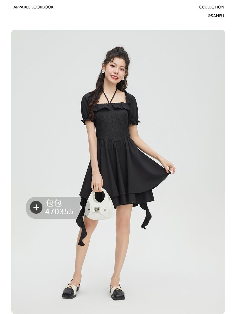 三福連衣裙子夏季2023新款法式氣質花邊收腰泡泡袖短裙女裝472325