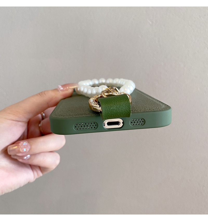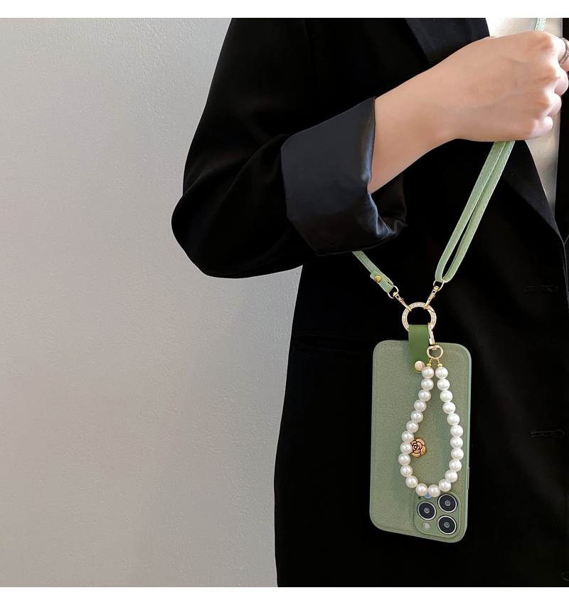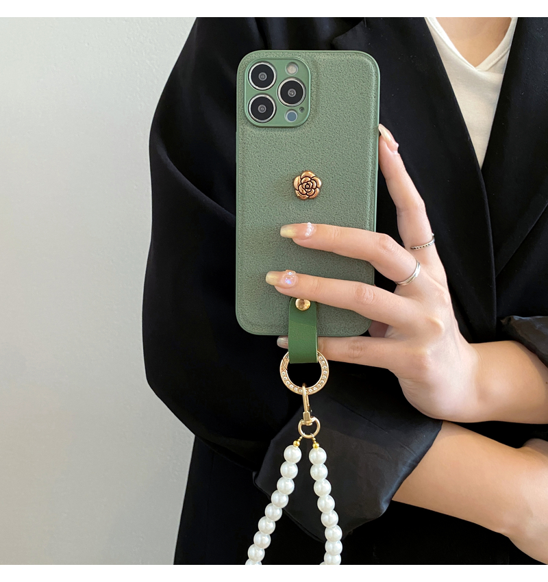 橄欖綠色金屬山茶花適用蘋果14promax手機殼iphone13手提珍珠鏈條12可背帶11斜挎掛繩x/xr/xsmax高級感14plus
