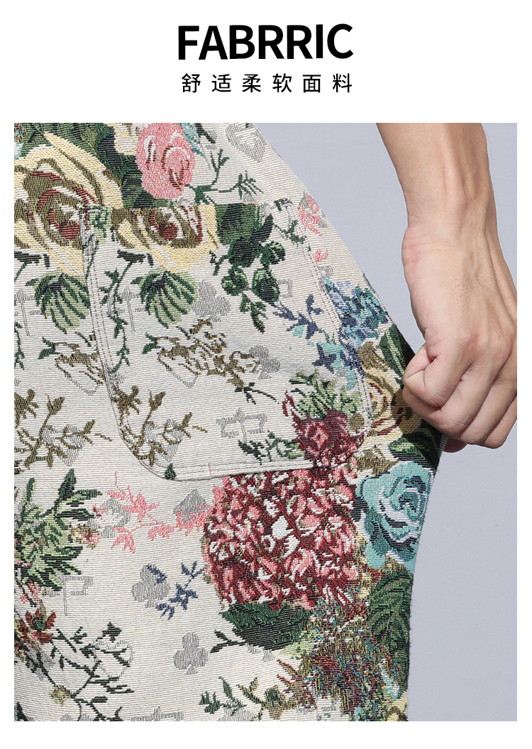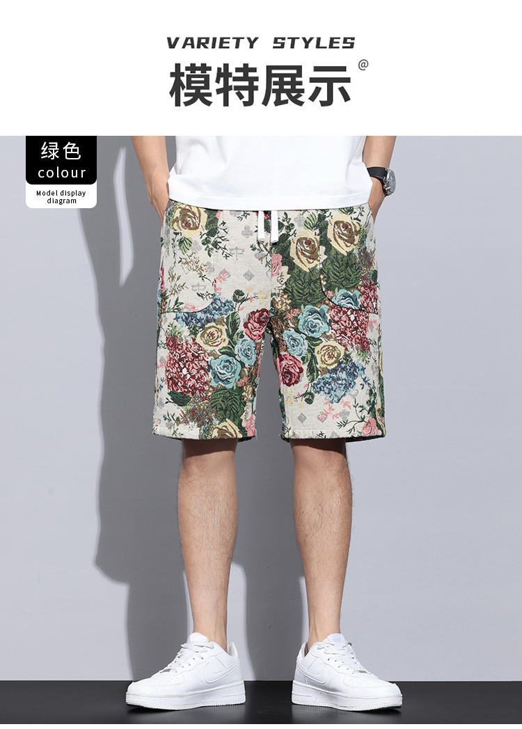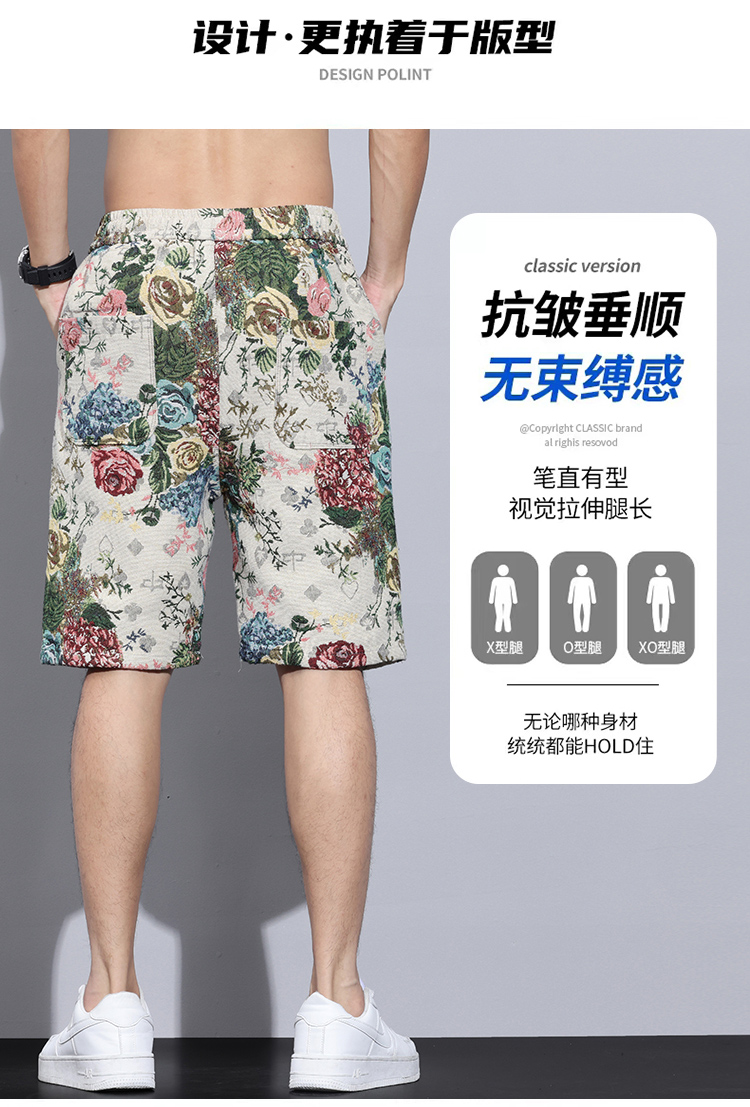 夏季新款彩繪玫瑰休閑短褲男寬松直筒花卉沙灘褲刺繡運動五分褲子