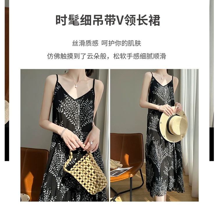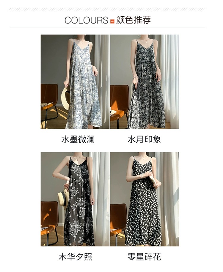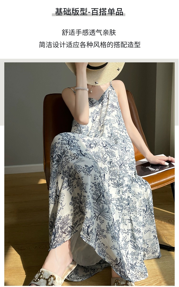 夏季新款印花吊帶連衣裙女雪紡真絲小眾別致獨特氣質高級感長裙子