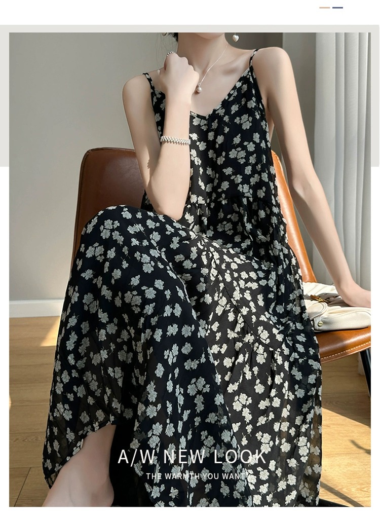 2023夏季新款復古碎花連衣裙女V領百搭寬松顯瘦氣質吊帶裙長裙子