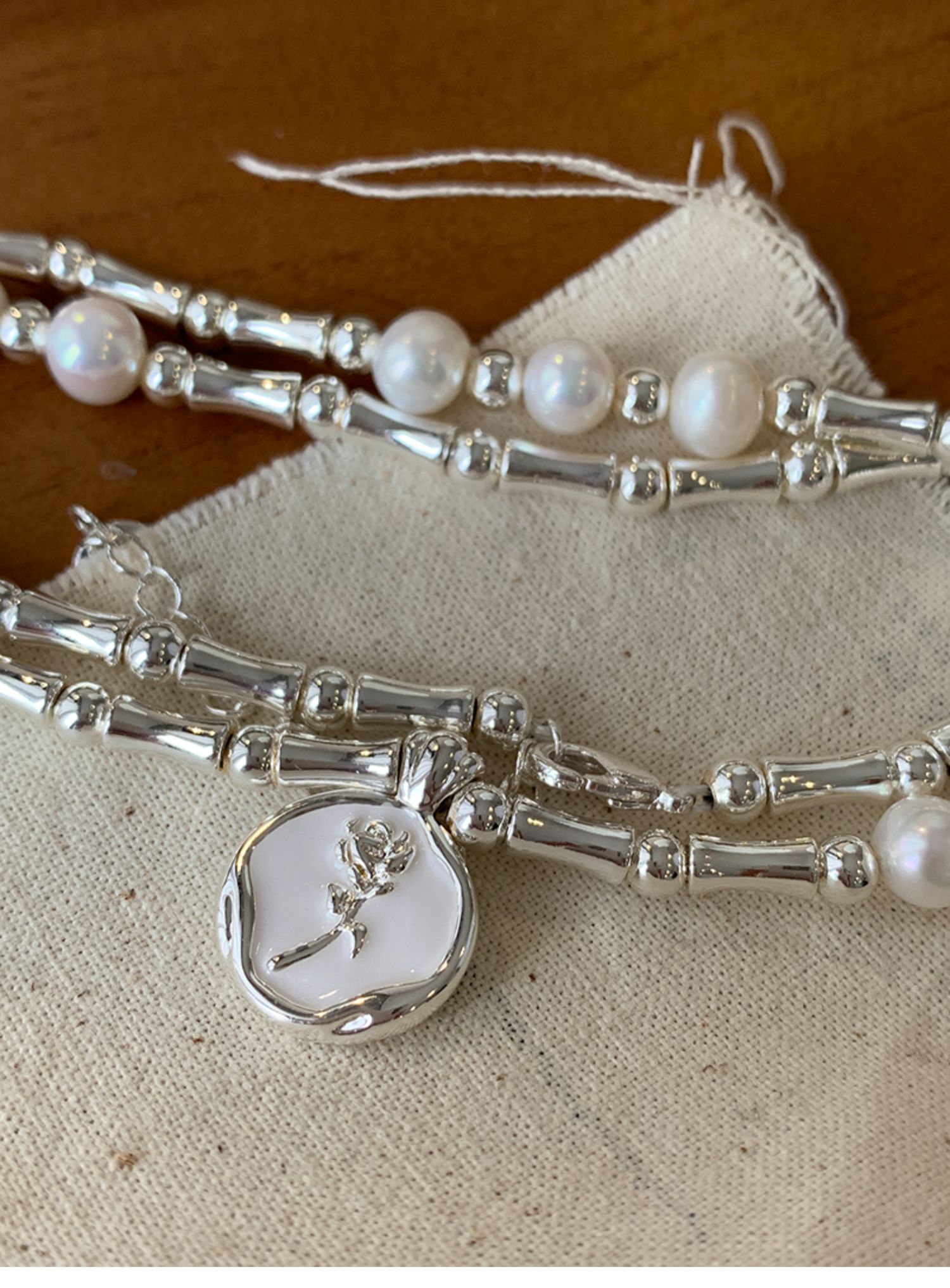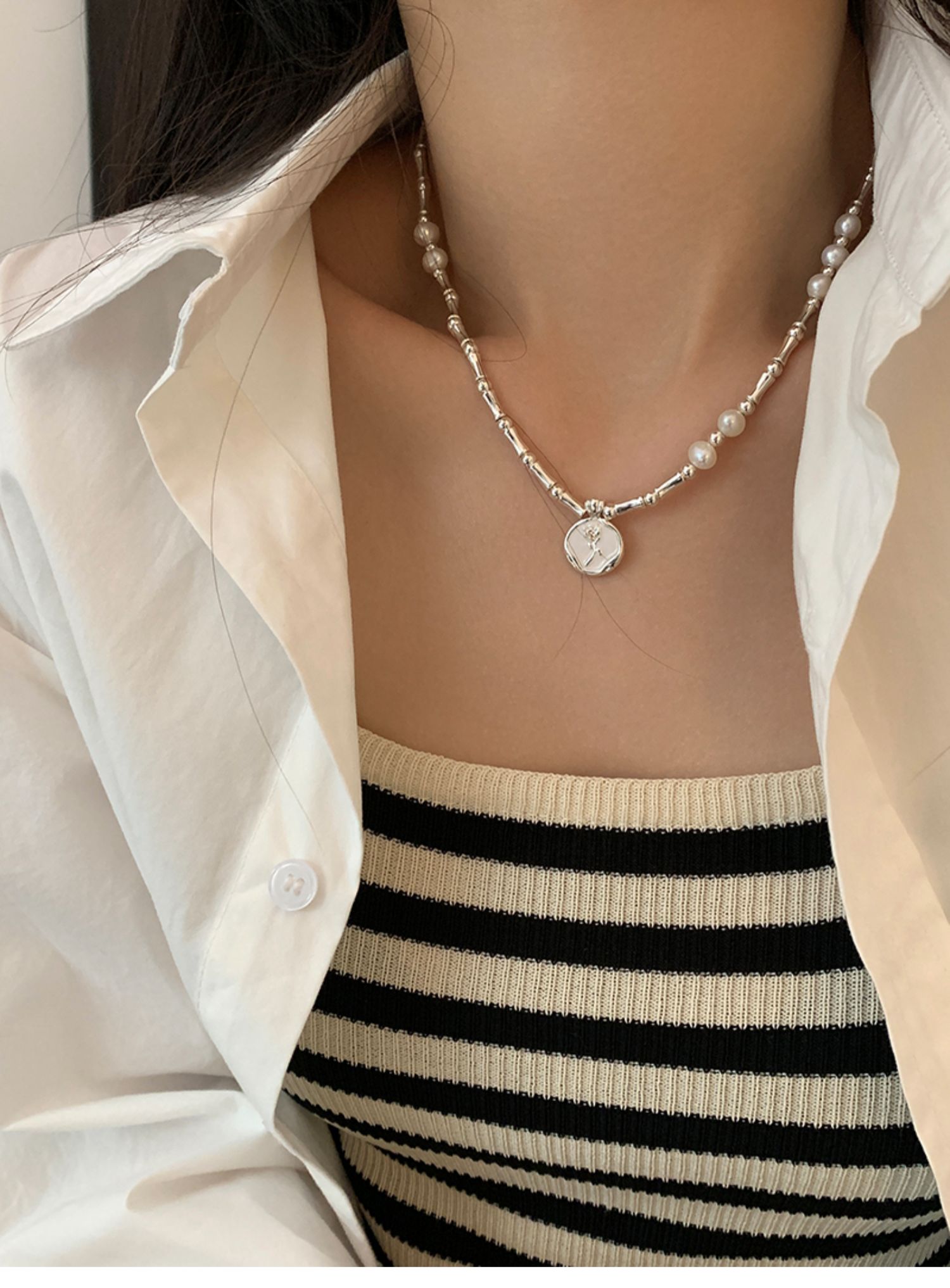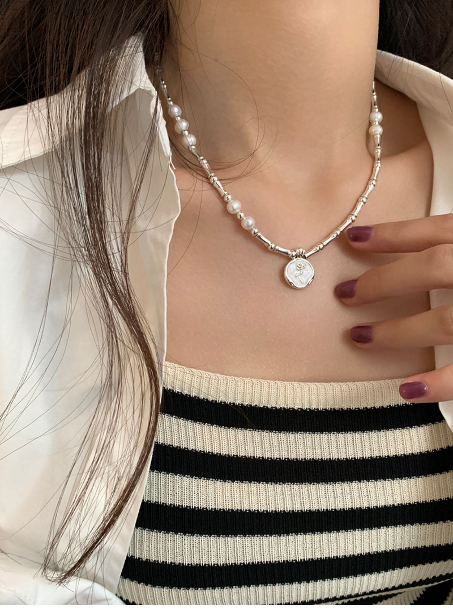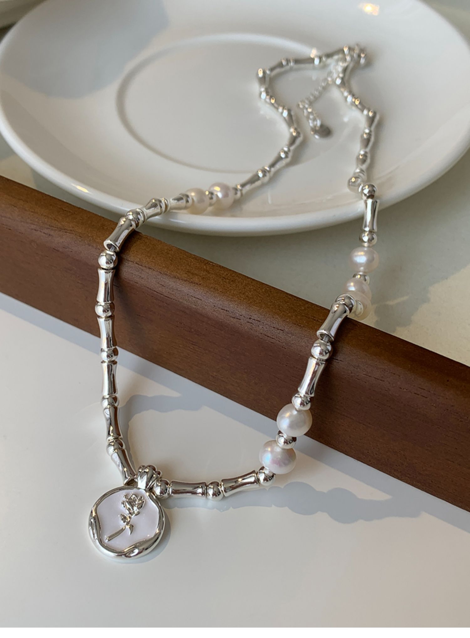 迷度小眾設計白色琺瑯玫瑰花鎖骨鏈天然珍珠項鏈氣質輕奢設計感女