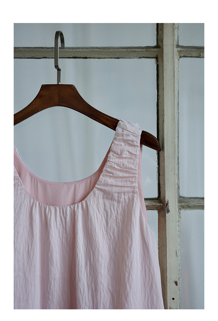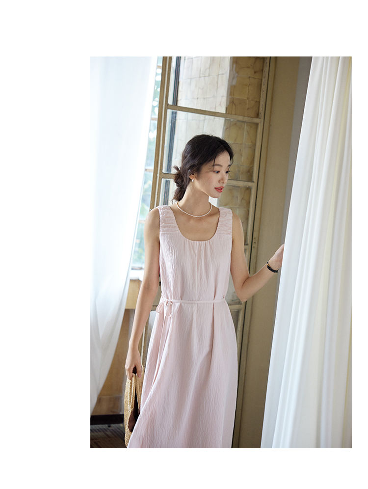 BLUEerror 萊賽爾手工褶U領無袖背心連衣裙女不規則高腰長裙夏季