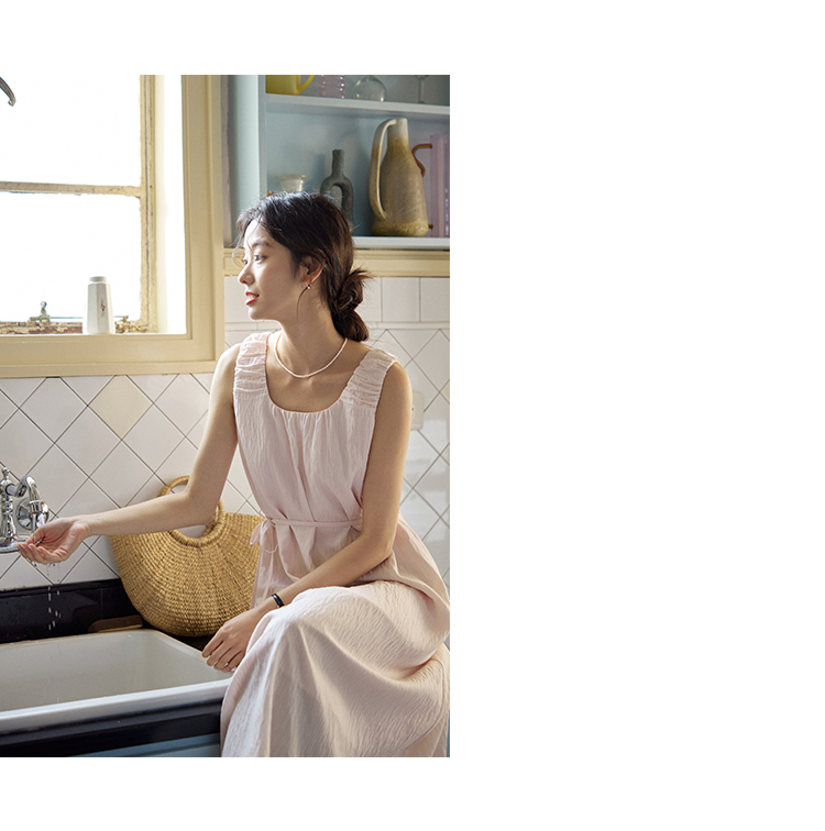 Moriirose 淡粉色肌理吊帶連衣裙女夏2023法式復古系帶收腰中長裙