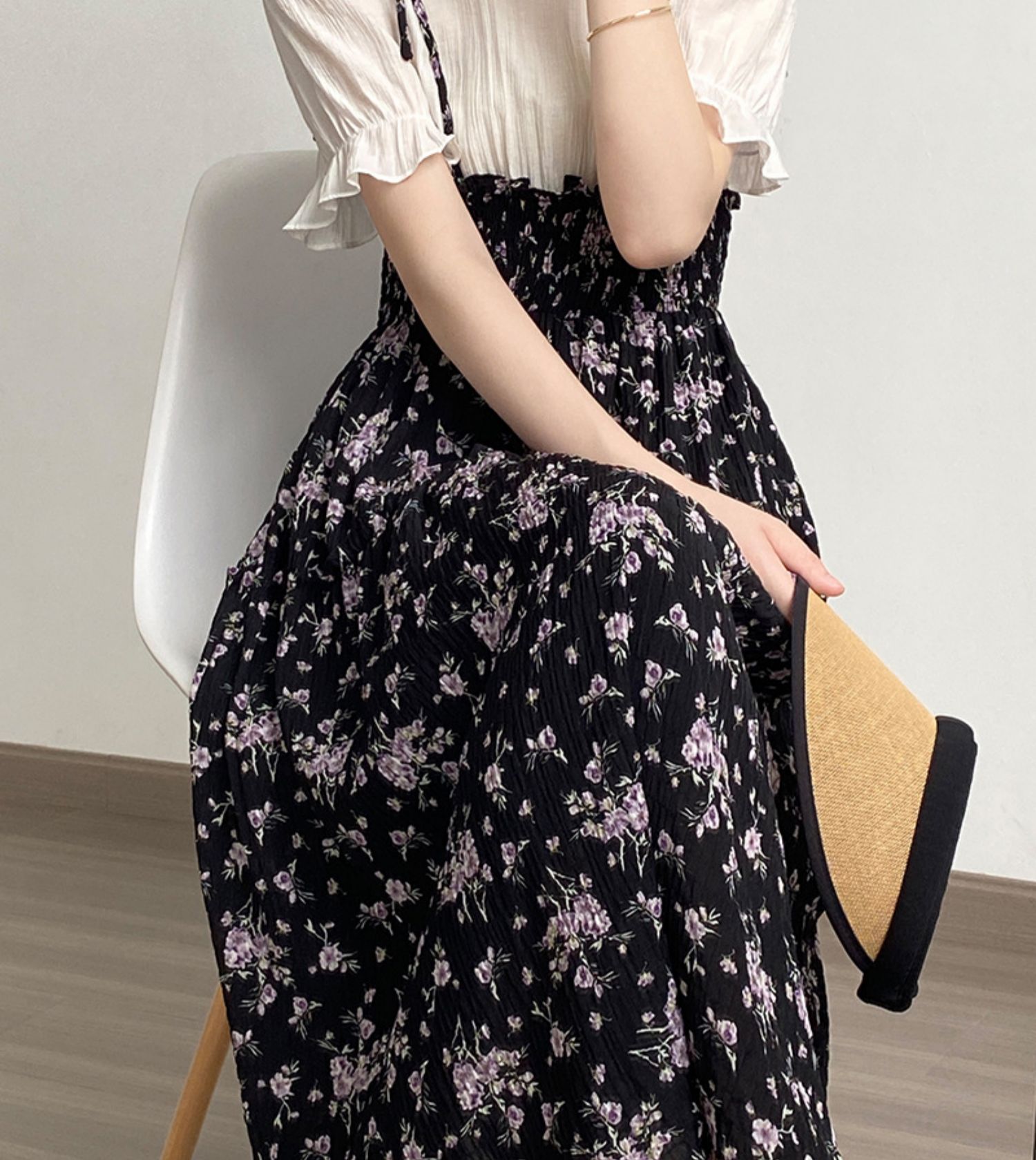 黑色碎花吊帶裙2023新款女夏季小個子雪紡蛋糕裙假兩件吊帶連衣裙