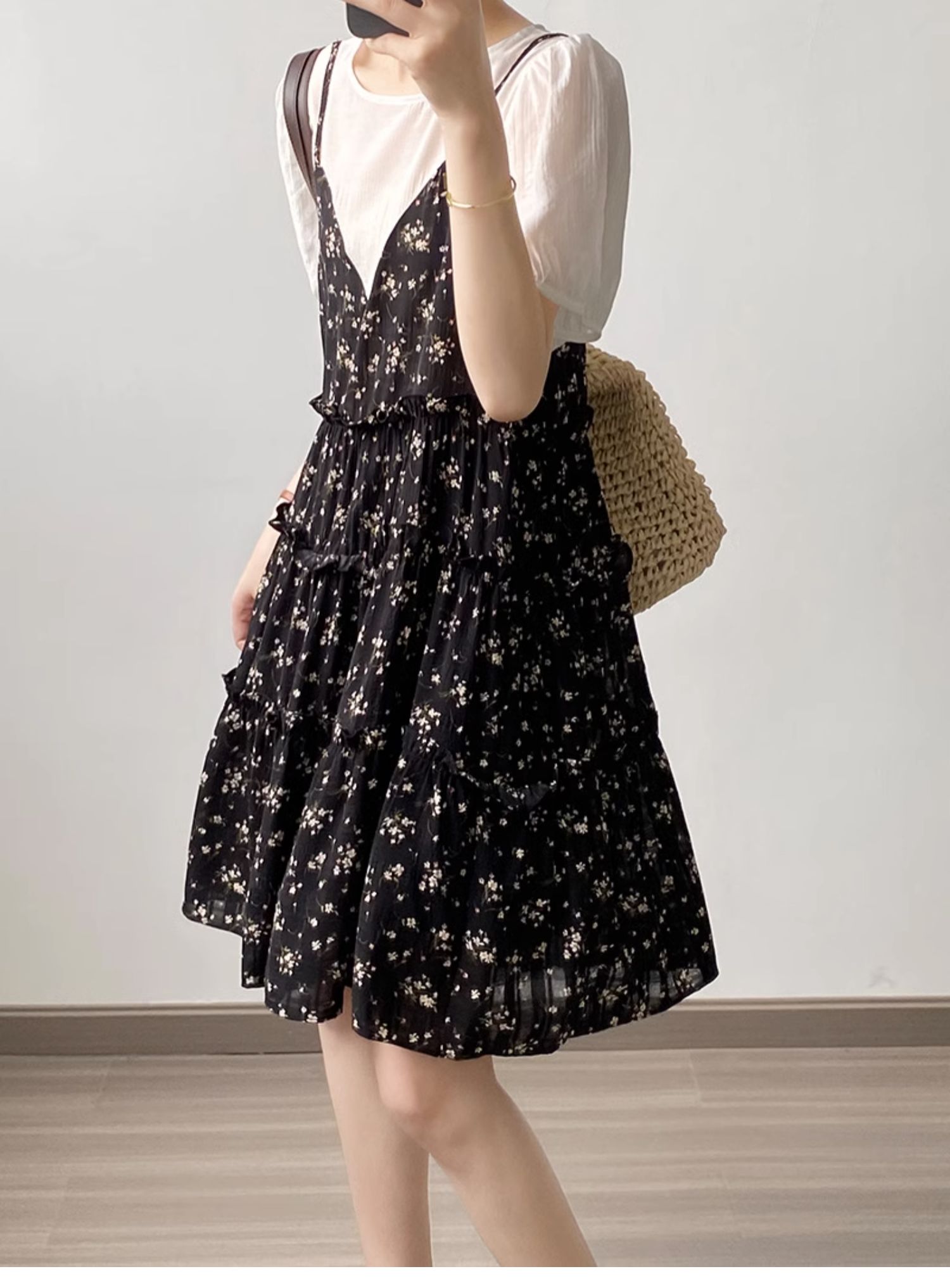 黑色碎花吊帶裙2023新款女夏季小個子雪紡蛋糕裙假兩件吊帶連衣裙
