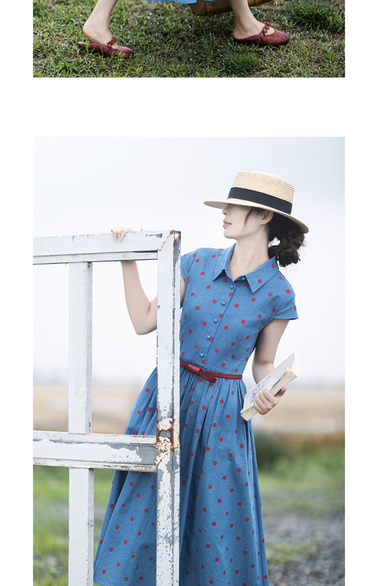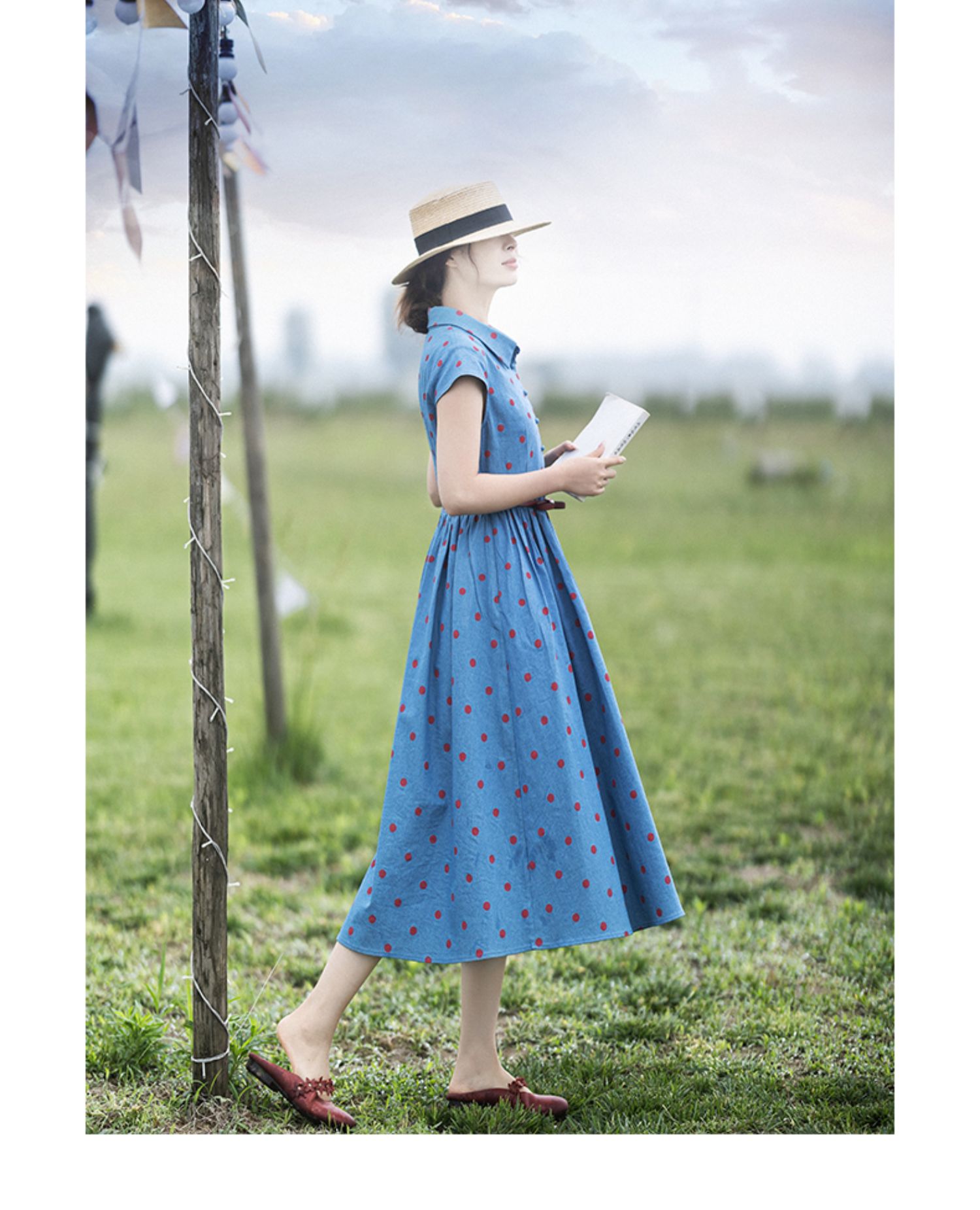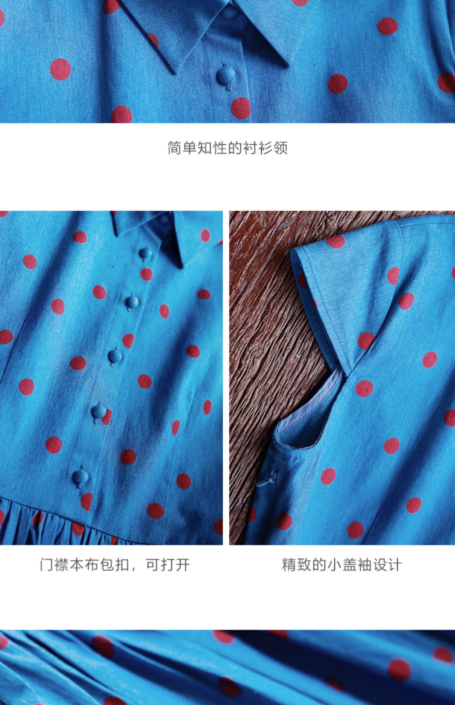 【丹寧夏語】原創復古圓波點襯衫領牛仔連衣裙女夏季短袖收腰氣質