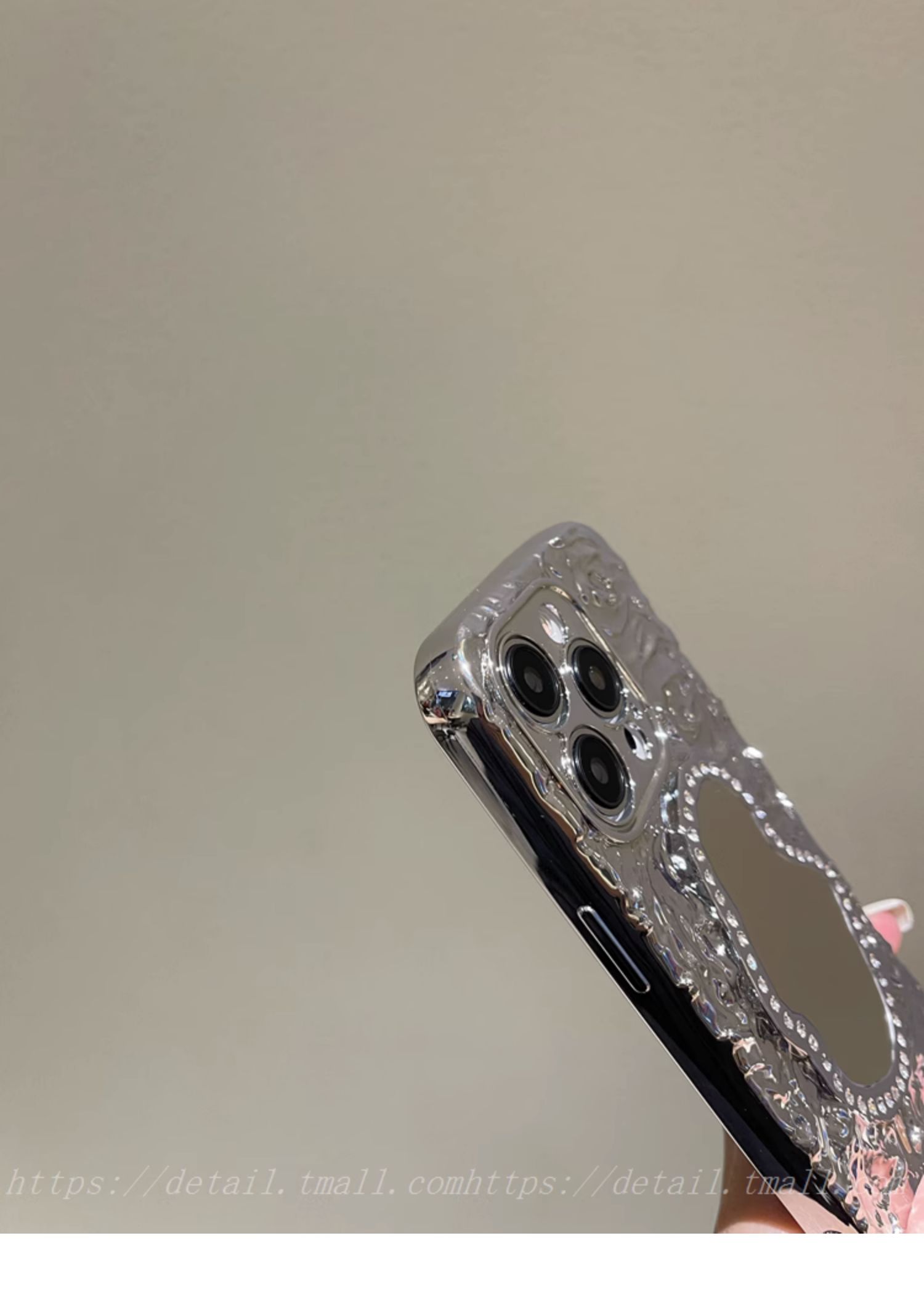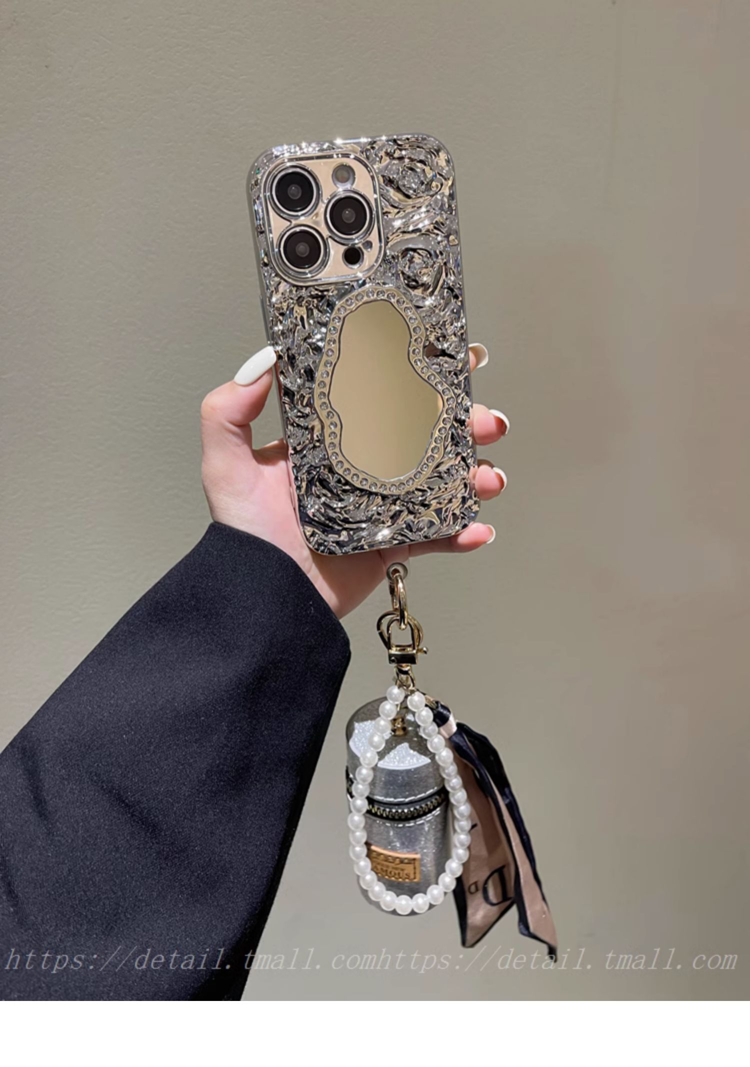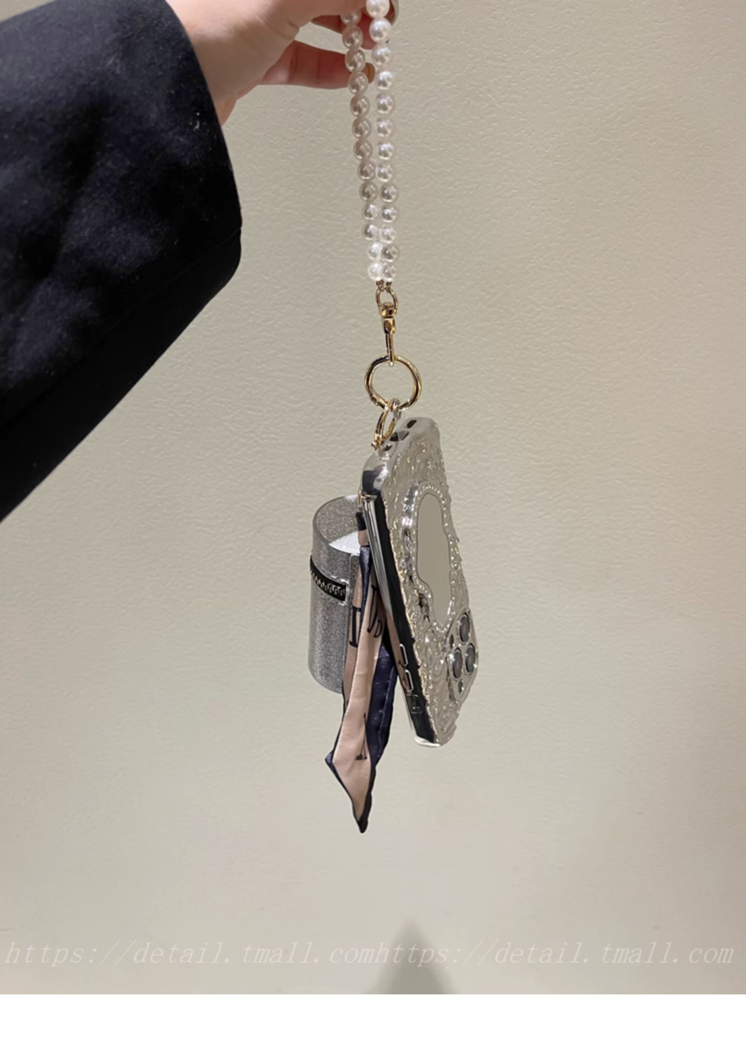 高級銀褶皺補妝鏡口紅包適用蘋果14promax手機殼iPhone14斜挎13腕帶12掛繩11背帶14pro手提13promax掛鏈13p