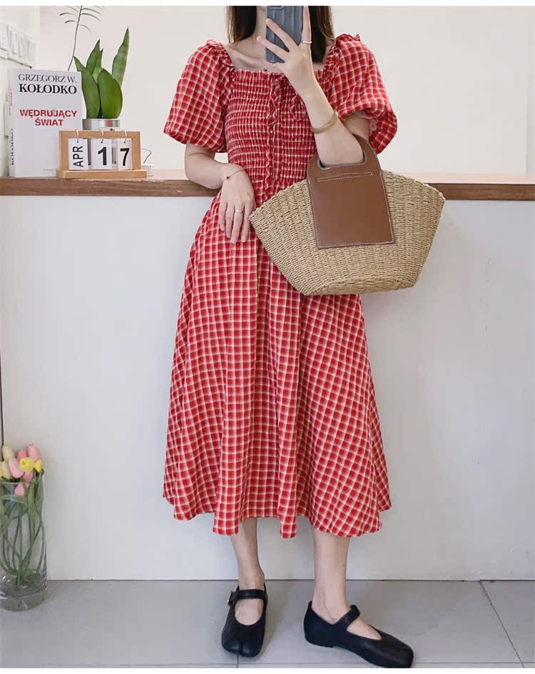 紅色格子方領連衣裙女歐洲站夏裝2023新款歐貨女裝時尚A字裙子潮