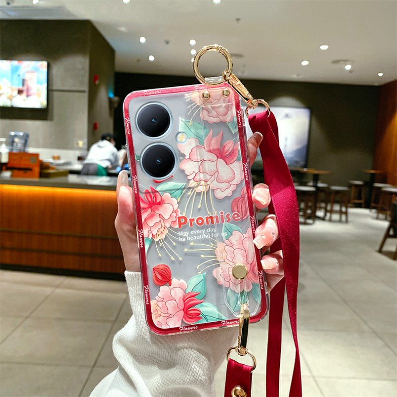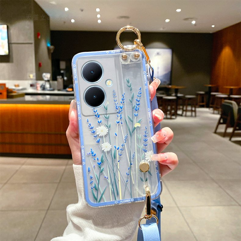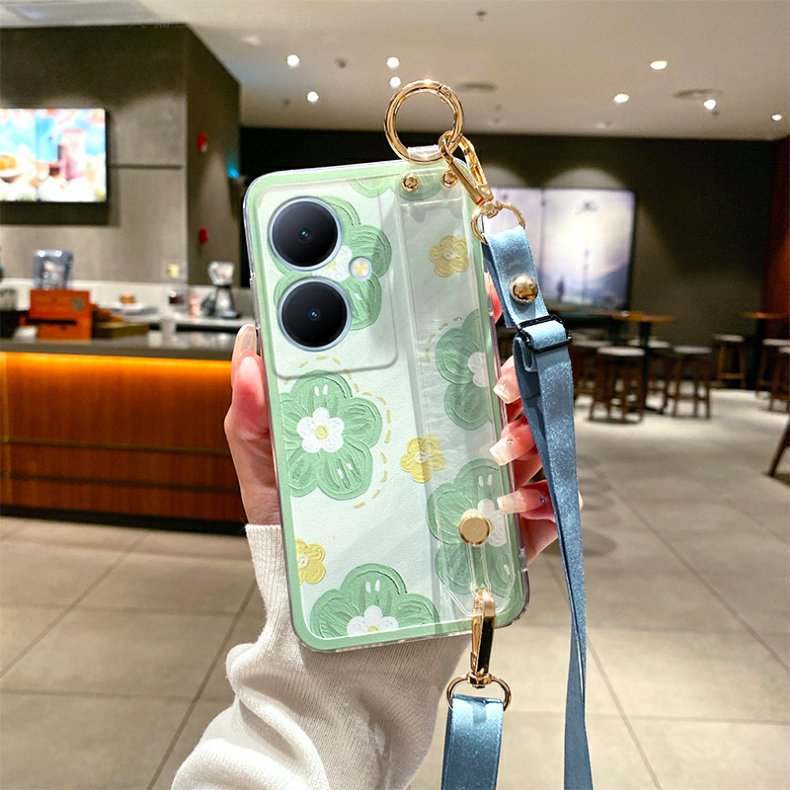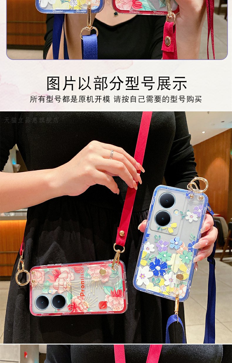 適用vivoy78+手機殼透明斜挎繩腕帶vivoy78m保護殼硅膠套5G斜挎掛繩V2271A全包防摔軟殼+卡通小清新花朵女78