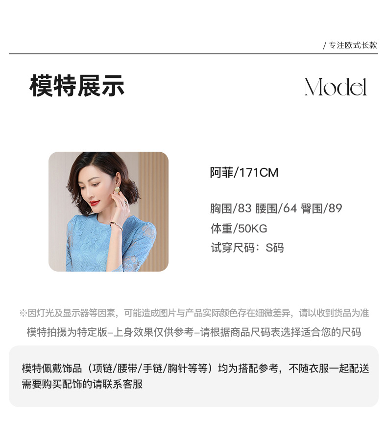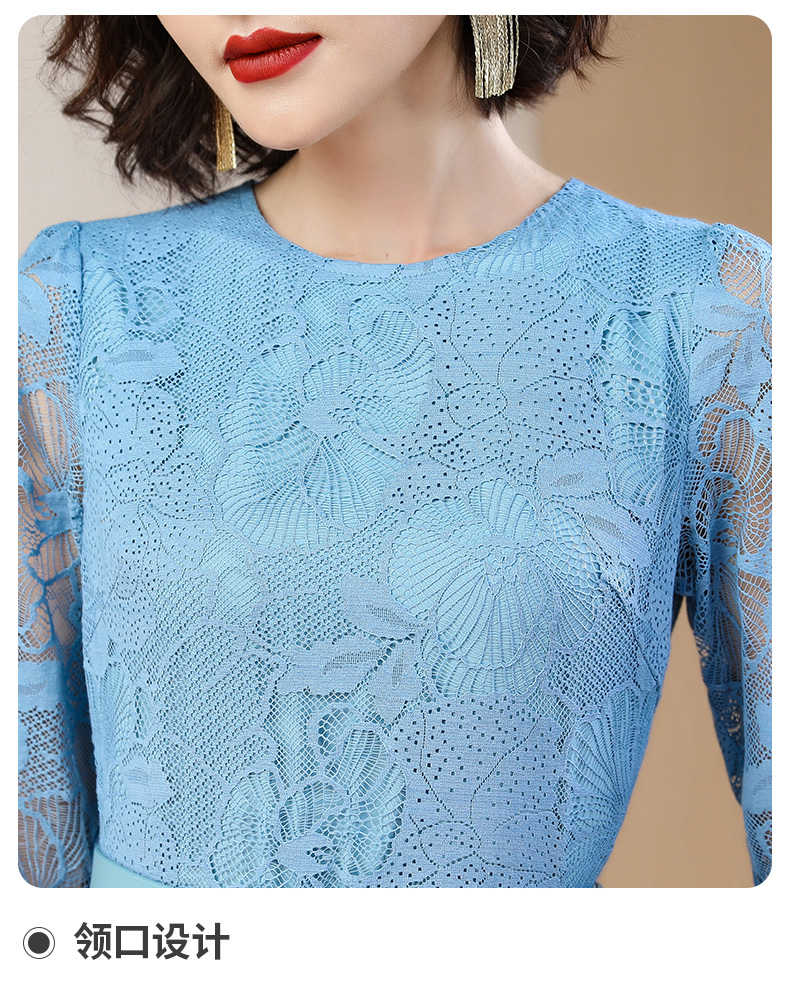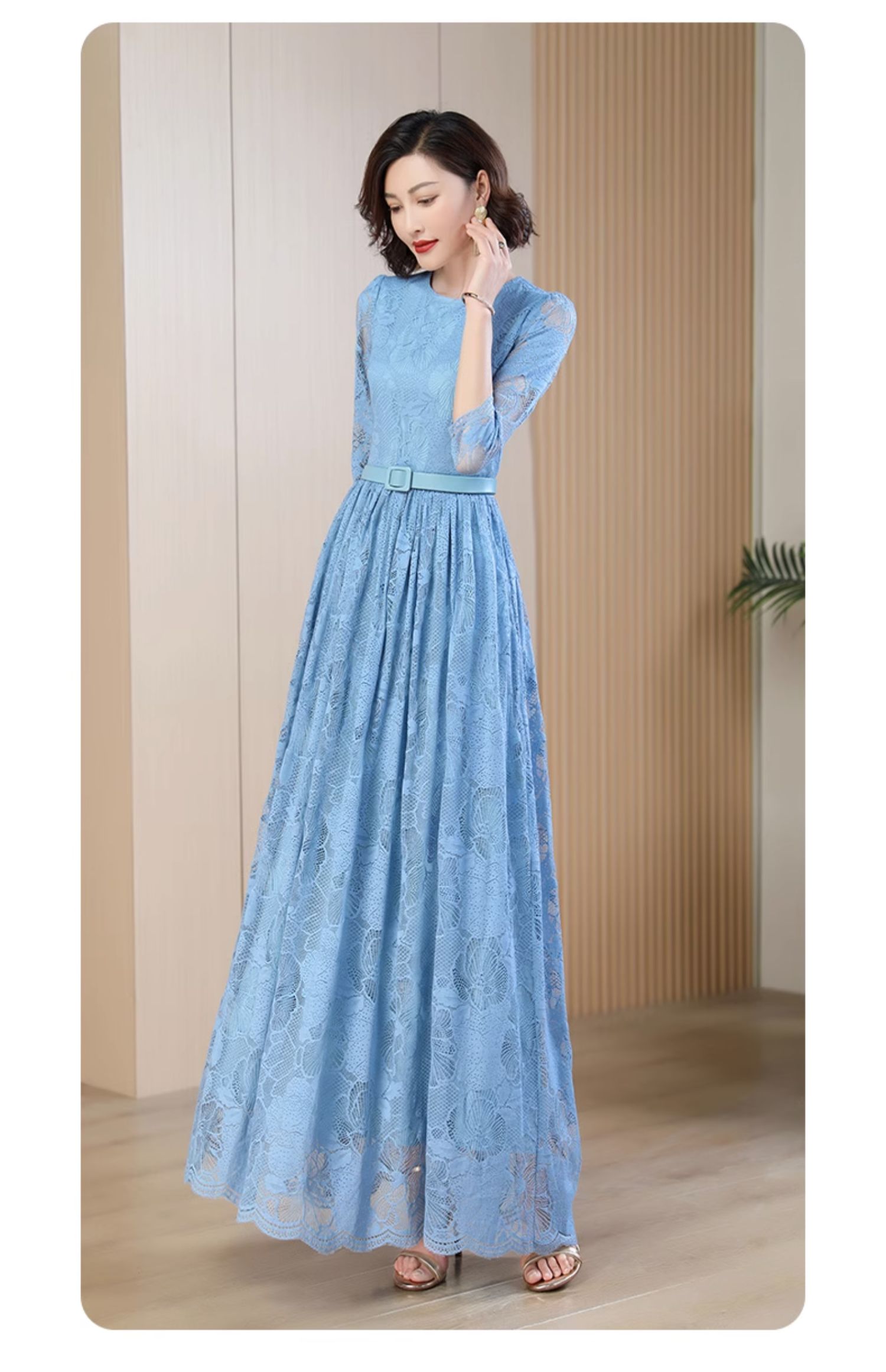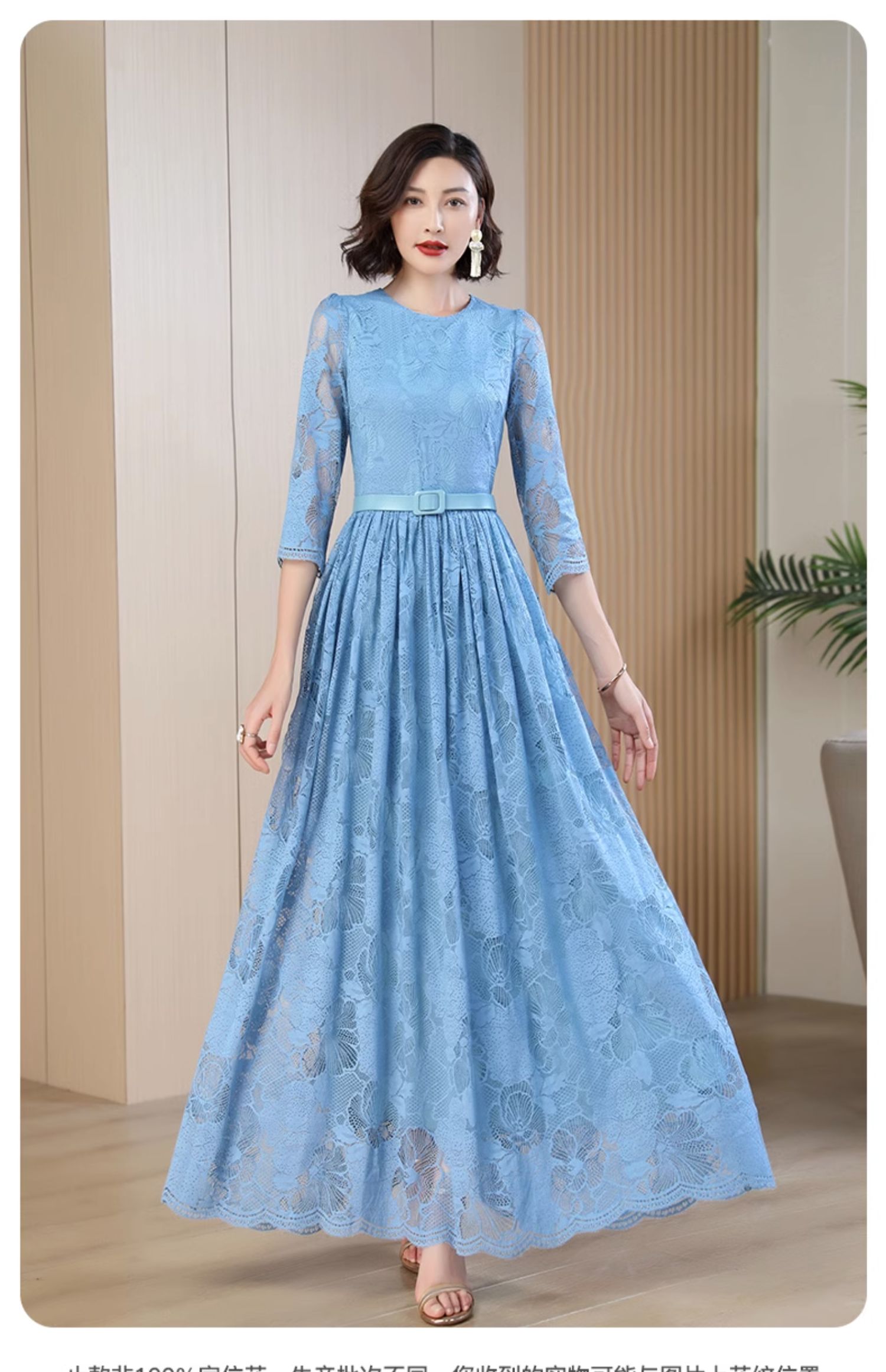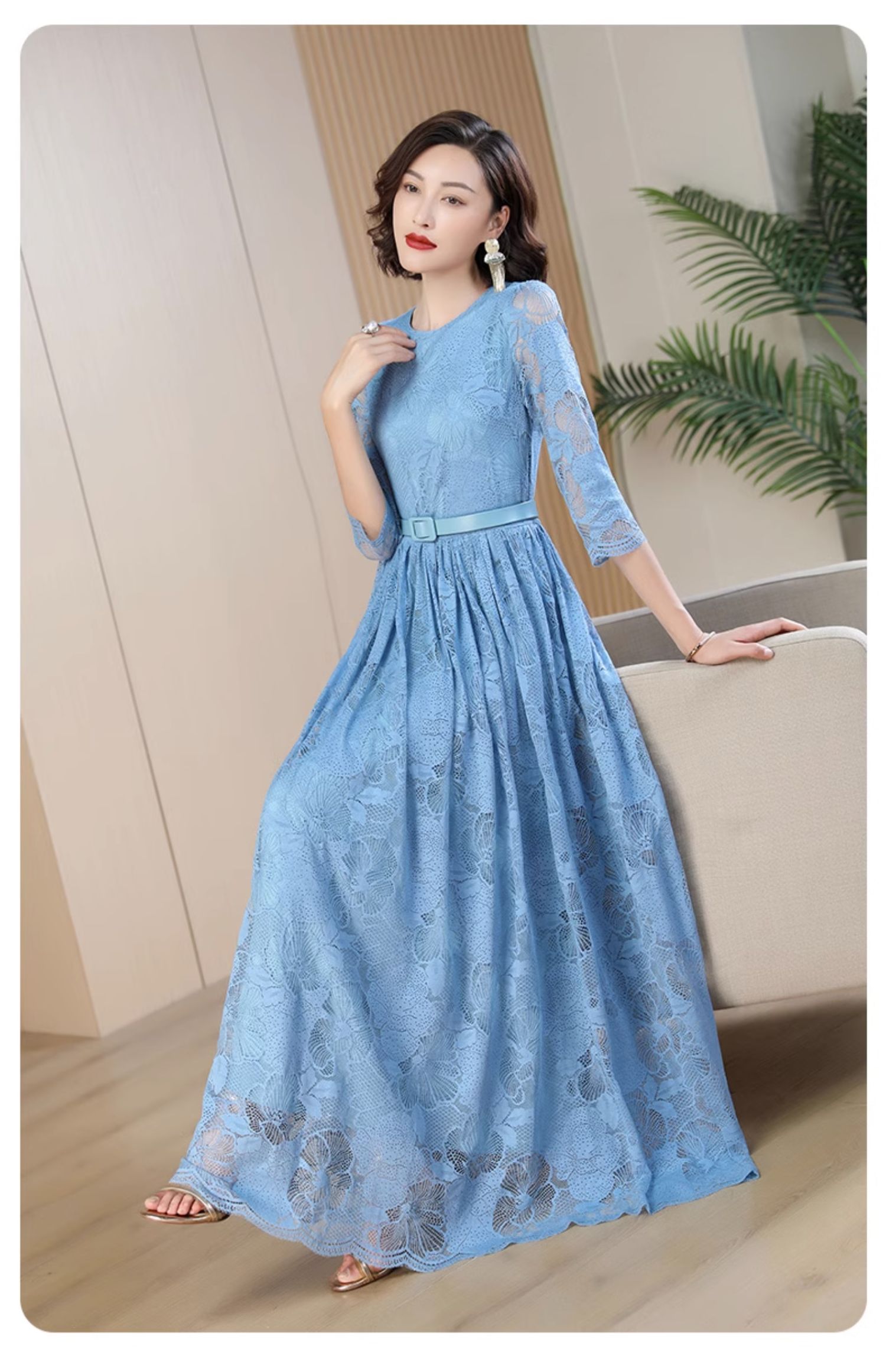 帝弗潤馳2023早秋新款高端奢華連衣裙長款藍色蕾絲拼接及踝長裙女