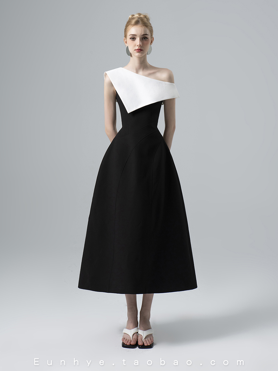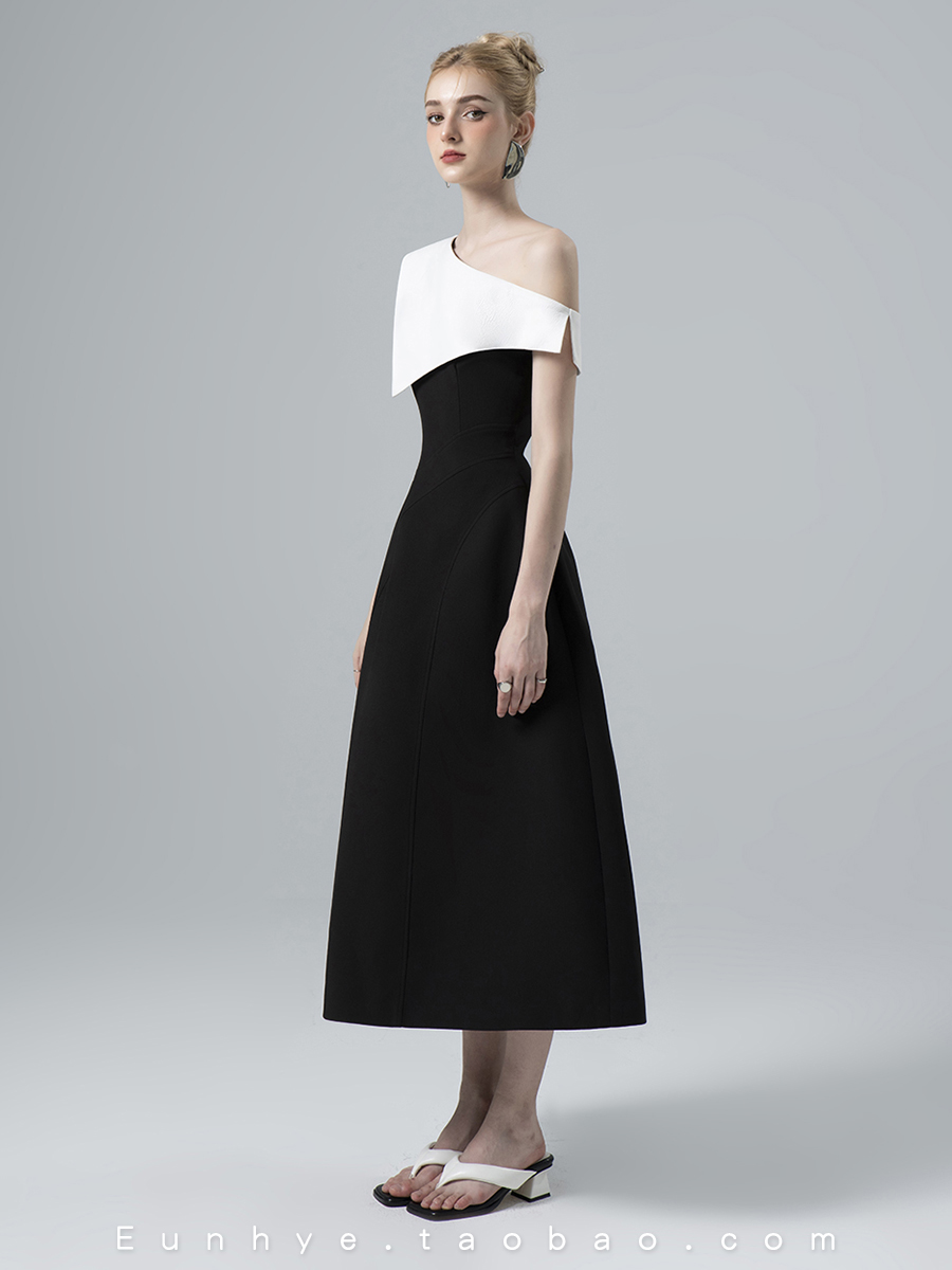 品牌授權 越南小眾CICI 2023年夏季新款極簡風撞色單肩連衣裙