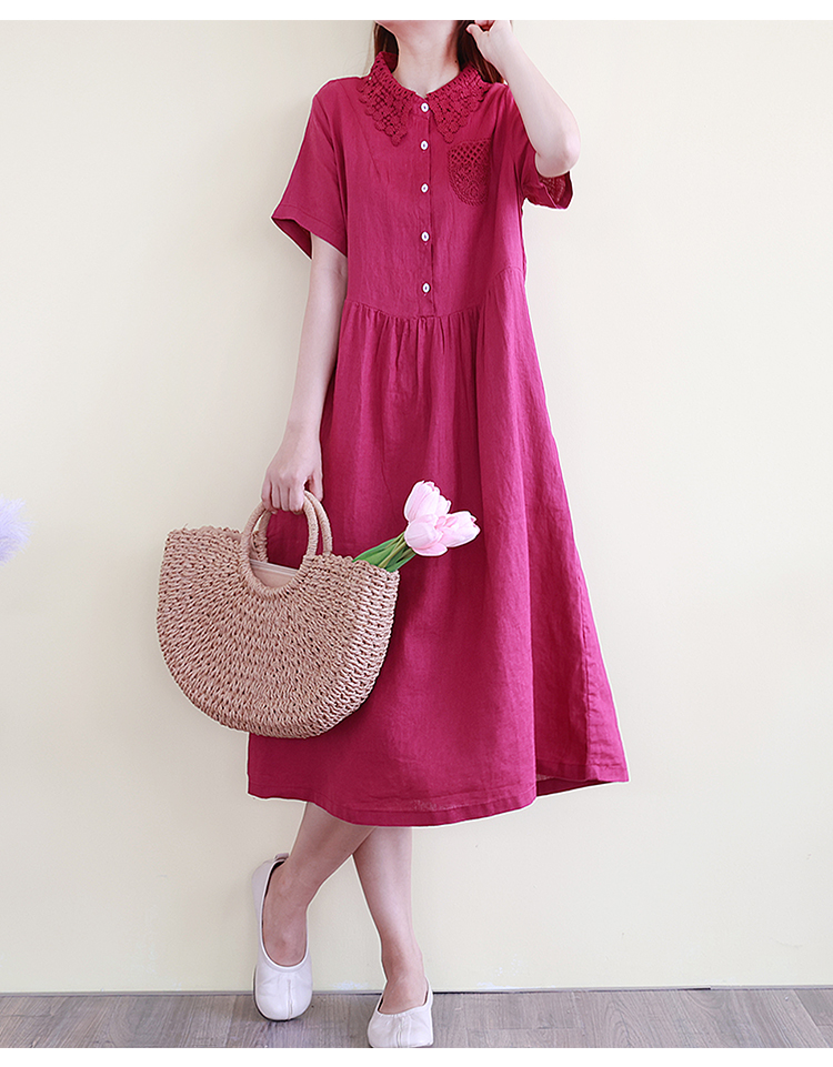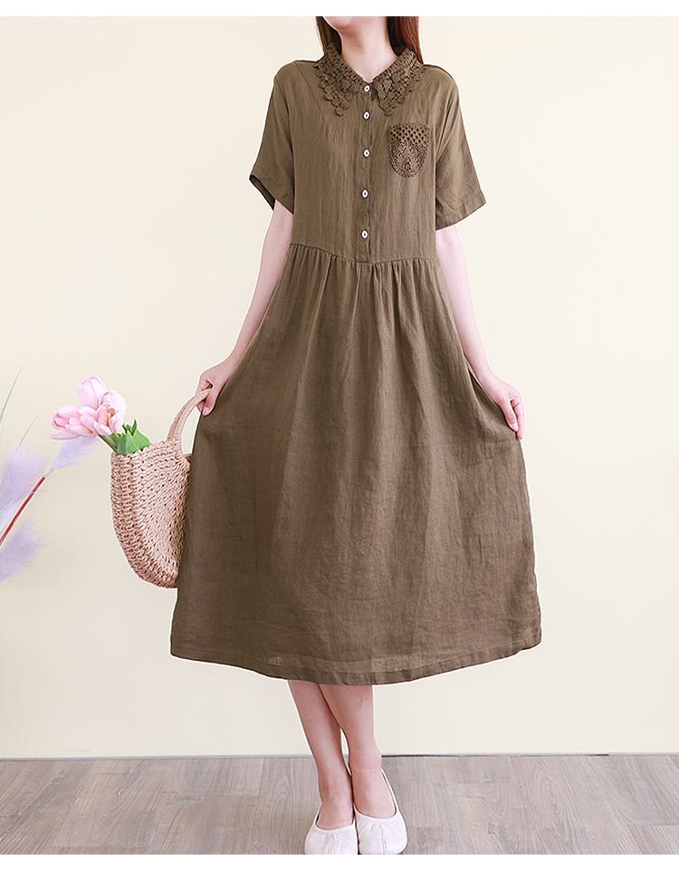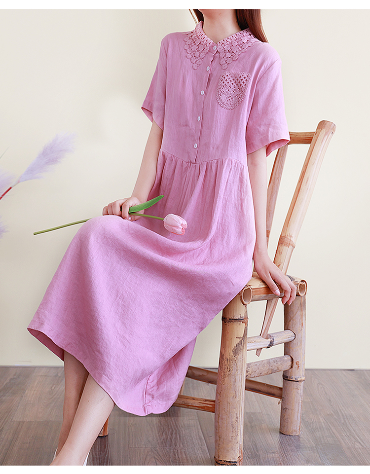 復古亞麻棉刺繡春秋季拼接連衣裙