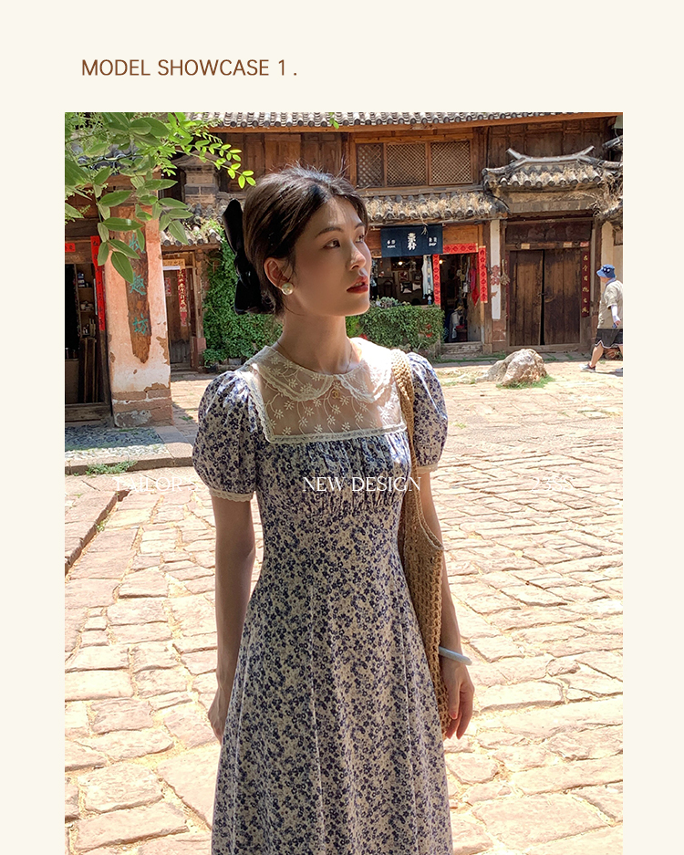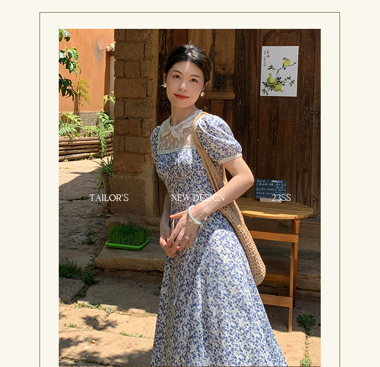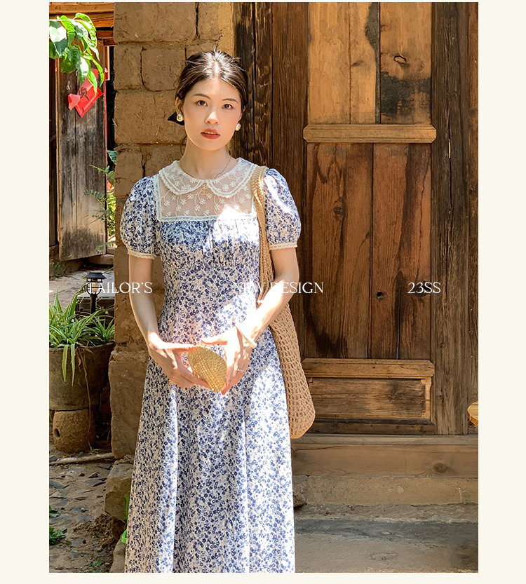三個裁縫 晚塘月色 法式田園風碎花連衣裙女顯瘦氣質