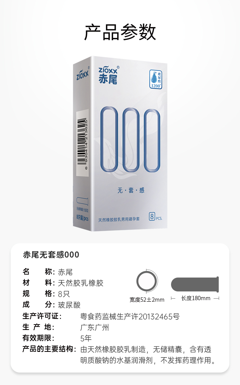 赤尾避孕套000超薄安全套8只*1盒玻尿酸水潤超滑裸入保險套男用