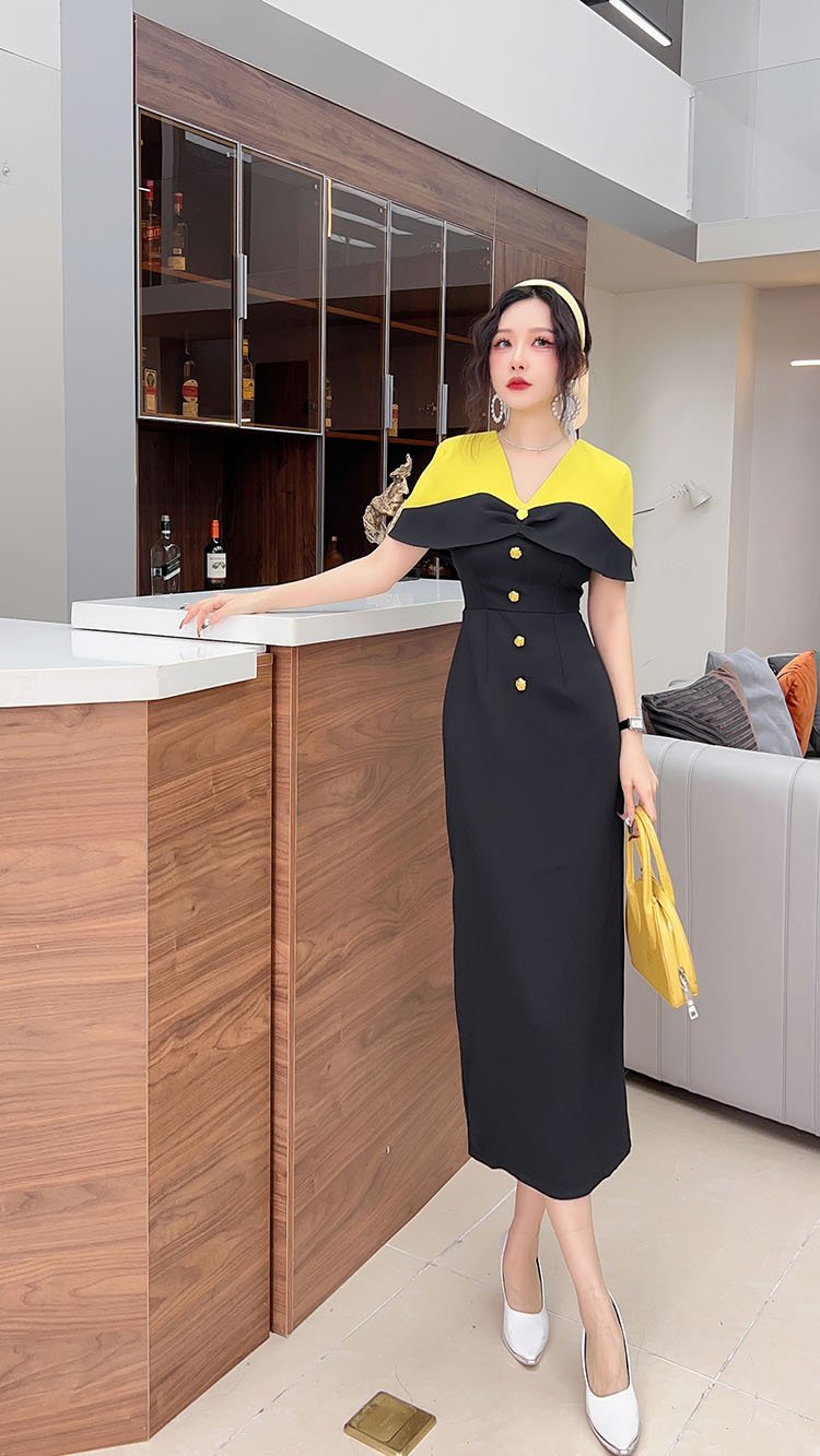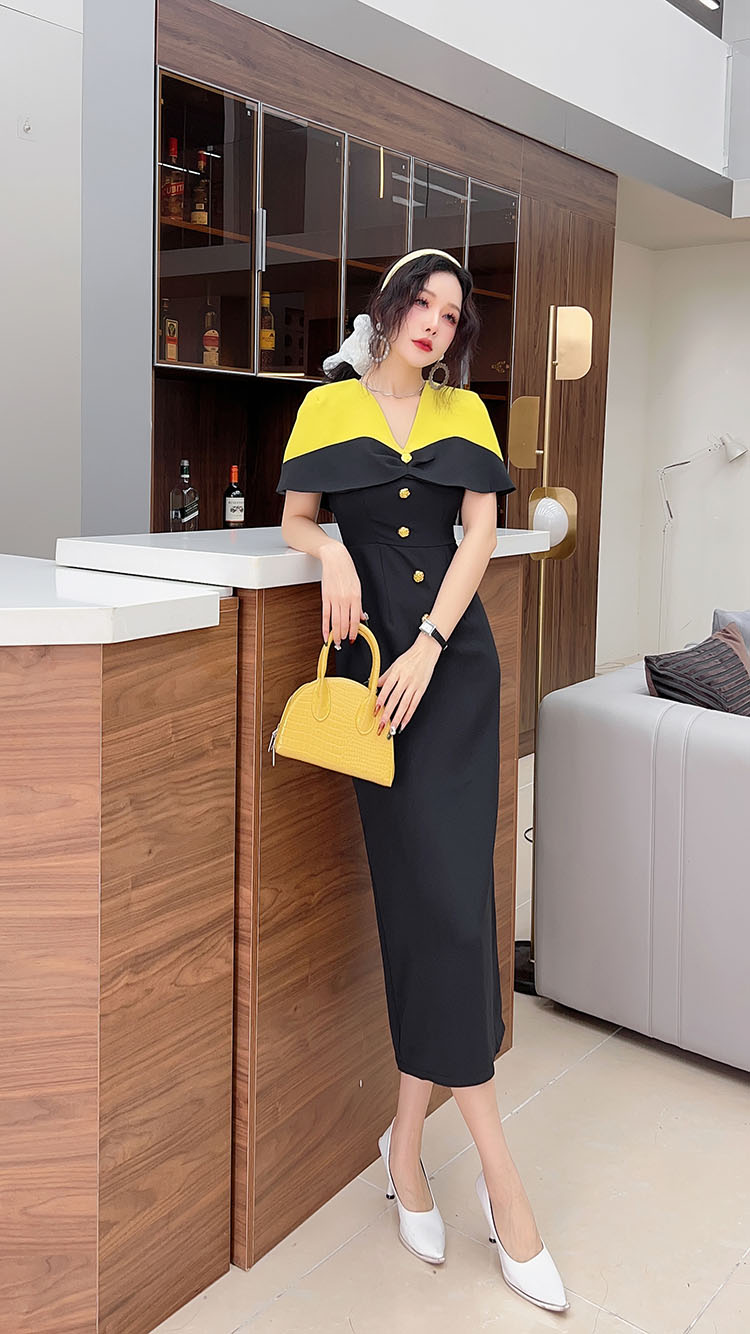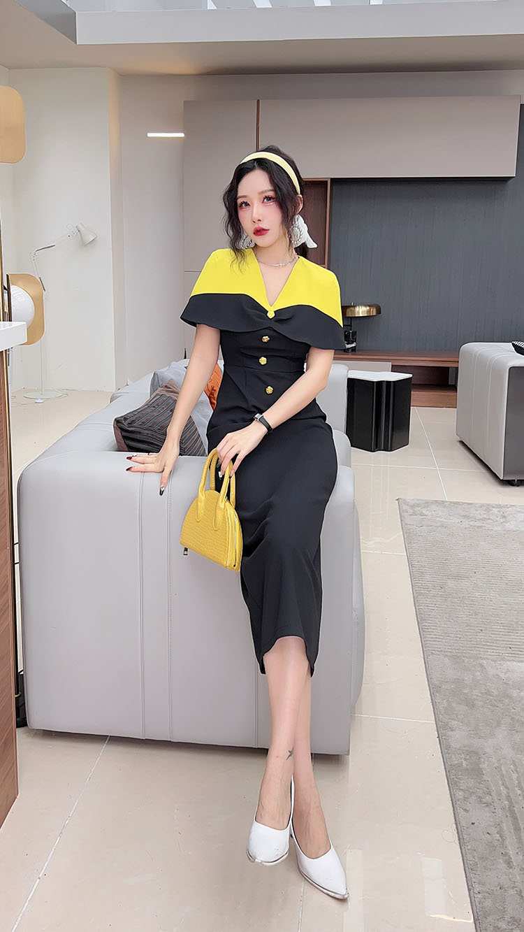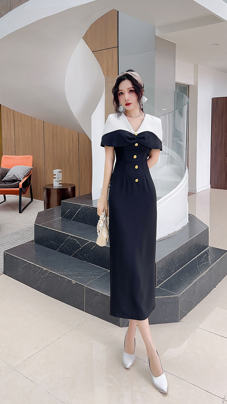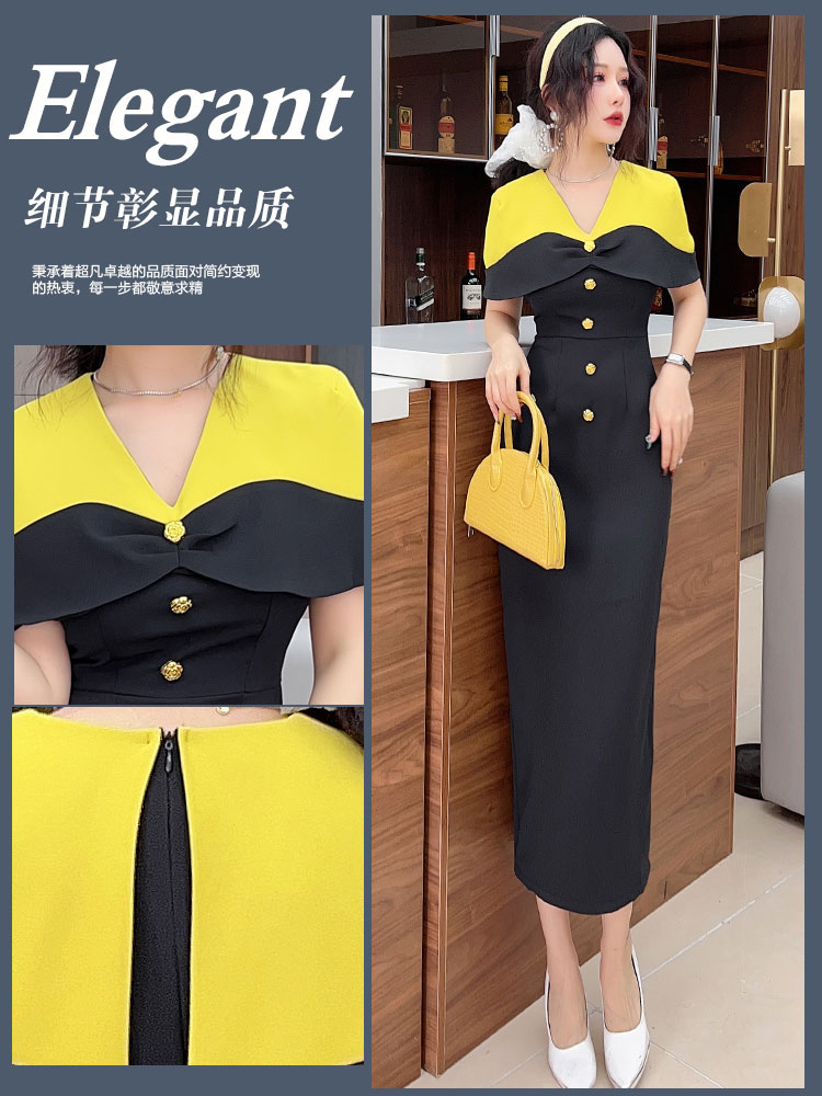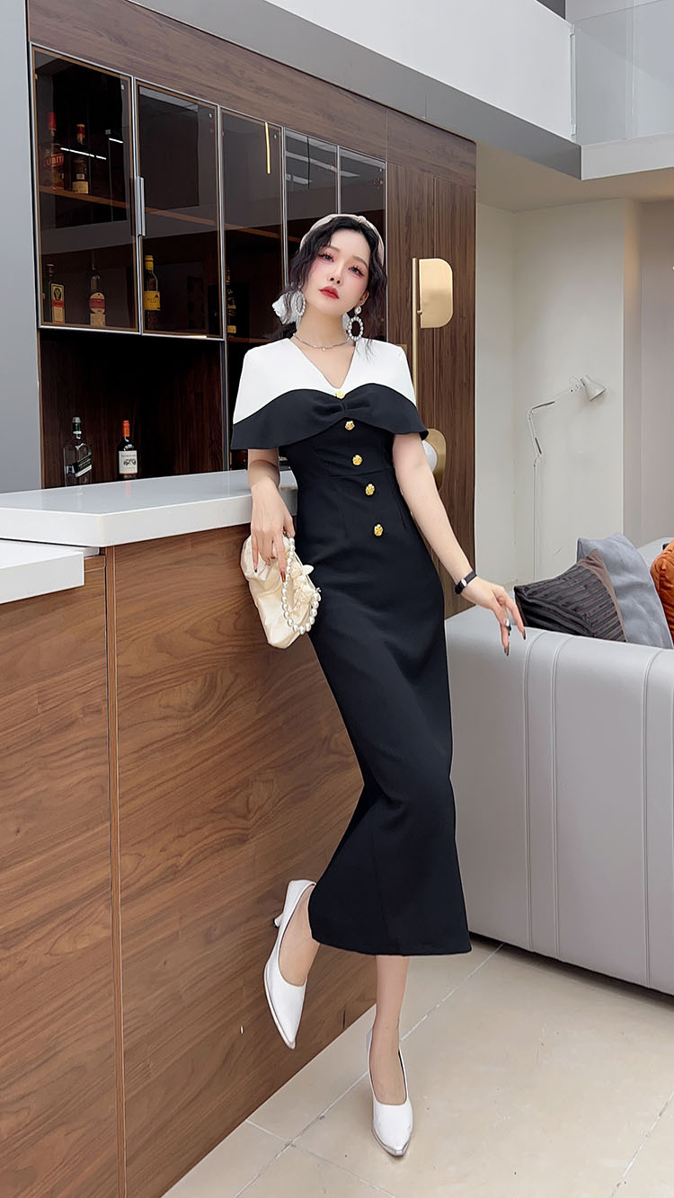 夏裝新款法式高端輕奢黑白拼接斗蓬連衣裙女收腰開叉單排扣禮服裙