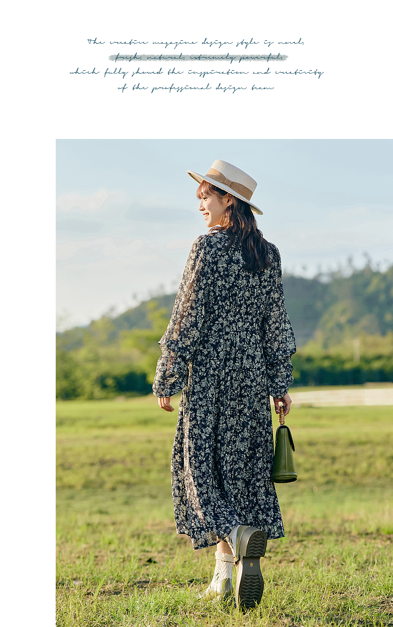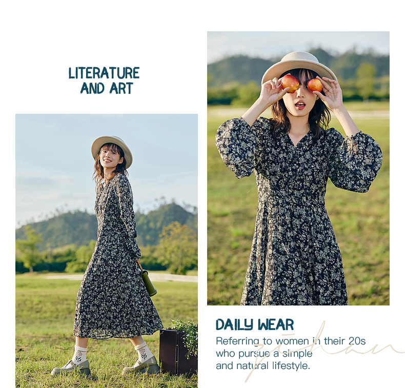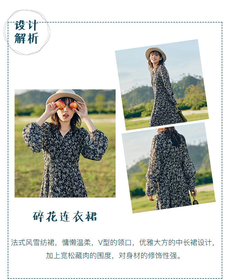 紫涵雪紡V領連衣裙法式浪漫碎花中長裙2023秋季新品收腰百搭長裙
