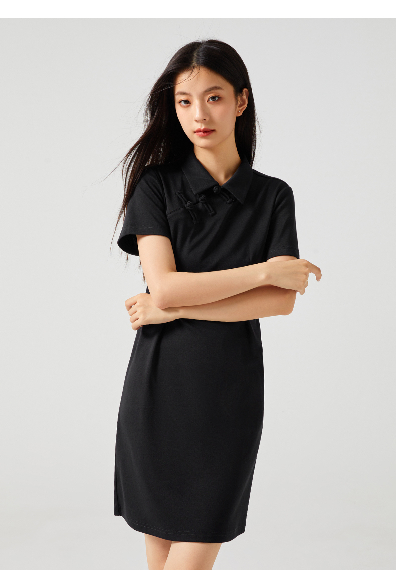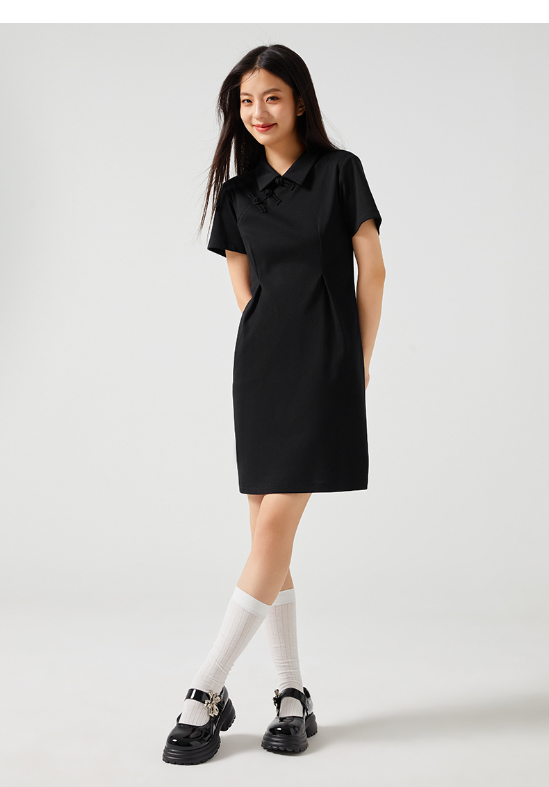 熱風2023年新款女士新中式翻領連衣裙A字短袖簡約百搭中長裙夏款