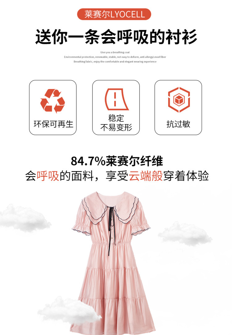 【香影天絲】萊賽爾粉色娃娃領連衣裙女2023夏季新款甜美泡泡袖裙
