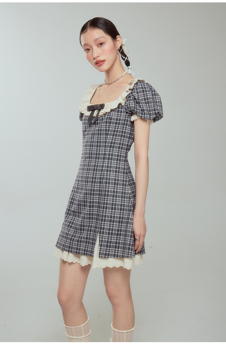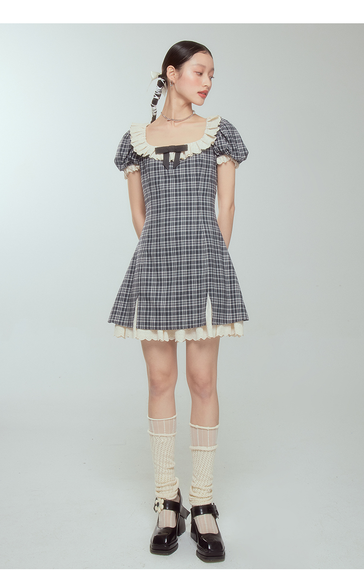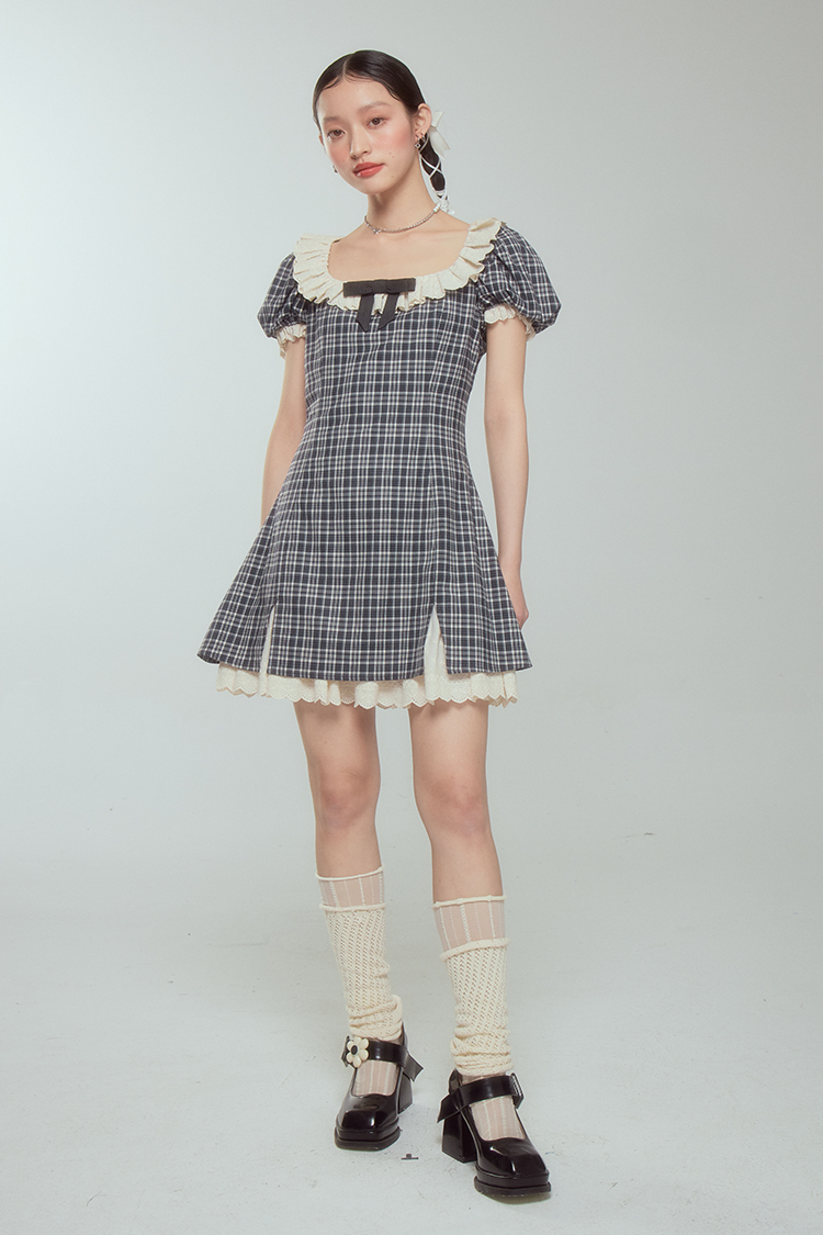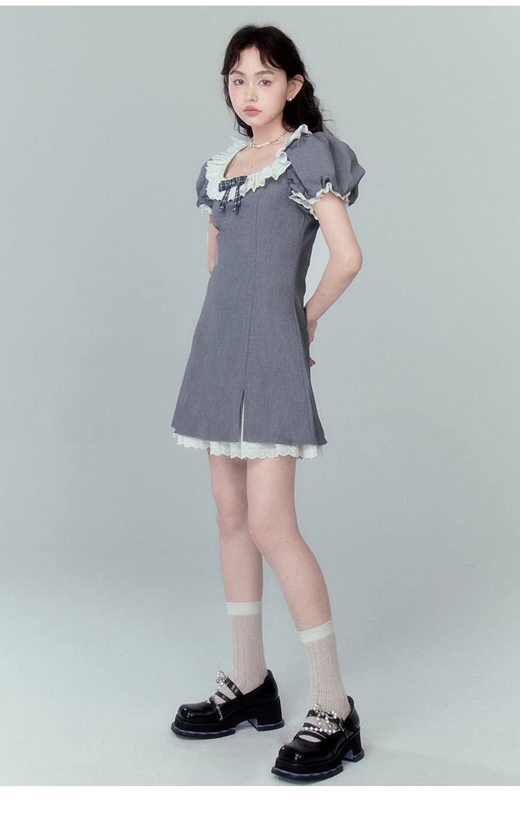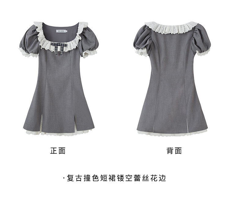 DIDDI 原創設計 甜美靈動撞色短裙鏤空蕾絲花邊蝴蝶結方領連衣裙