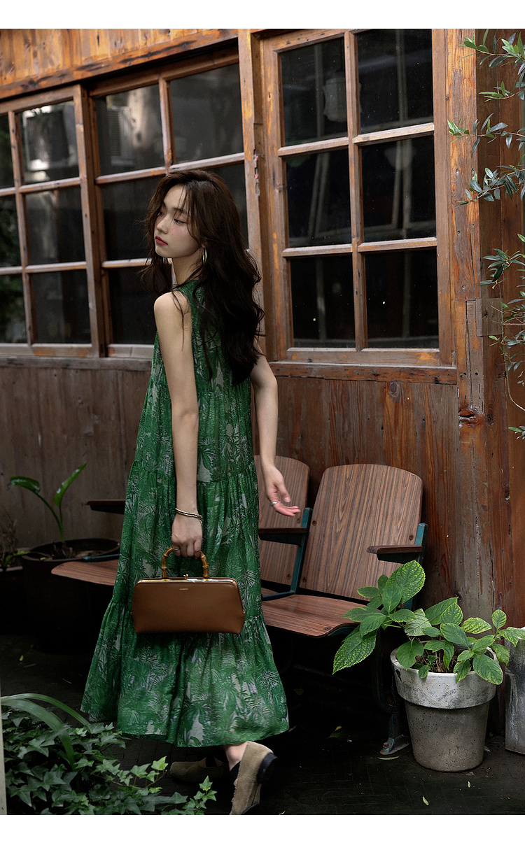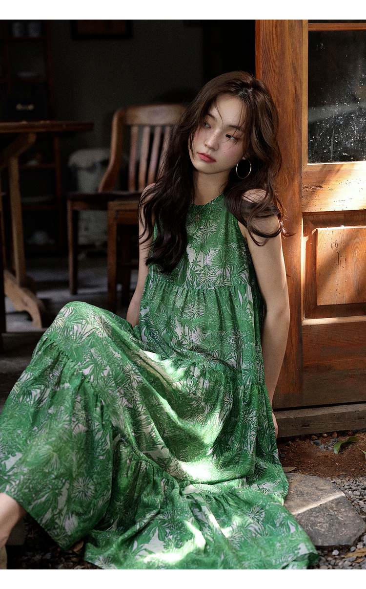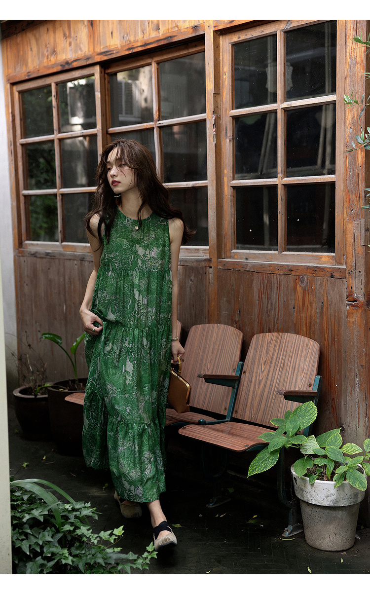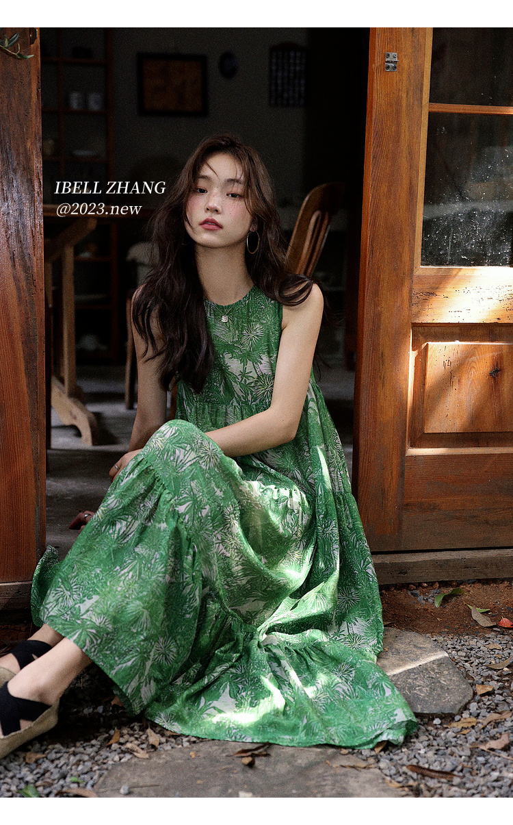 張貝貝ibell【現貨】桑蠶絲度假風森系長裙女寬松無袖印花連衣裙