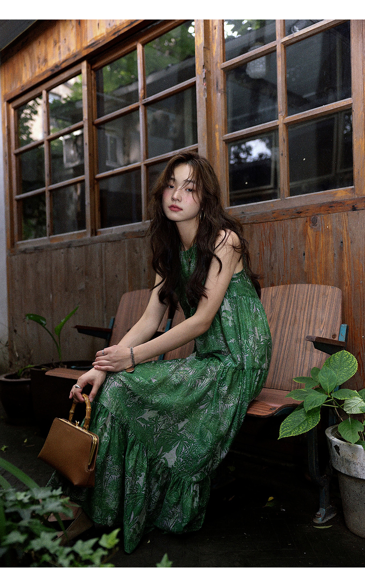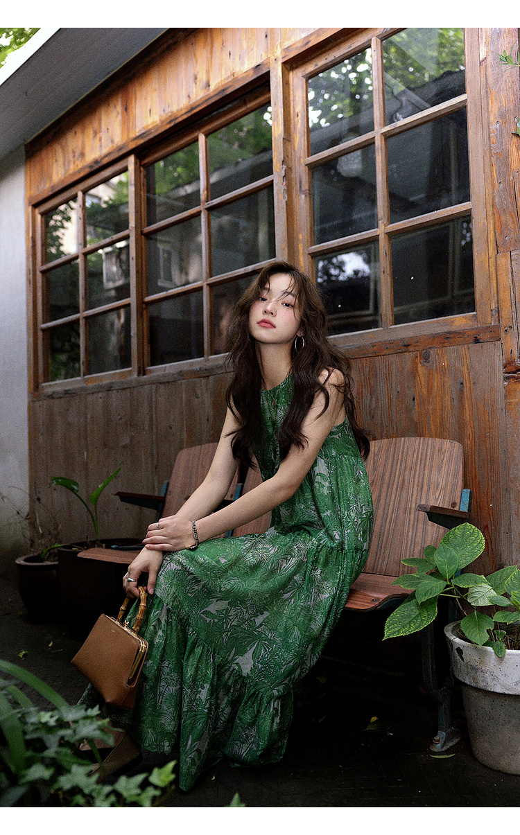 彌古綠色碎花連衣裙吊帶夏沙灘裙