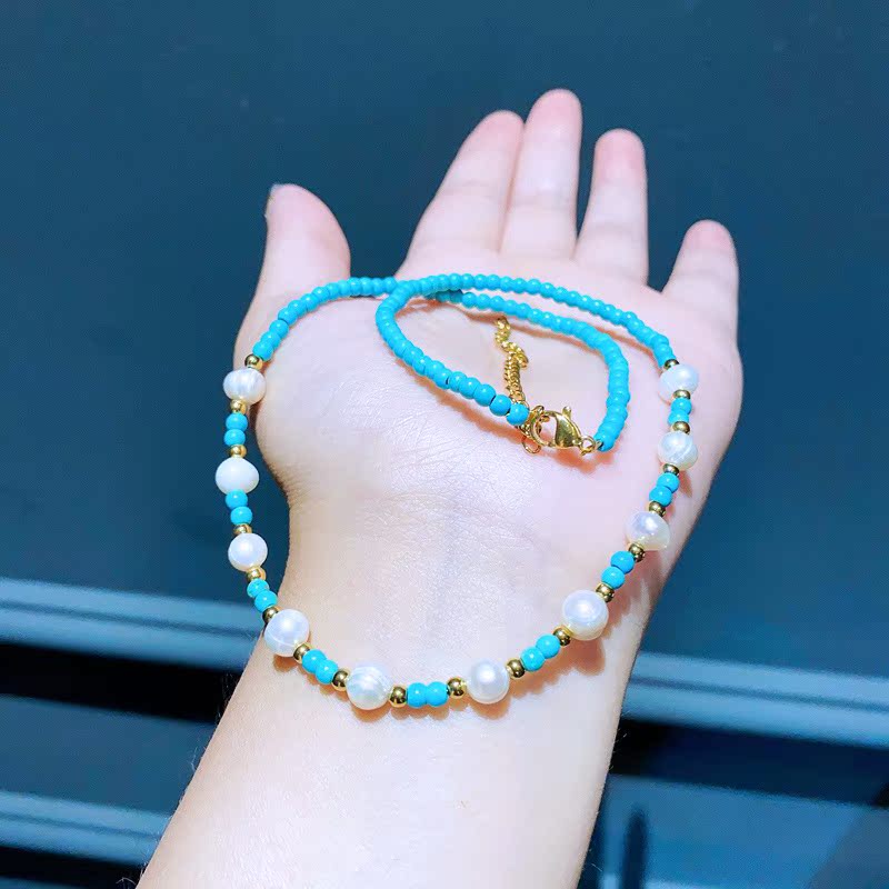 手工串珠淡水珍珠綠松石項鏈女輕奢小眾設計感高級鎖骨鏈氣質頸鏈