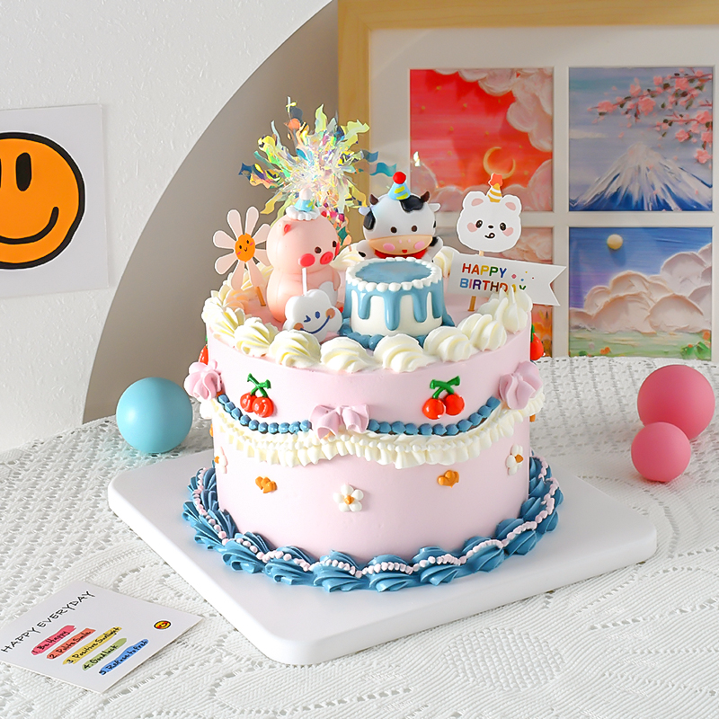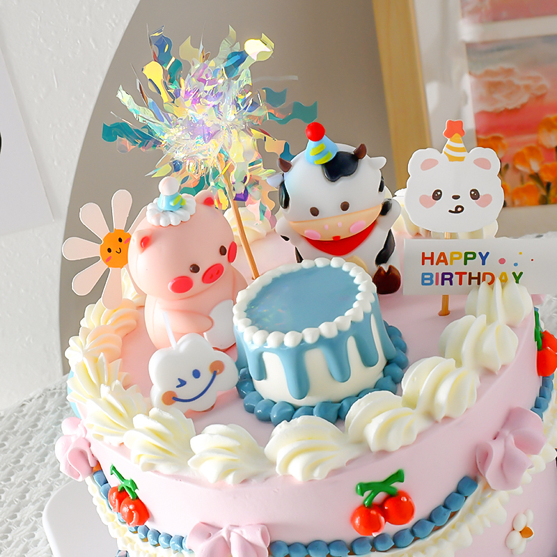網紅ins小動物蛋糕裝飾擺件復古派對小豬小牛雨絲笑臉云朵小插件