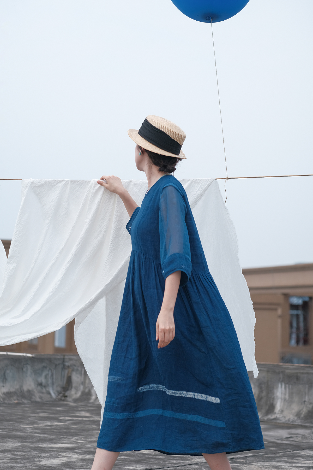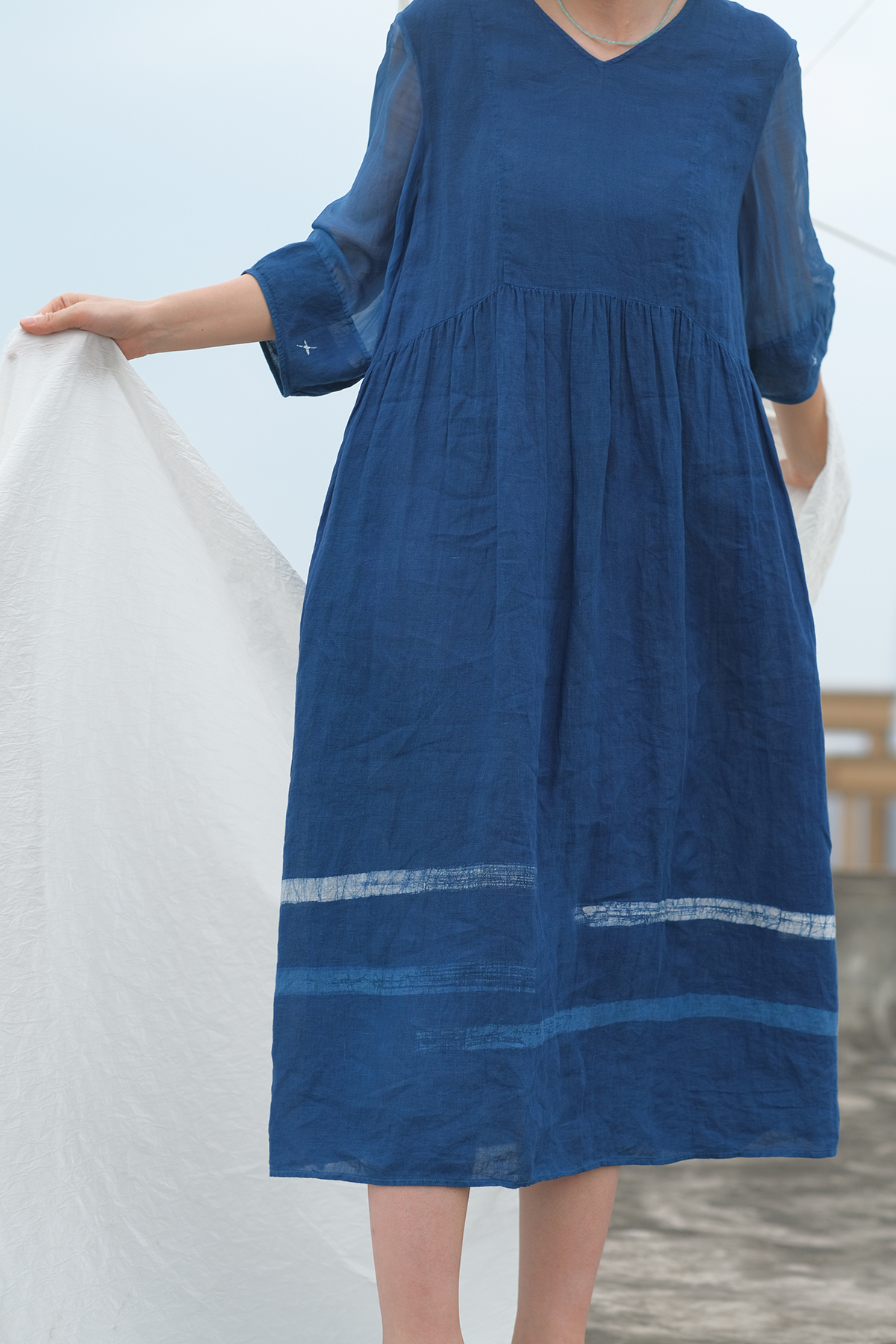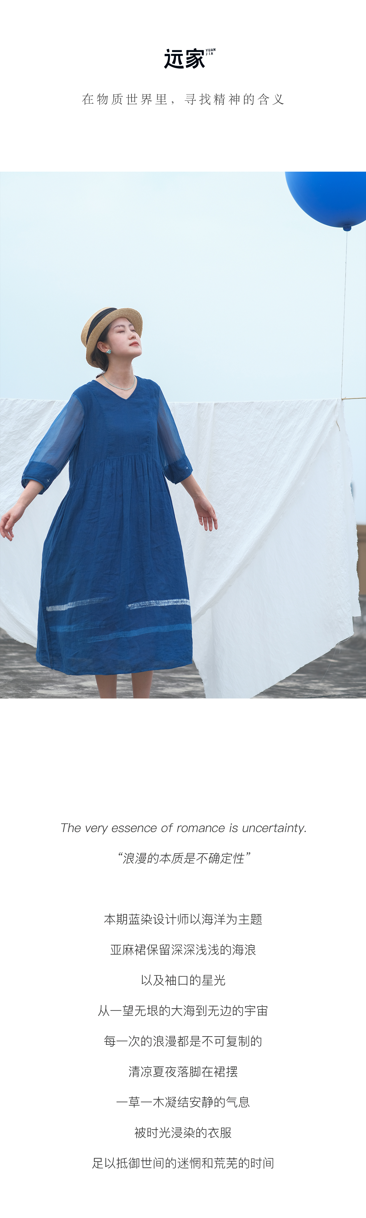 遠家草木染蠟畫純亞麻連衣裙拼接真絲中袖V領寬松袍子LF2570限量
