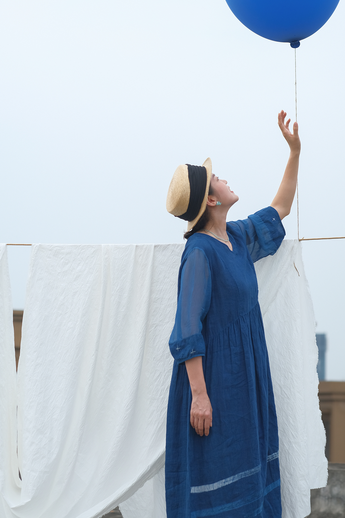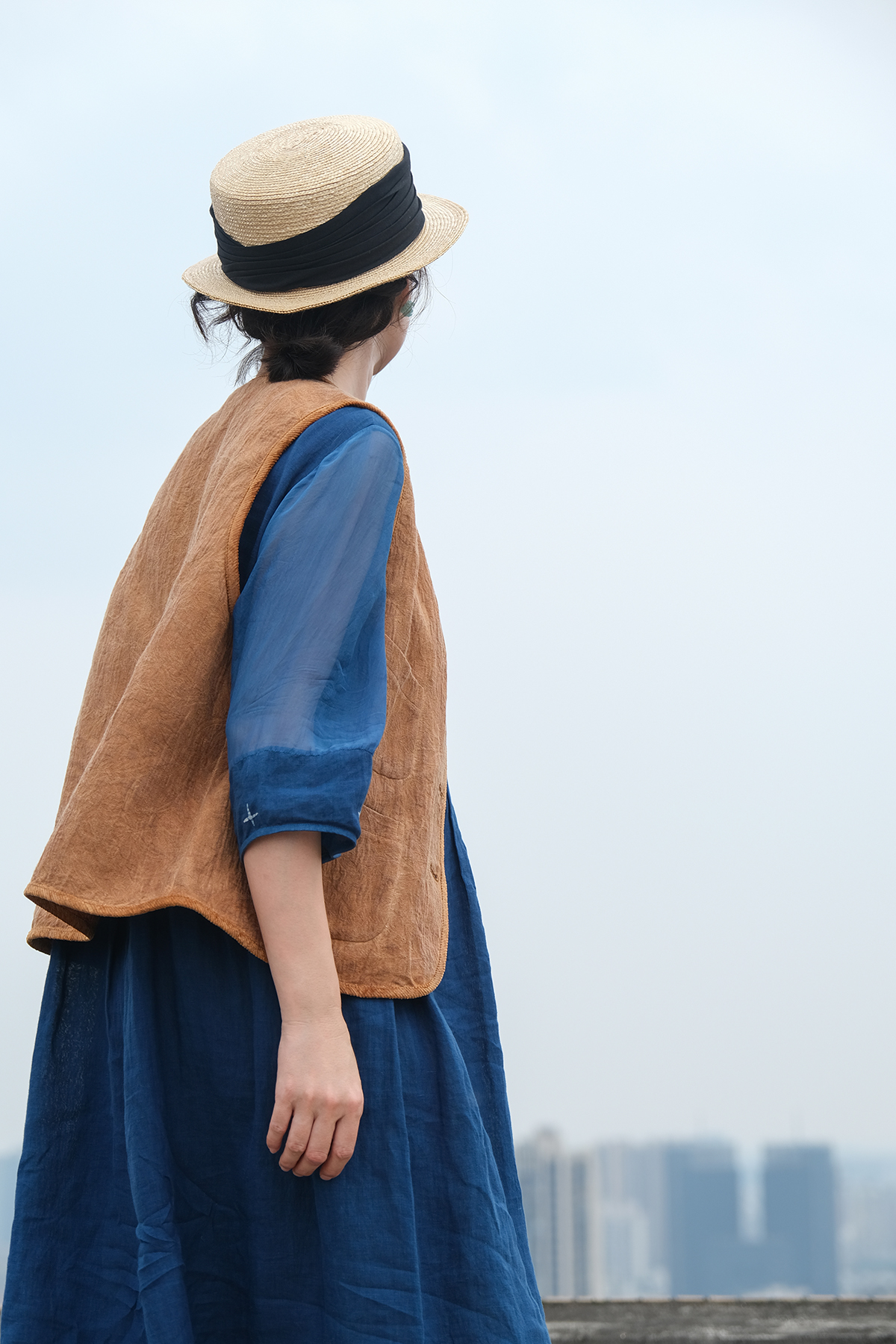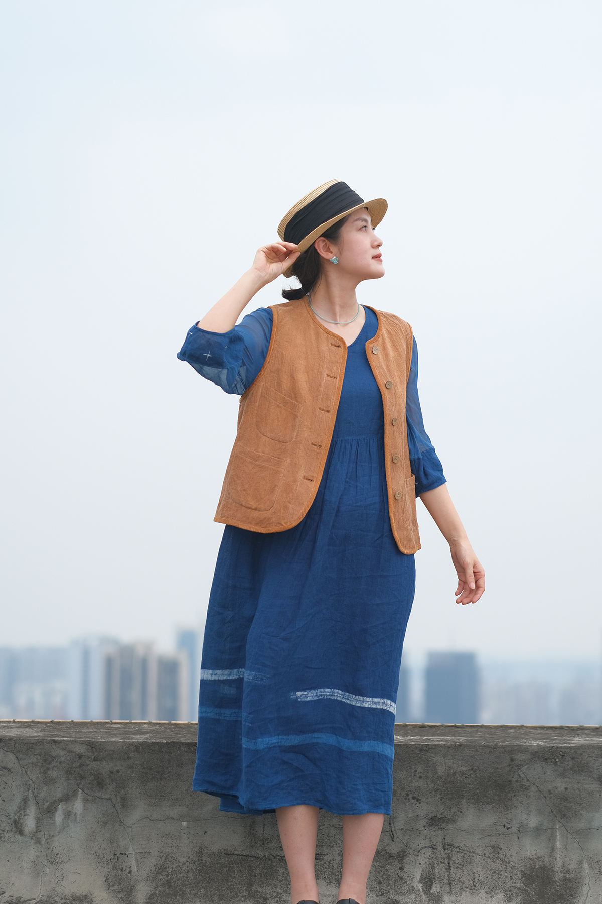 遠家草木染蠟畫純亞麻連衣裙拼接真絲中袖V領寬松袍子LF2570限量