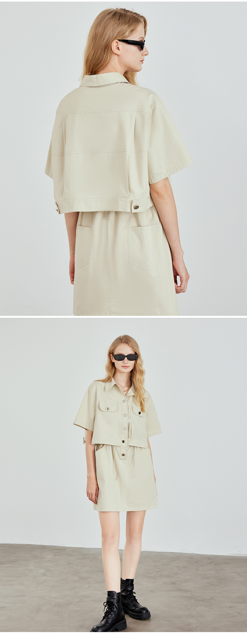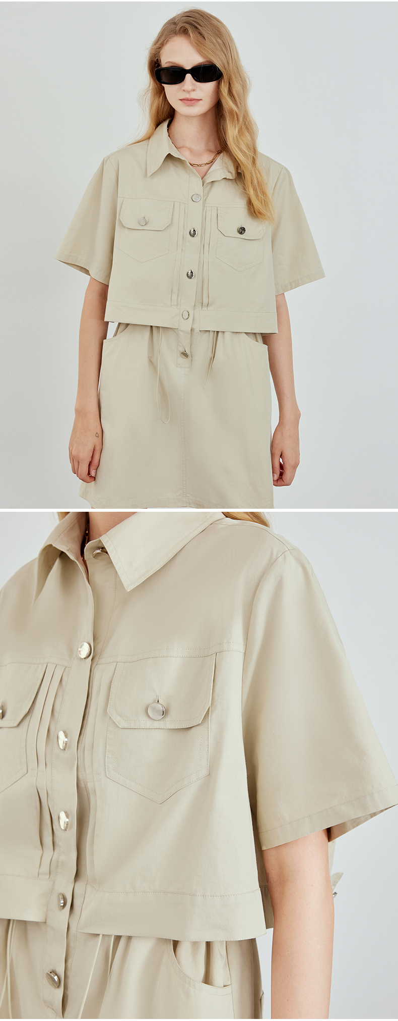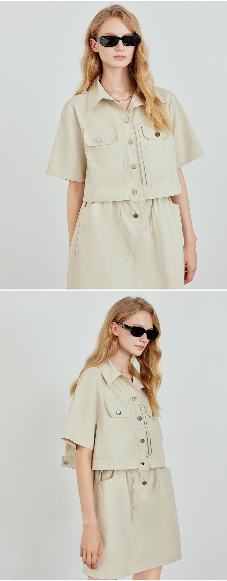 Basic House/百家好假兩件茶歇襯衫連衣裙女2023夏季氣質工裝裙子