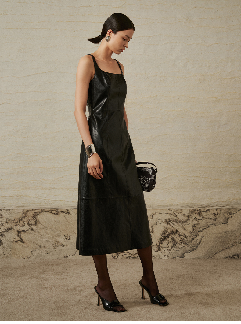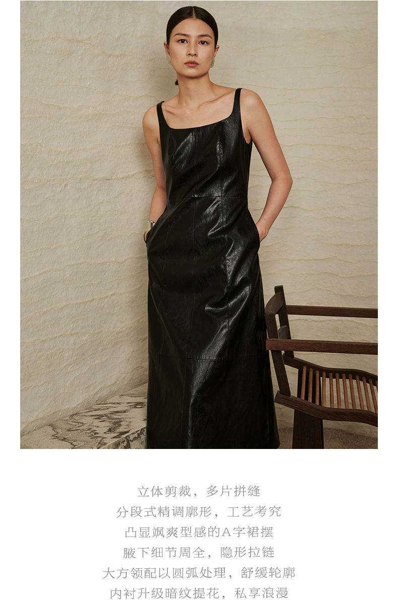 致知ZHIZHI 東鄰妙 吊帶皮裙連衣裙2023秋季新款A字氣質高級黑色