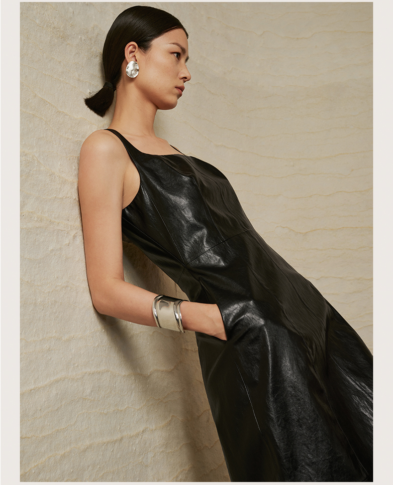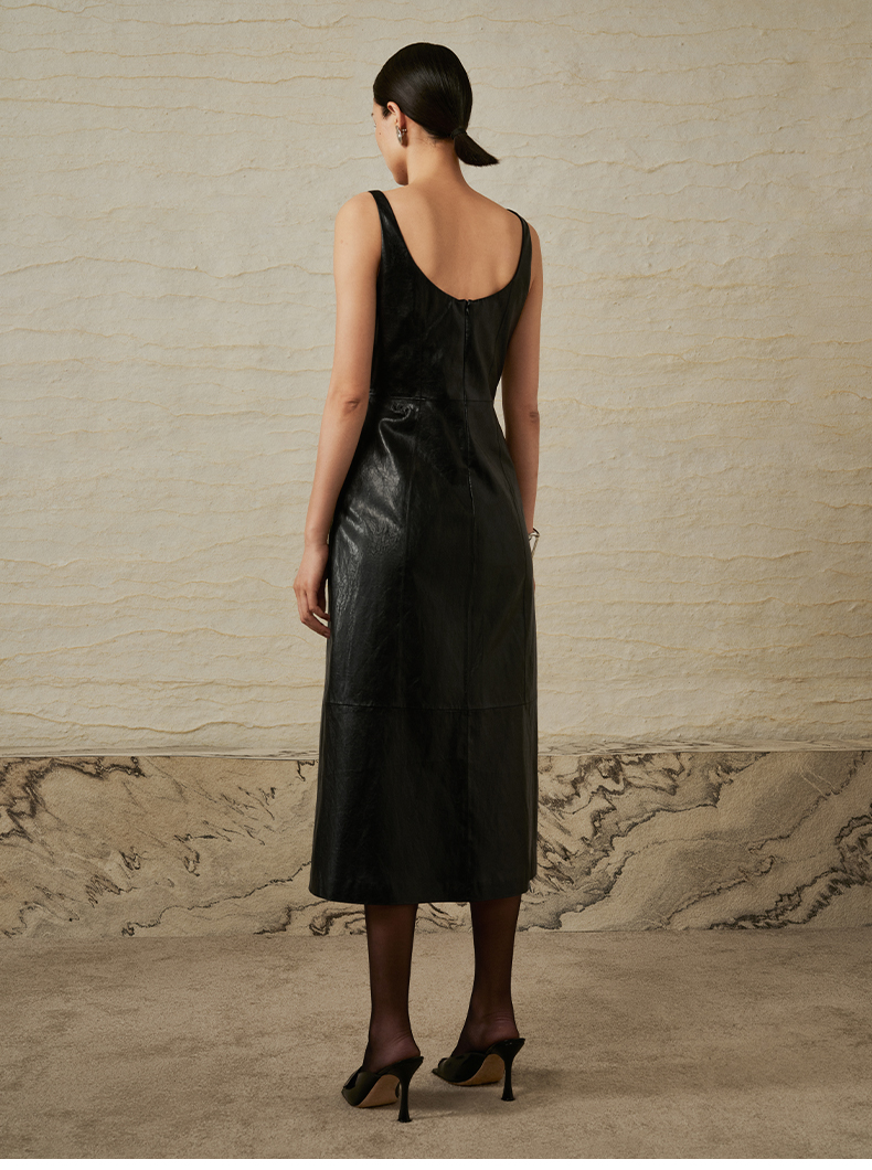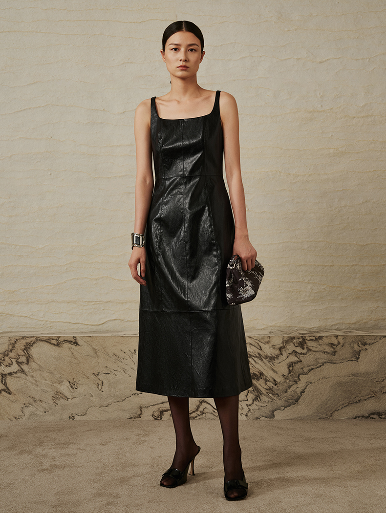 致知ZHIZHI 木蘭花慢 V領背心連衣裙女2023冬季新款氣質高級皮革