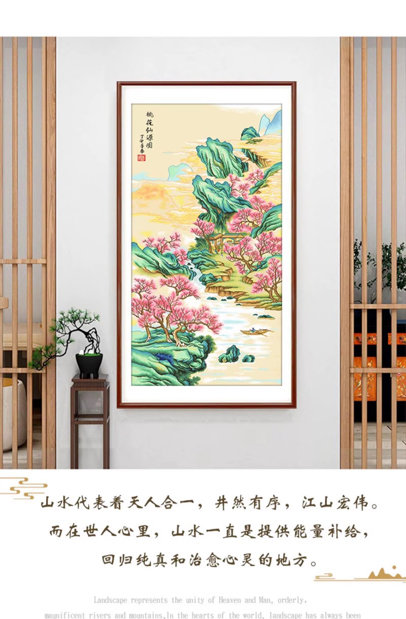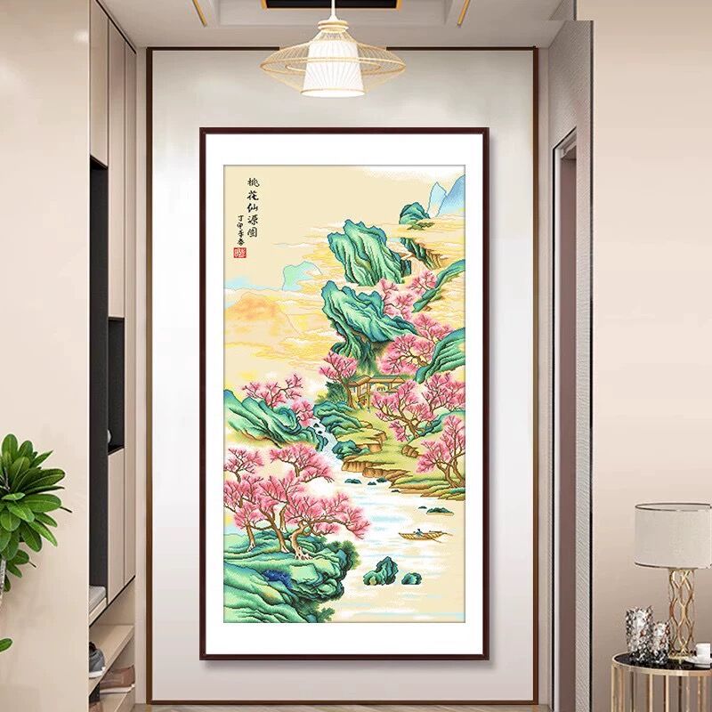 桃花仙源圖十字繡2023新款線繡客廳豎版玄關新中式風景自己繡手工