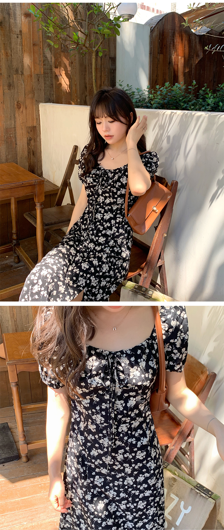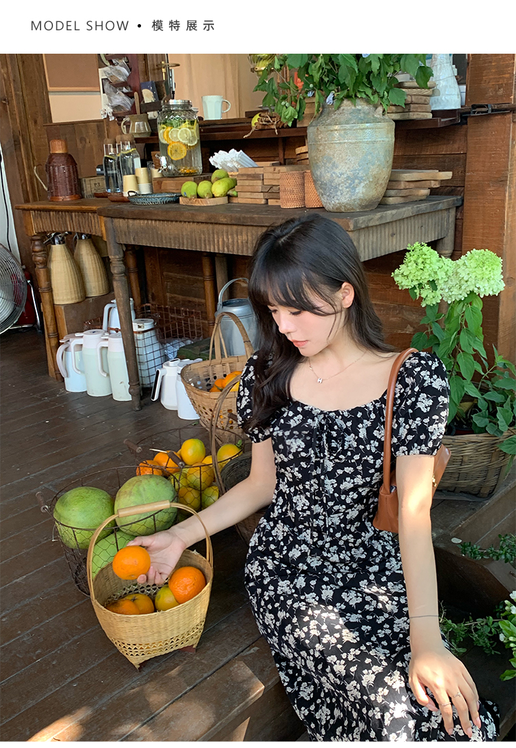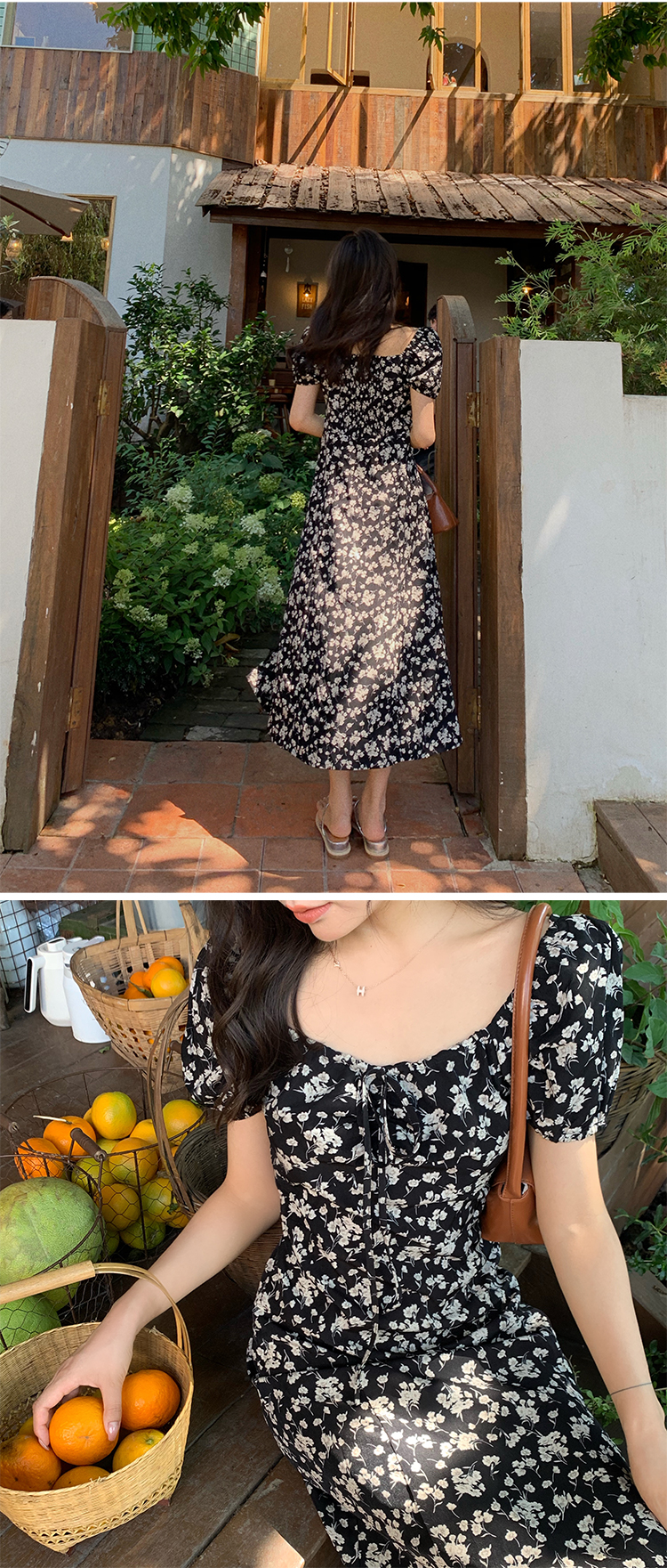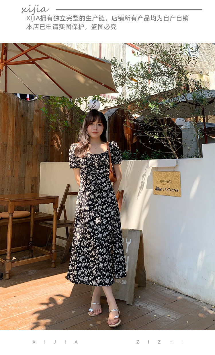 浪漫夜玫瑰 黑色碎花顯瘦泡泡袖裙子女夏季小個子新款韓版連衣裙