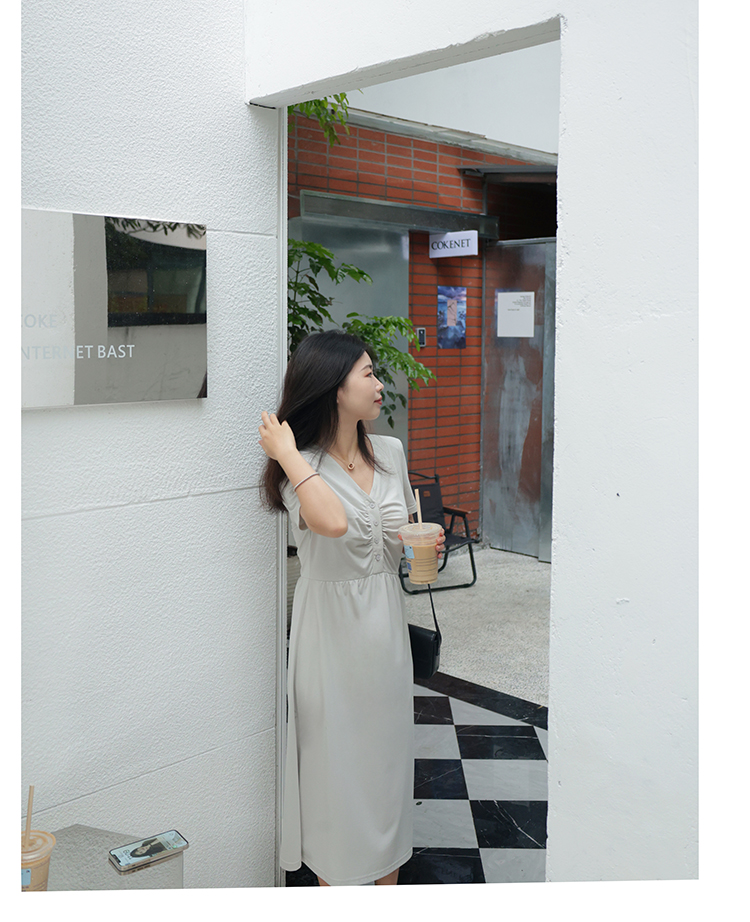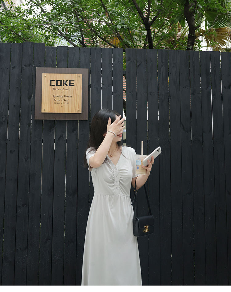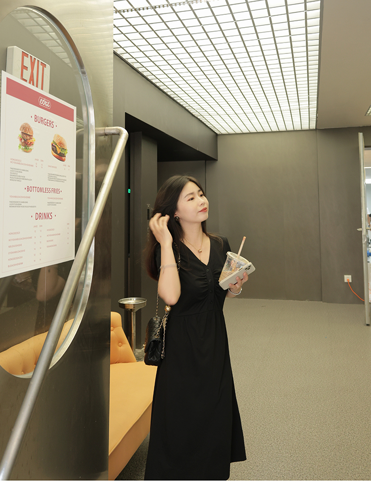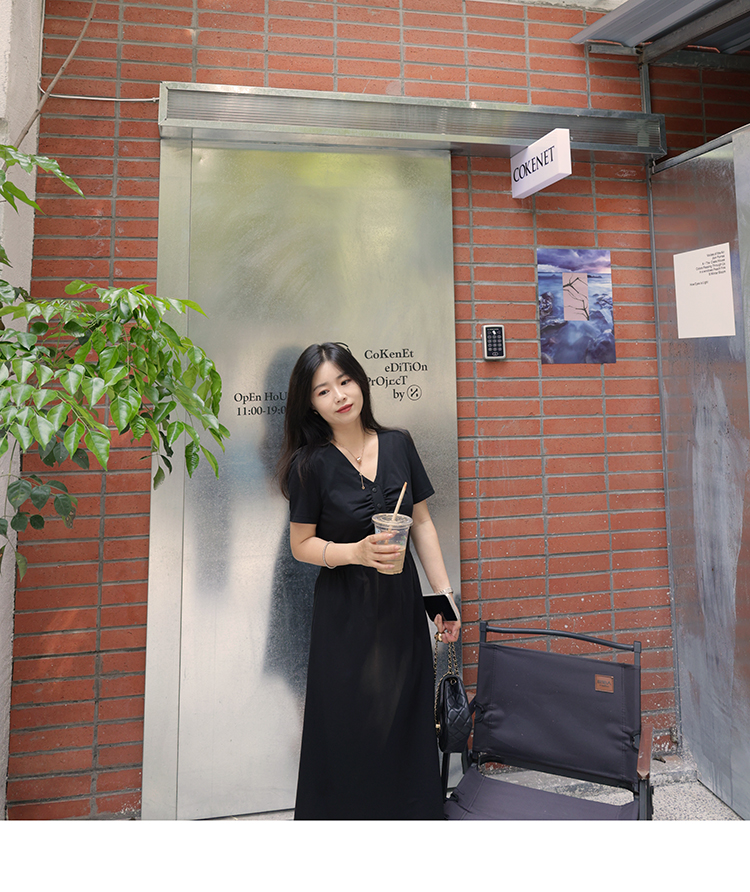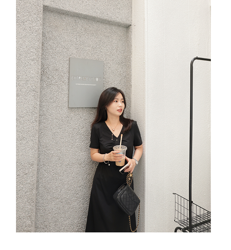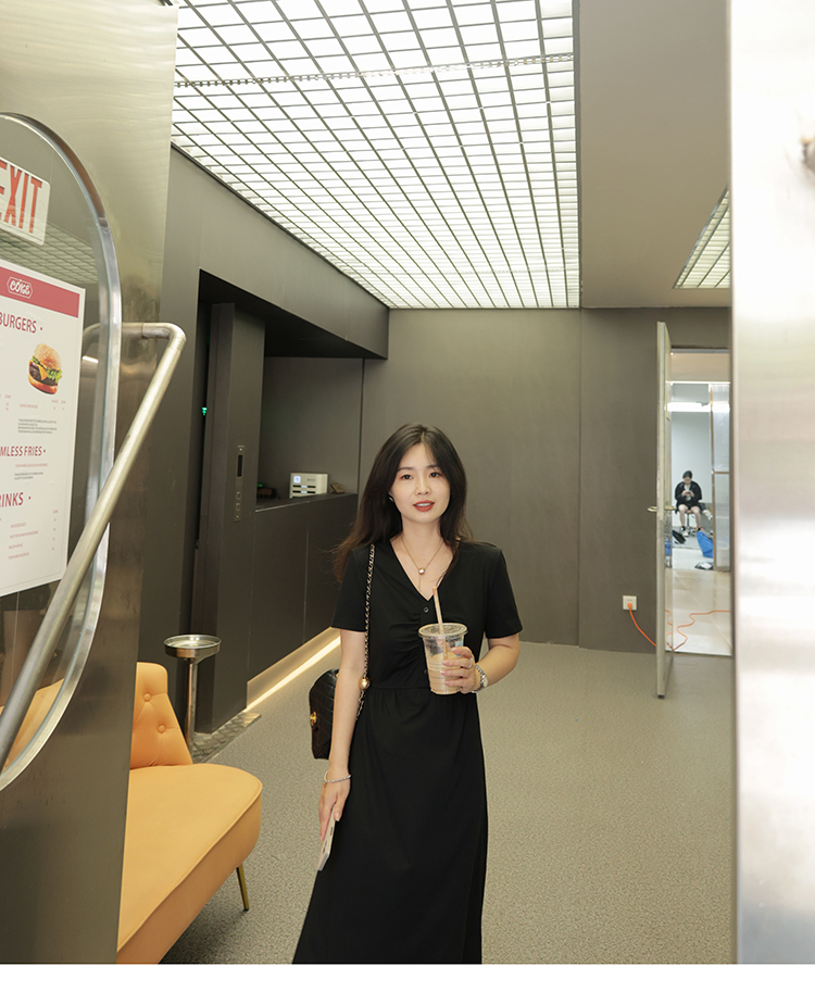 爾爾自制小個子連衣裙V領顯瘦彈力長裙短袖薄款溫柔氣質裙子新款