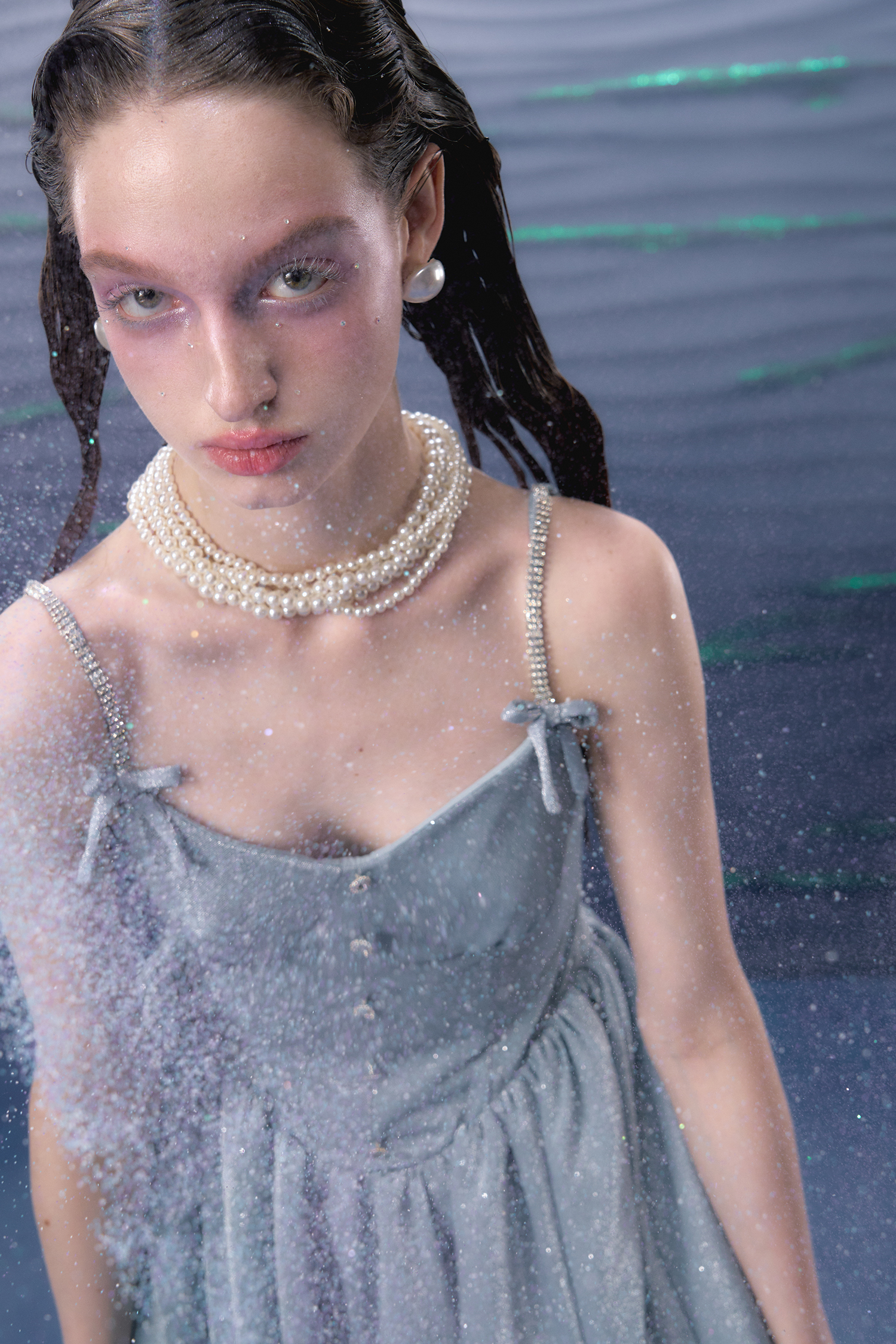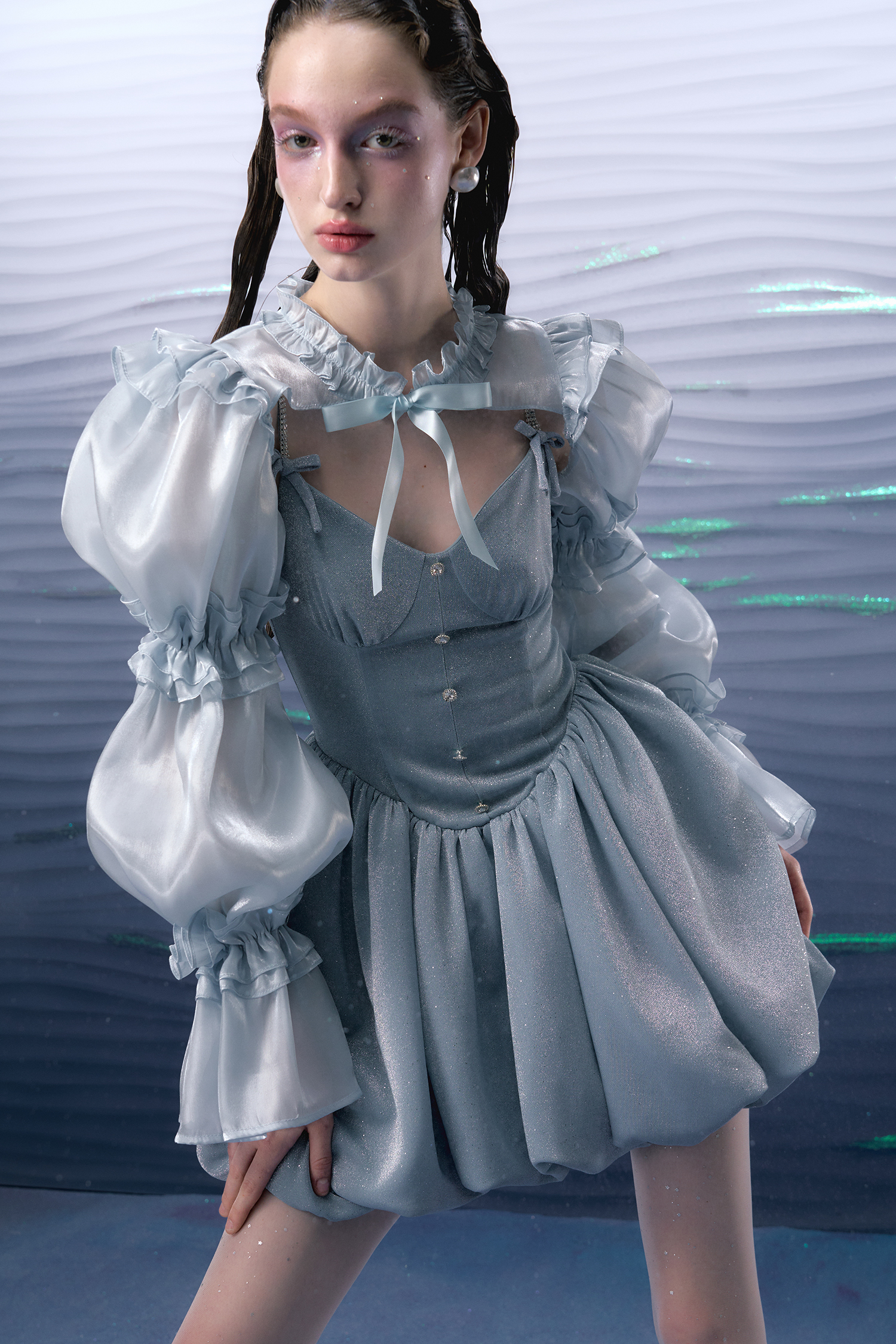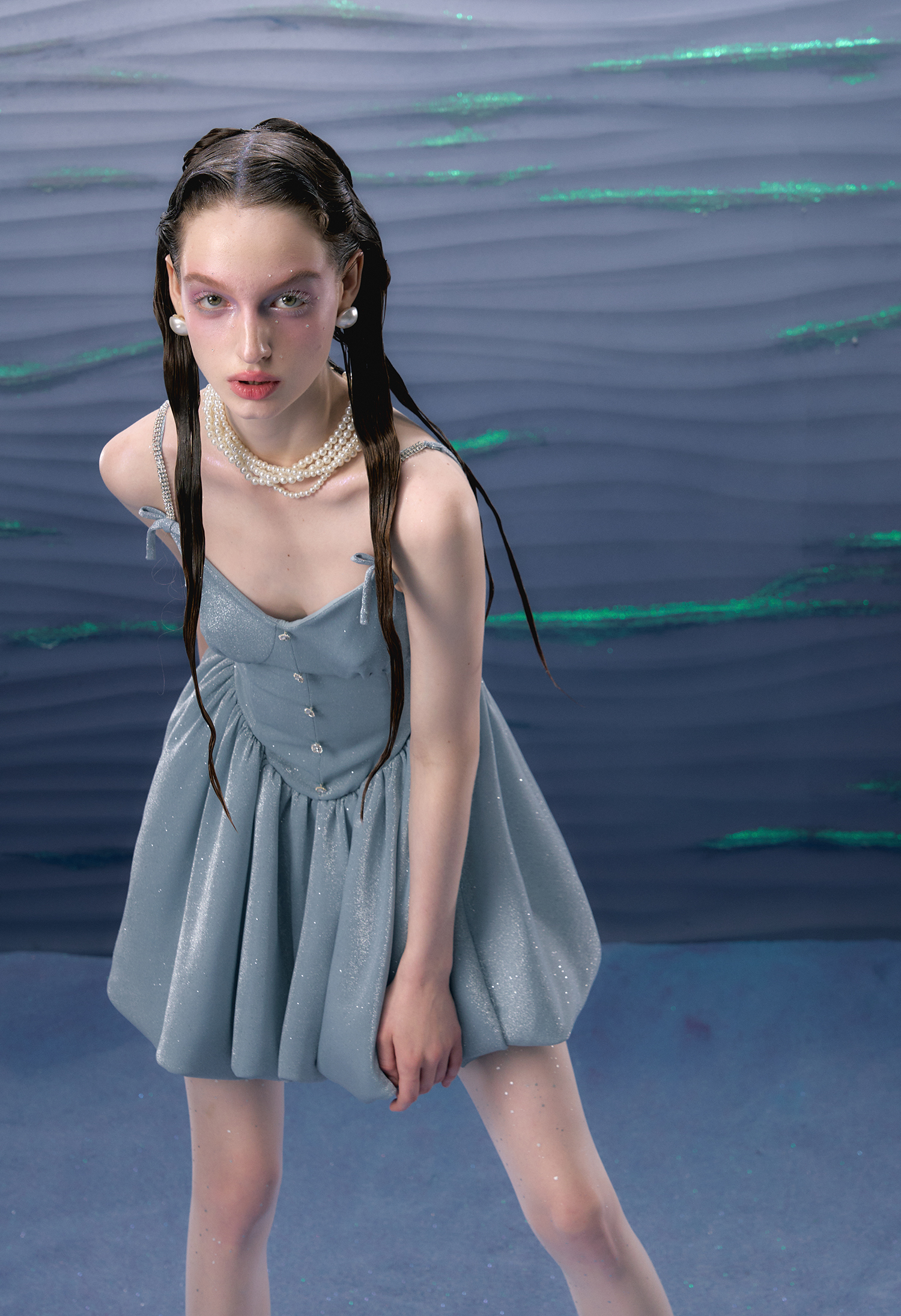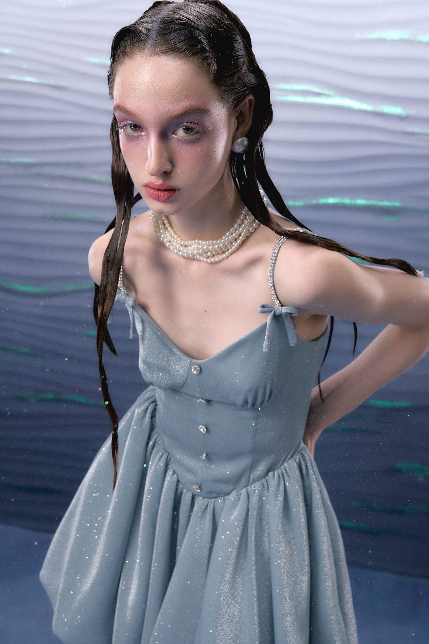 Narrator原創設計藍色細閃水鉆肩帶蝴蝶結裝飾收腰吊帶花苞連衣裙